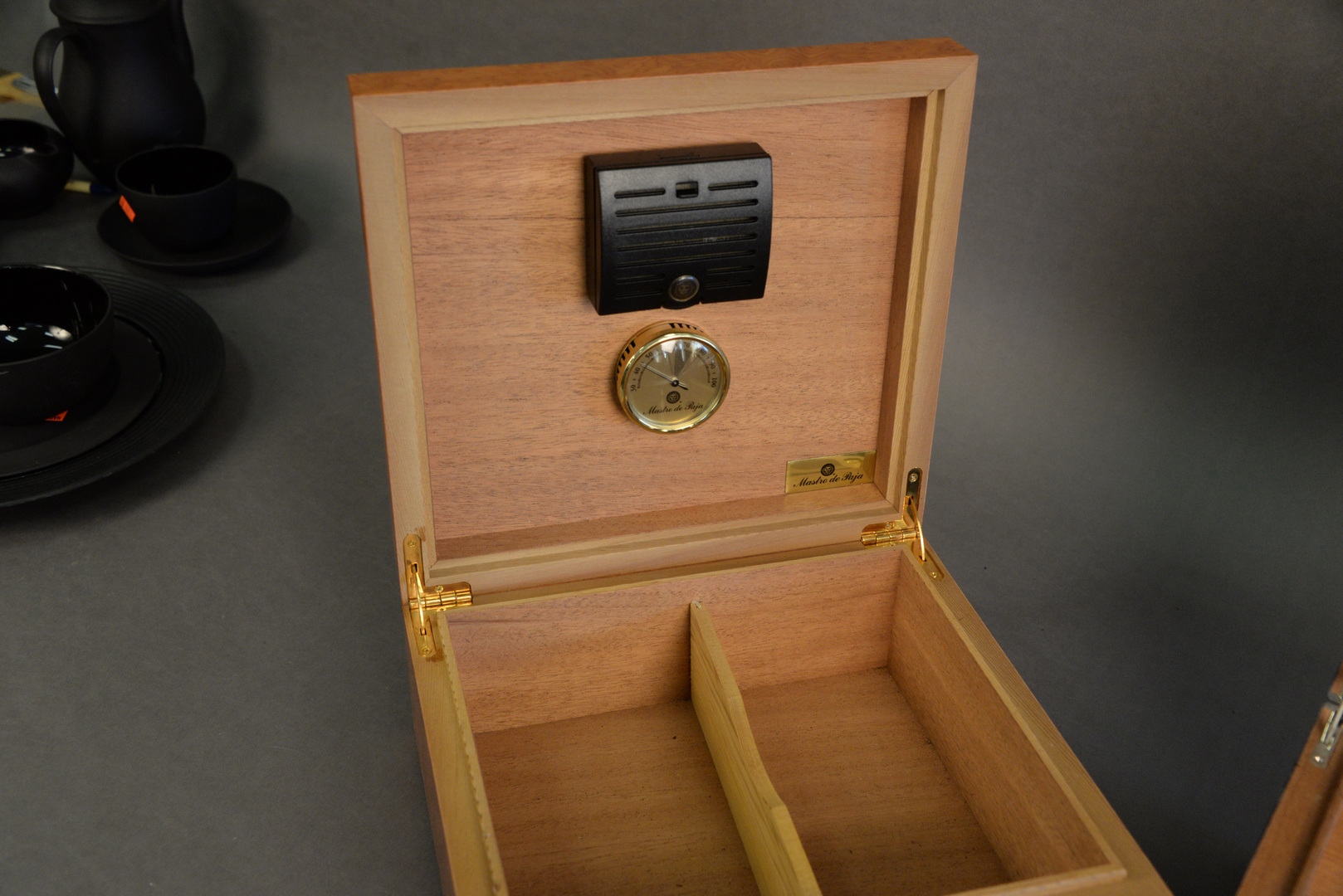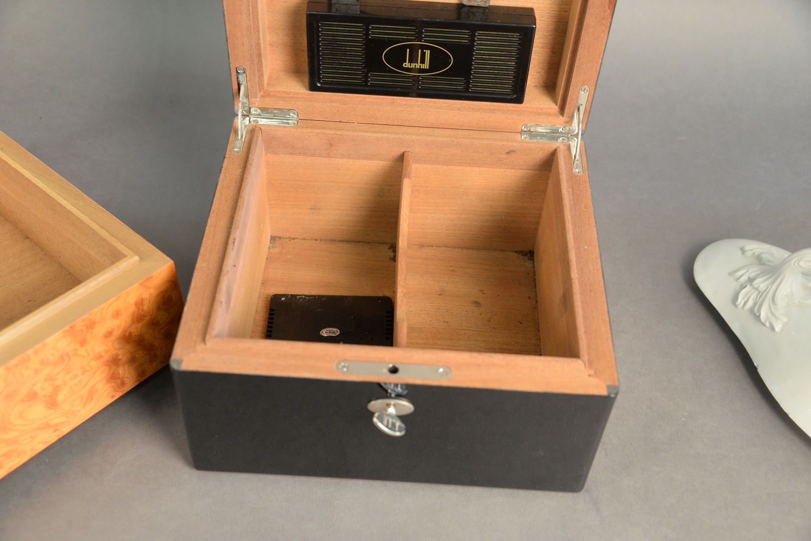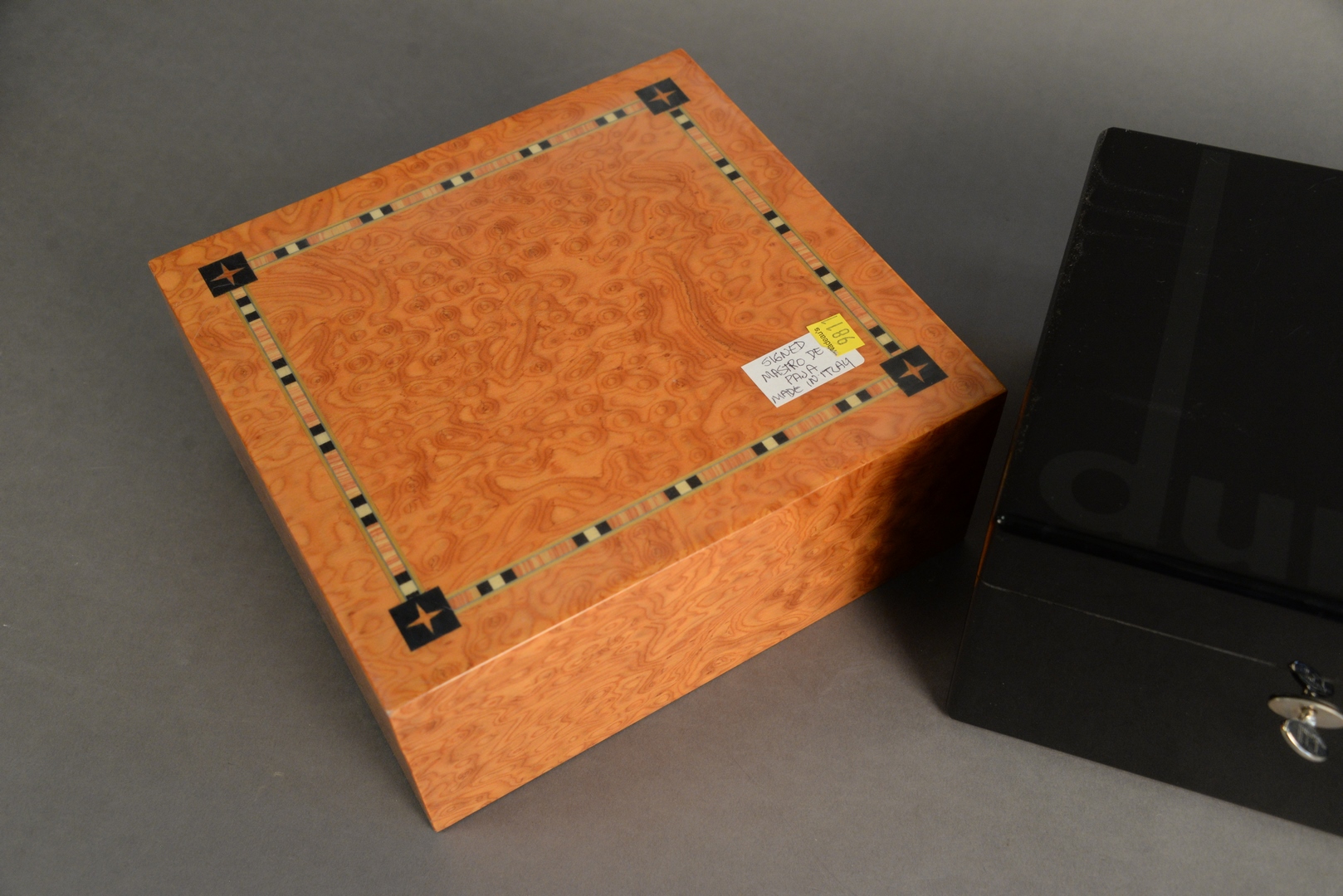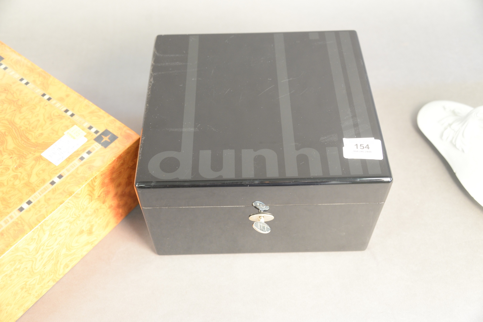 Lot 154: Two Cigar Humidors, black lacquered Dunhill, top 10″ x 9″ x 6″; along with a burlwood by Mastro de Paja, Italy.