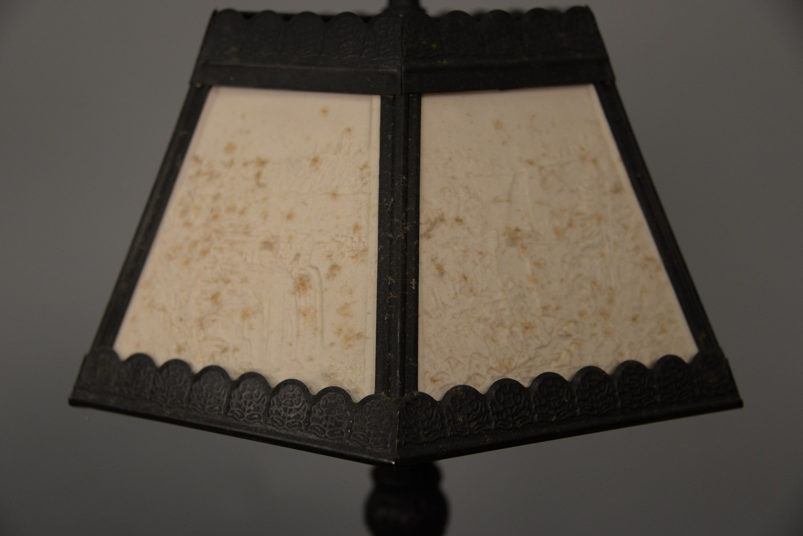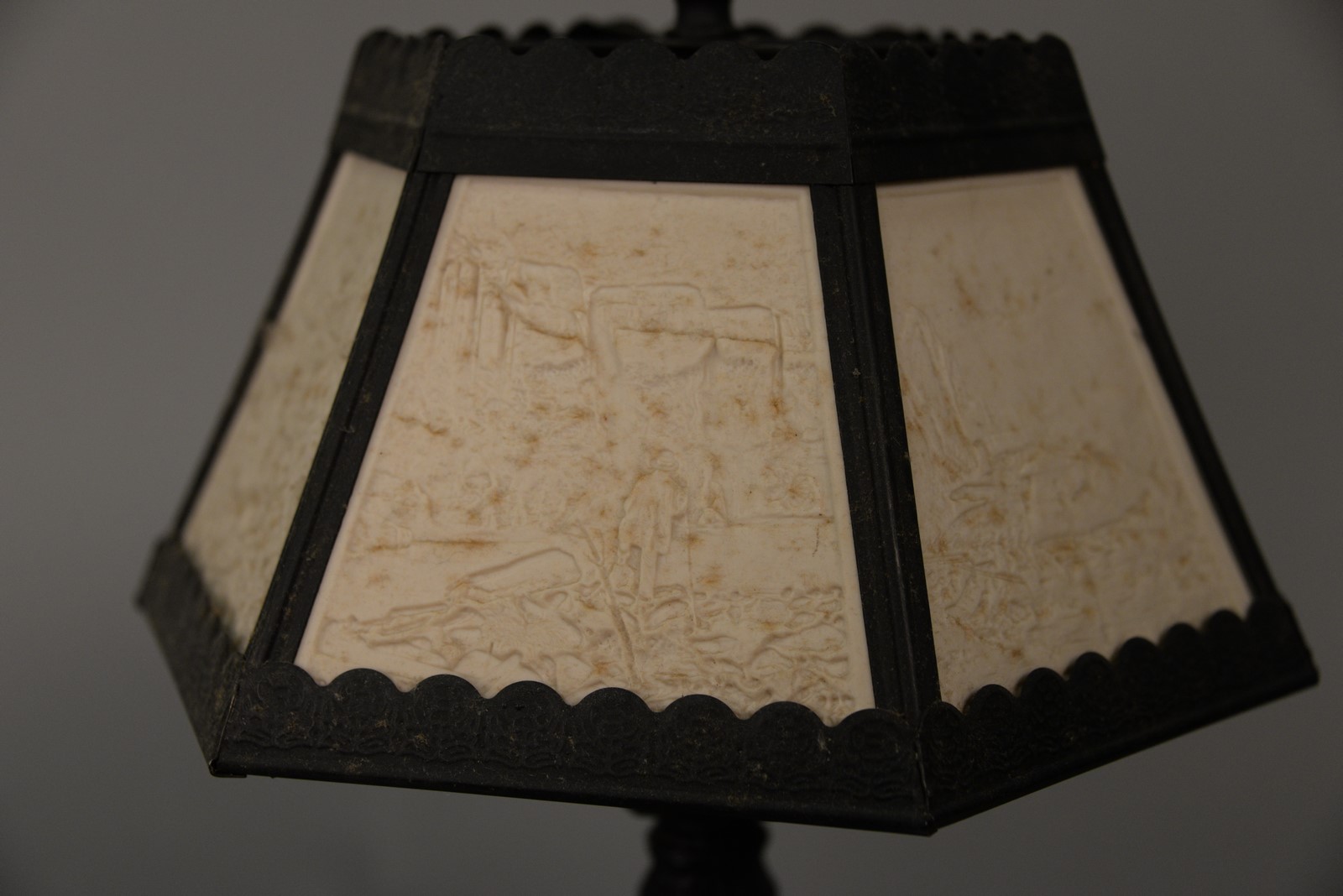 Lot 154: Victorian lithopane boudoir lamp having six molded glass panels depicting landscape scenes.ht. 15 1/2 in. each panel 4 1/2 x 4 …