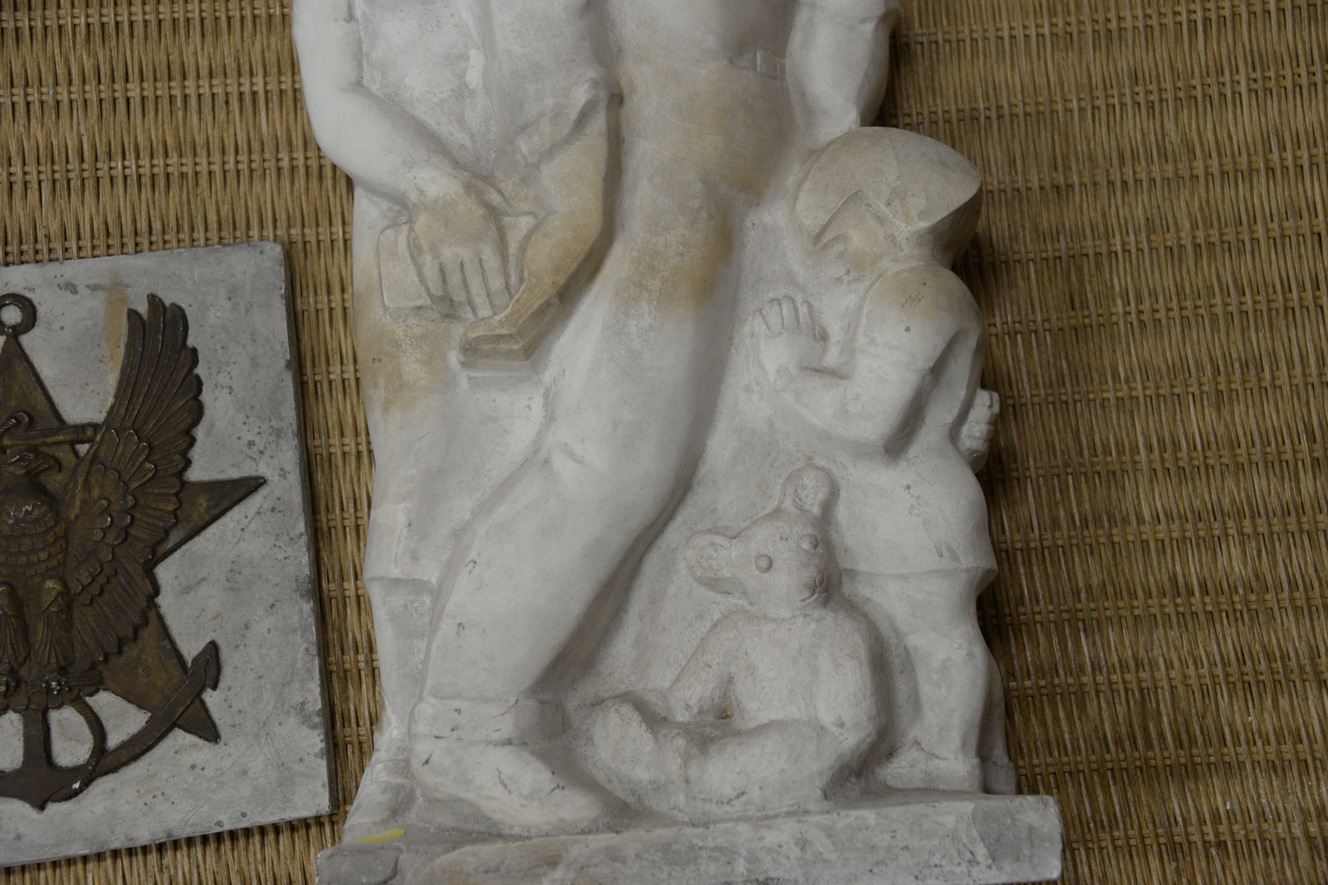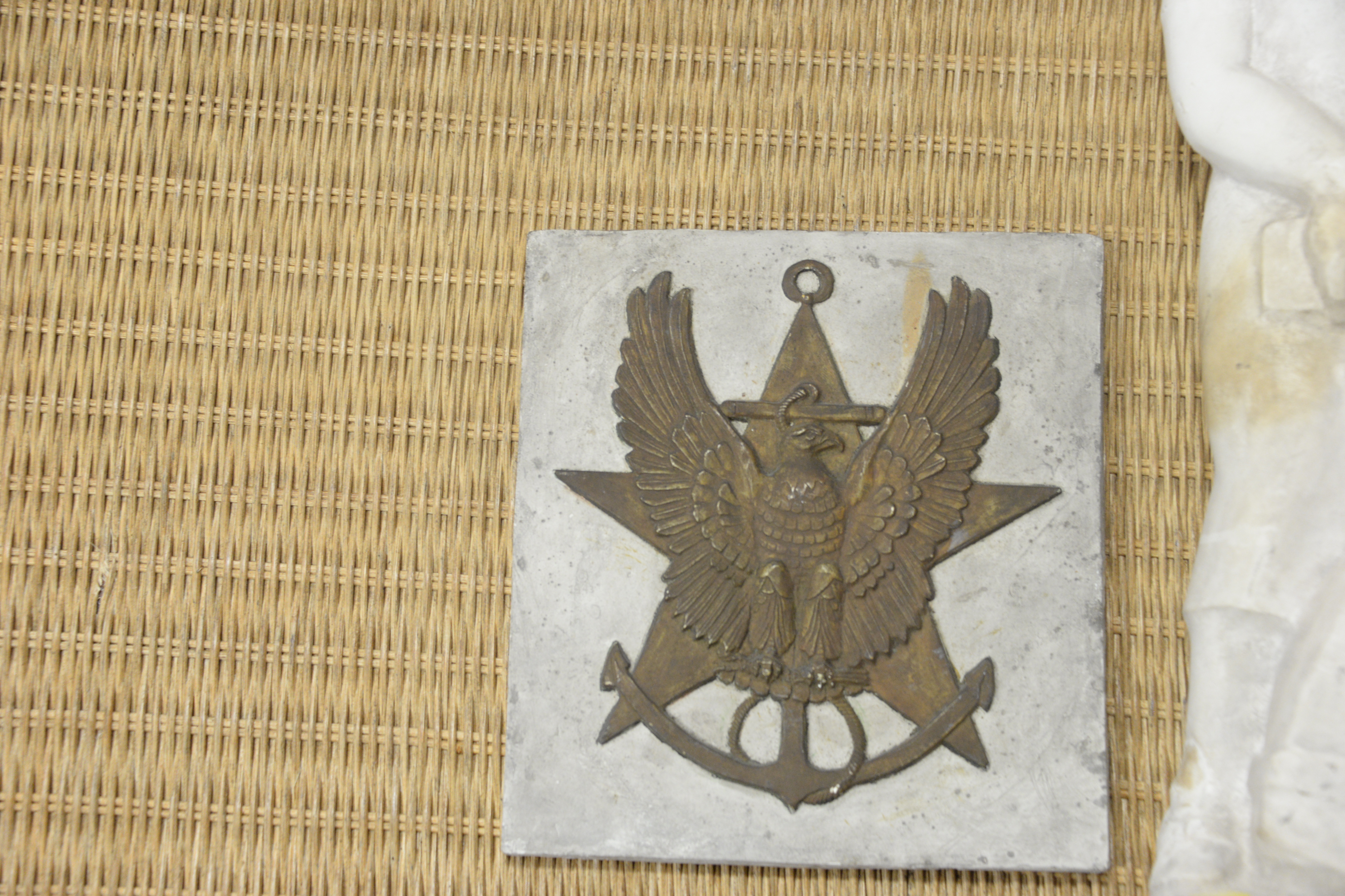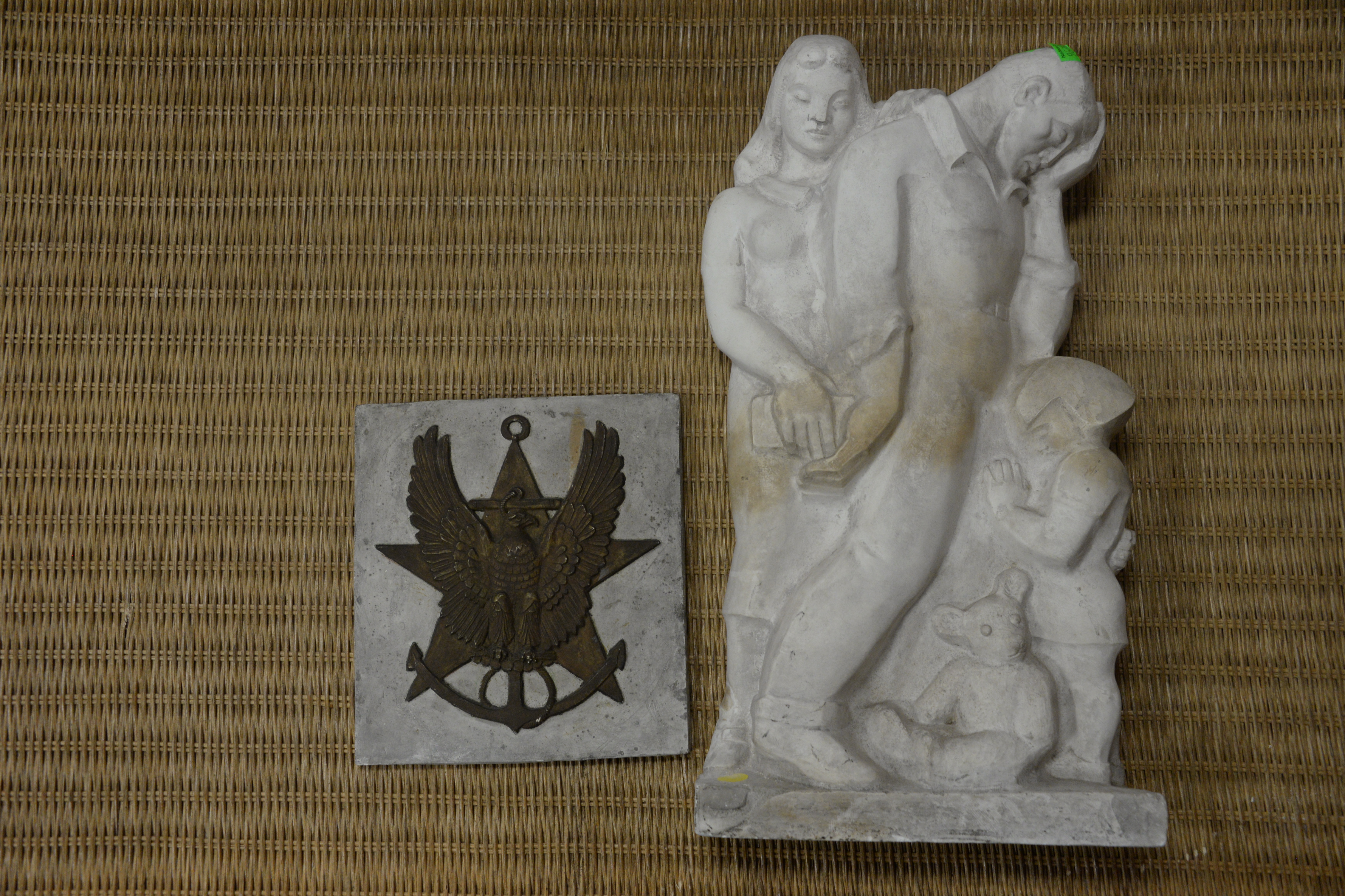 Two Piece Plaster Group to include hanging plaster cast of a grieving family, unsigned along with a square plaque with embossed star, and eagle center height 19 1/2 inches, width 10 3/4 inches Provenance: The Estate of Diana Atwood Johnson