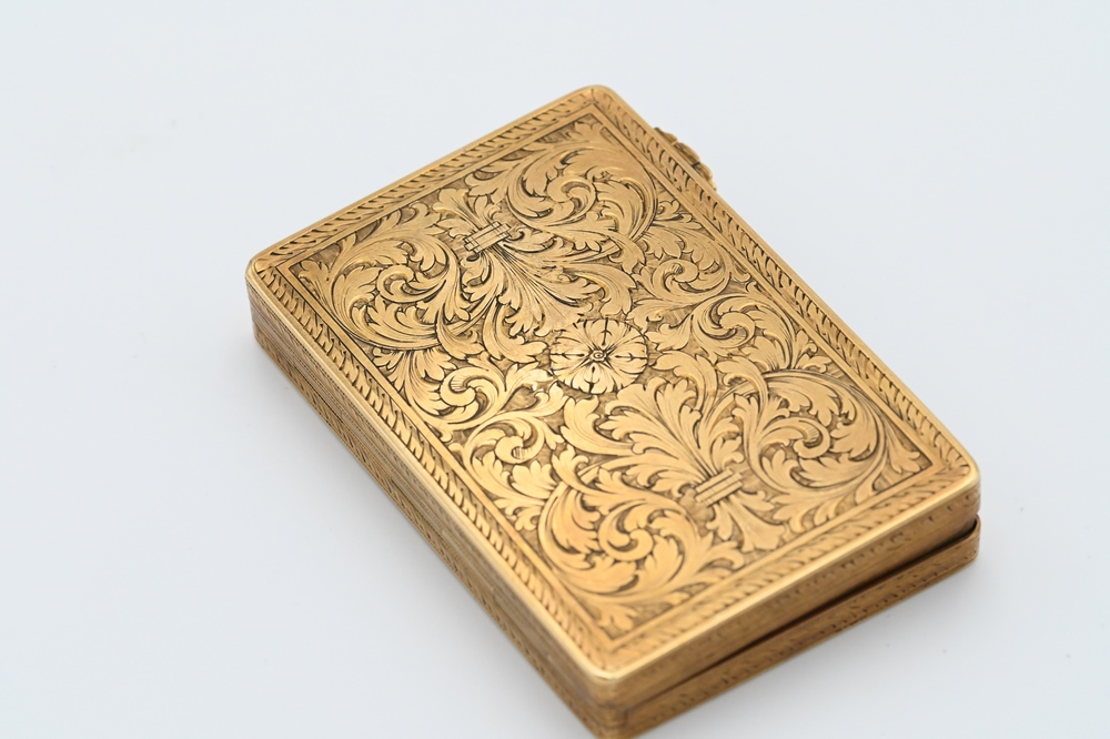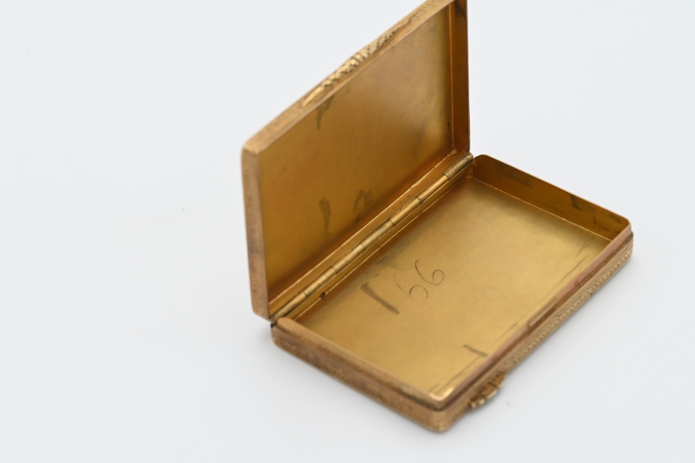 Lot 155: 18 Karat Gold Box, having chased scroll design top and bottom, hinged lid, 2 x 2 7/8 x 3/8 inches, 66 grams.