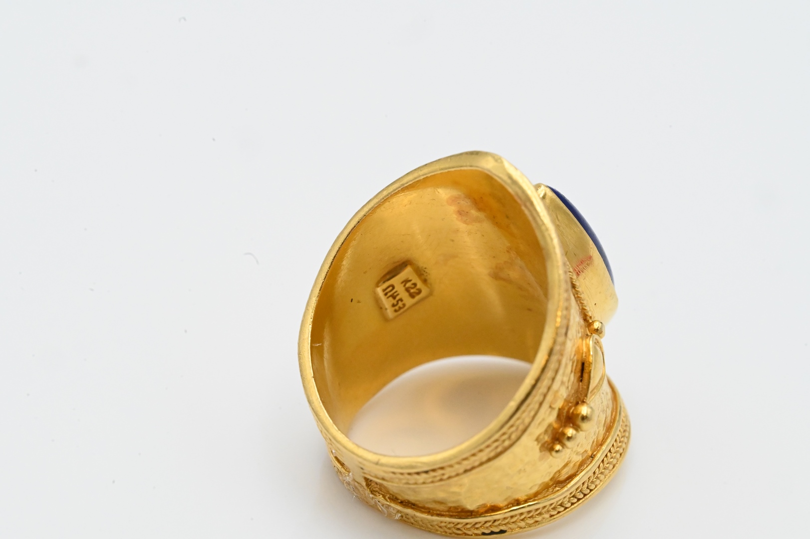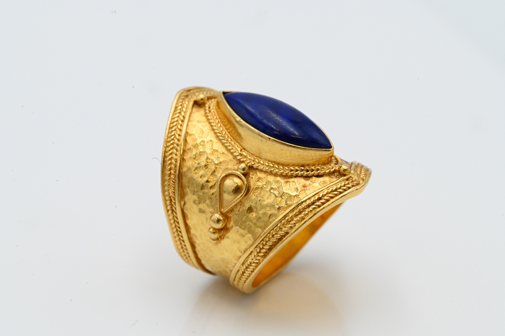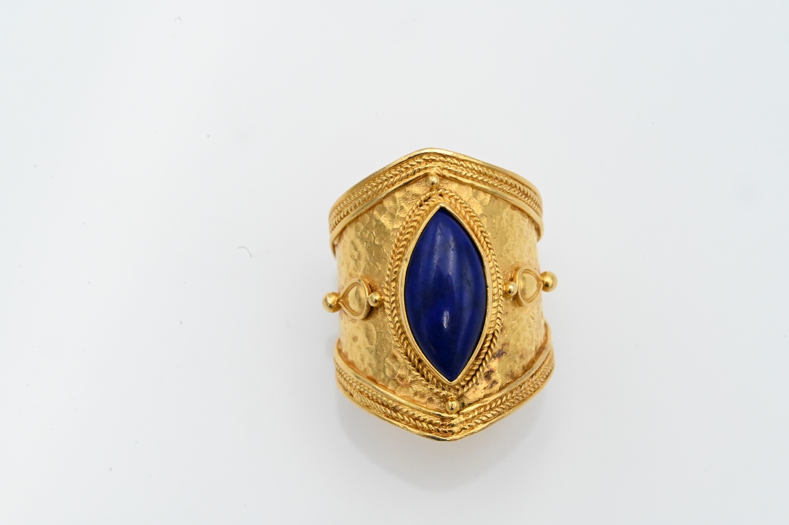 22 Karat Gold Ring set with marquis shape blue stone size 8, total weight 16.9 grams Condition: good condition