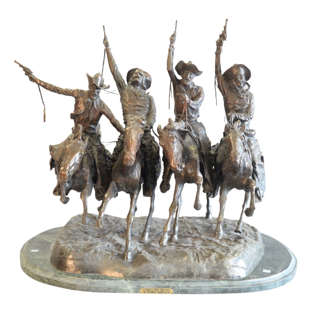 Lot 155: After Frederic Remington American, 1861 – 1909 Coming Through the Rye bronze with brown patina inscribed on base ‘Frederic Remingt…