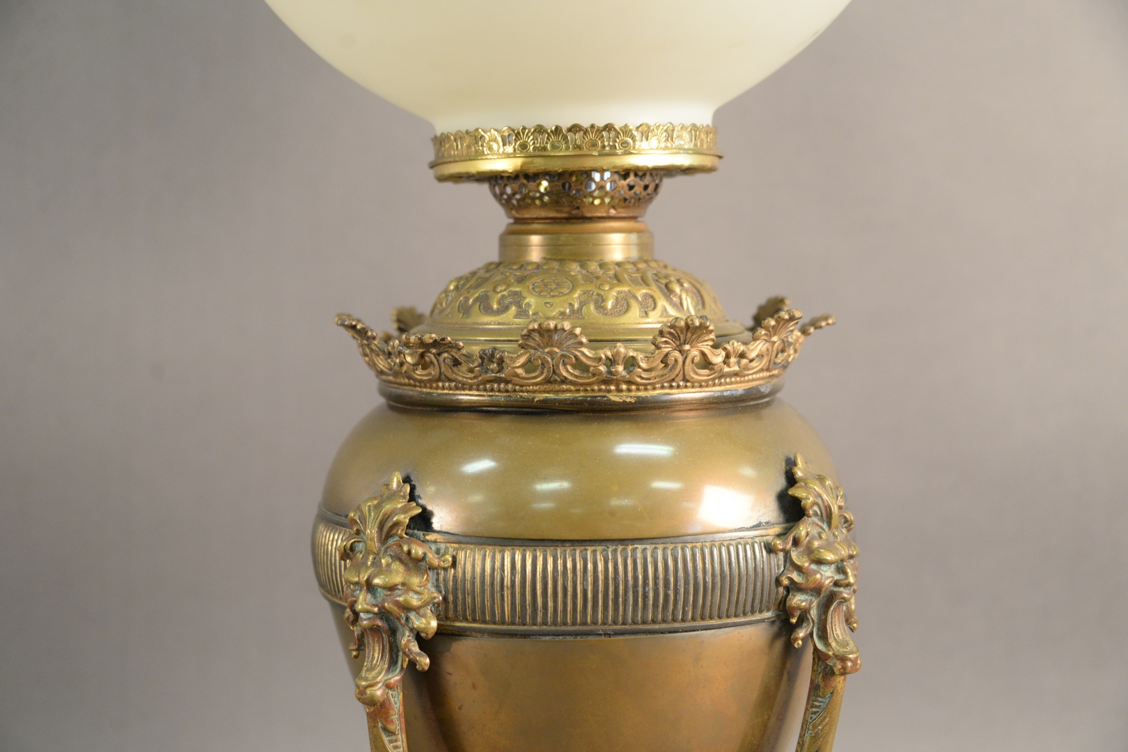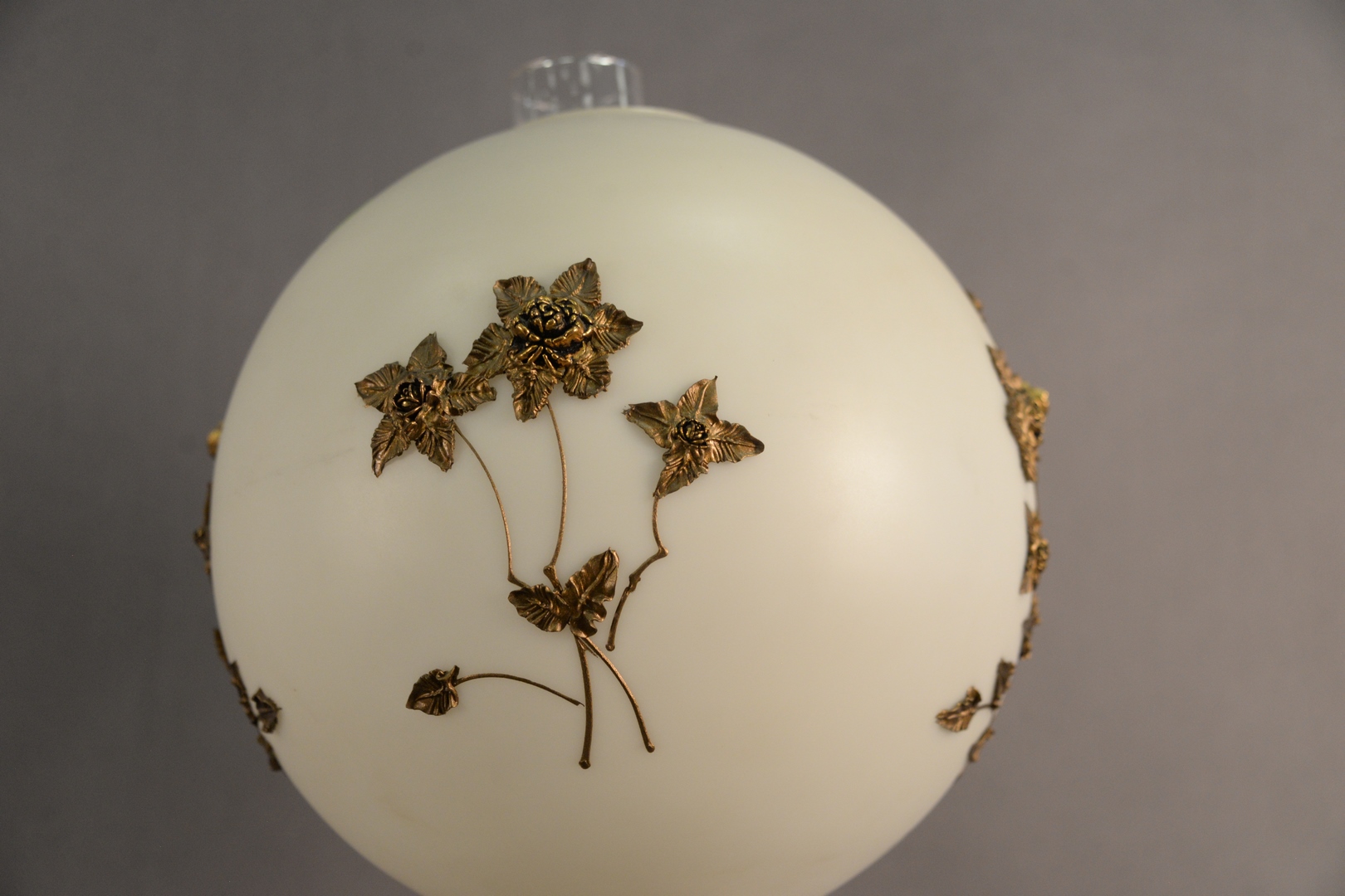 Brass Lamp Having Globular Glass Shade, with brass mounted flowers and raised on four legs ending in hoof feet, overall height 29 inches. Provenance: Estate of James Wadhams.
