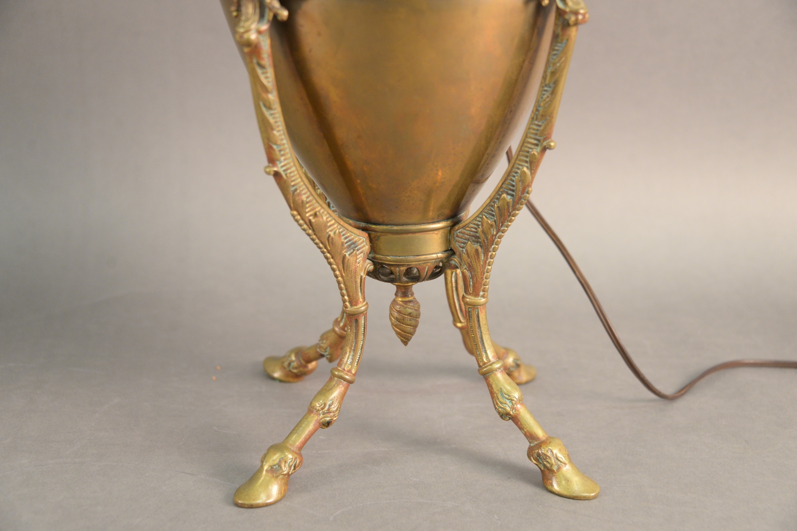 Lot 155: Brass Lamp Having Globular Glass Shade, with brass mounted flowers and raised on four legs ending in hoof feet, overall height 29 inches. Provenance: Estate of James Wadhams.