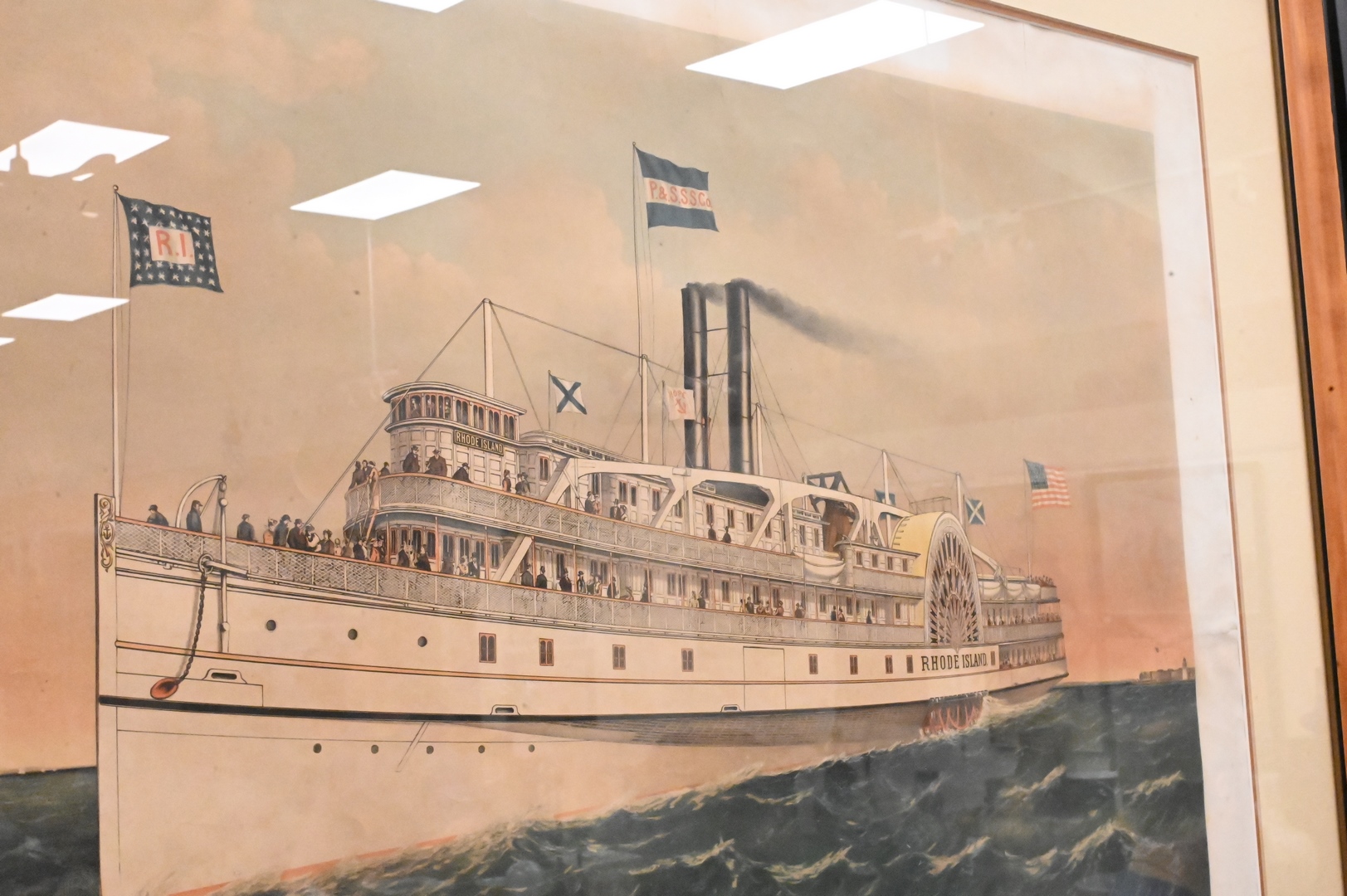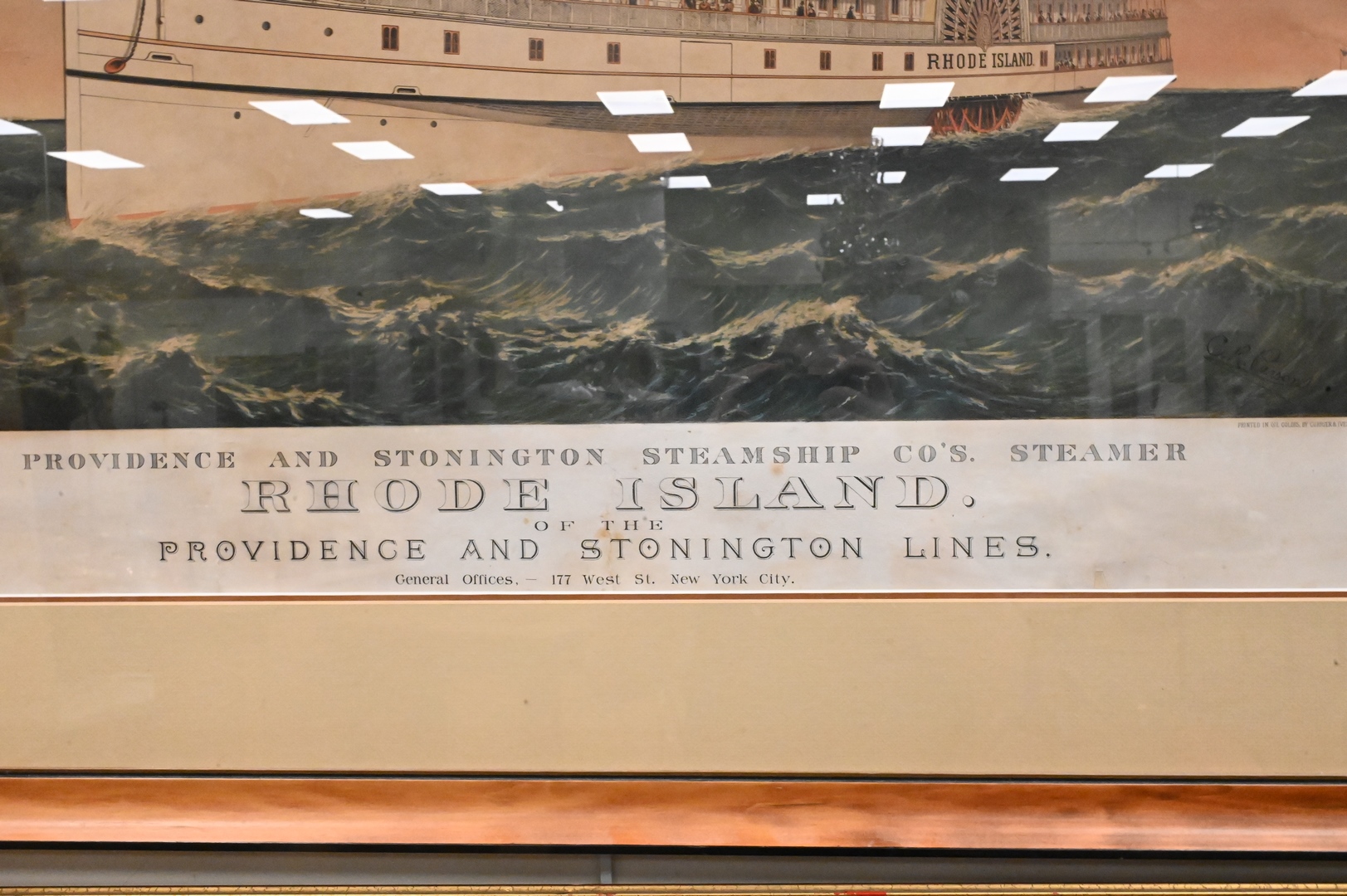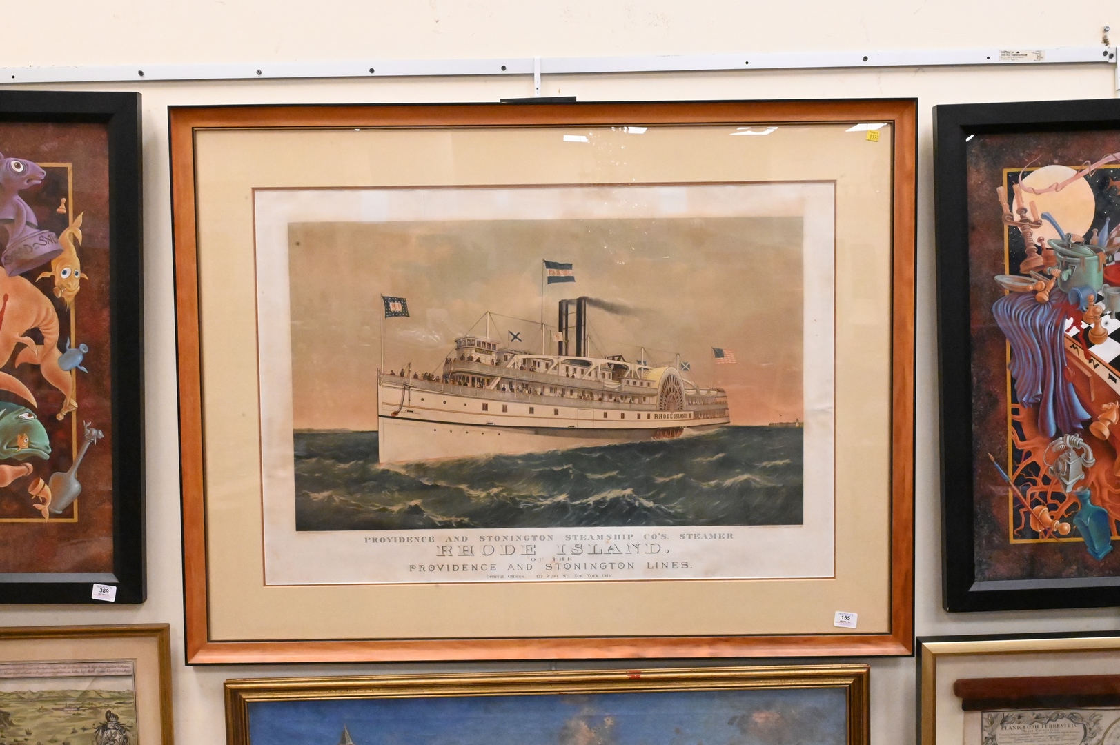 Currier & Ives Lithograph, Providence and Stonington Steamship Co’s Steamer, Rhode Island of the Providence and Stonington Lines, drawn by Charles Parsons, sight size 26″ x 37 1/2″.