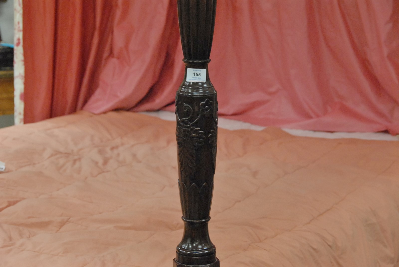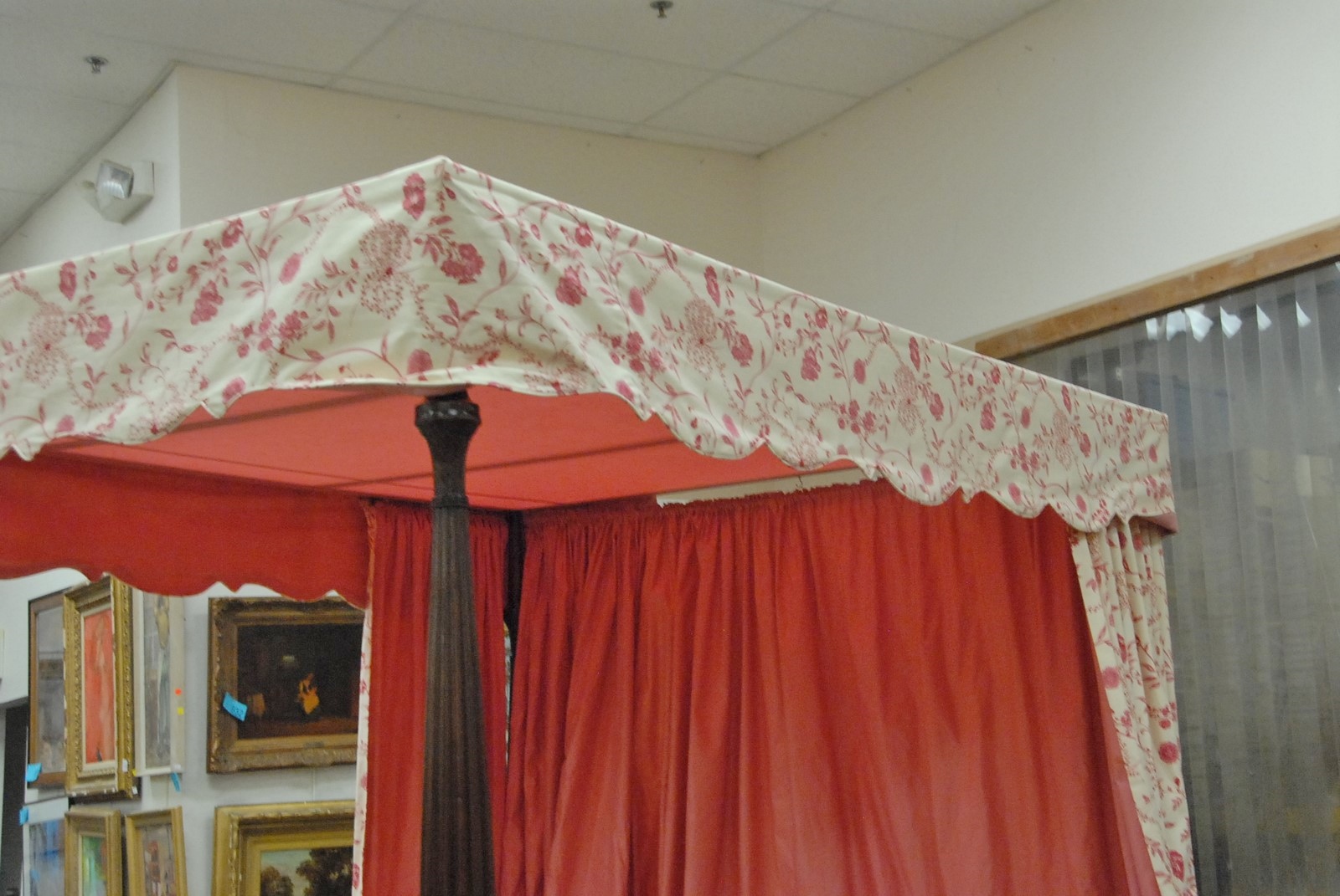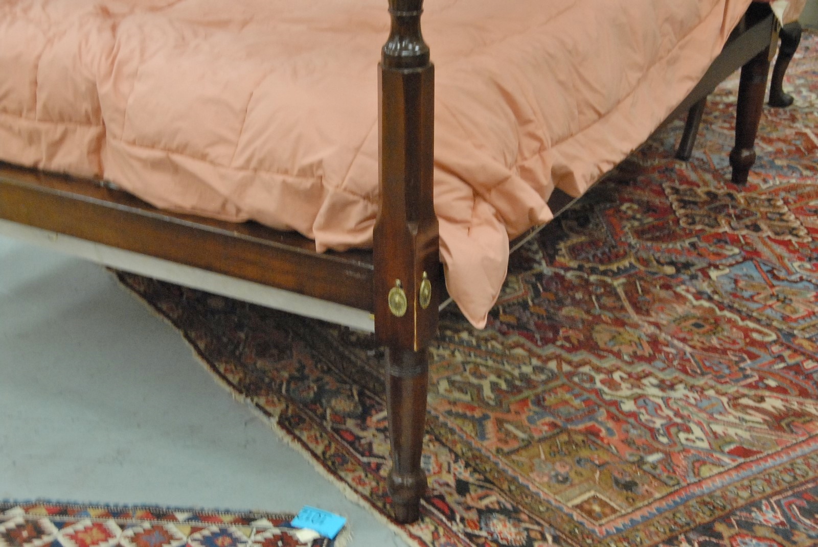 Lot 155: Custom Queen size canopy four post bed having flat canopy top over fluted and carved posts, bed frame only. ht. 93 in. lg. 87 in. wd. 68 in. Provenance: From a Private Collection sold for the Benefit of the Virginia Historical Society.