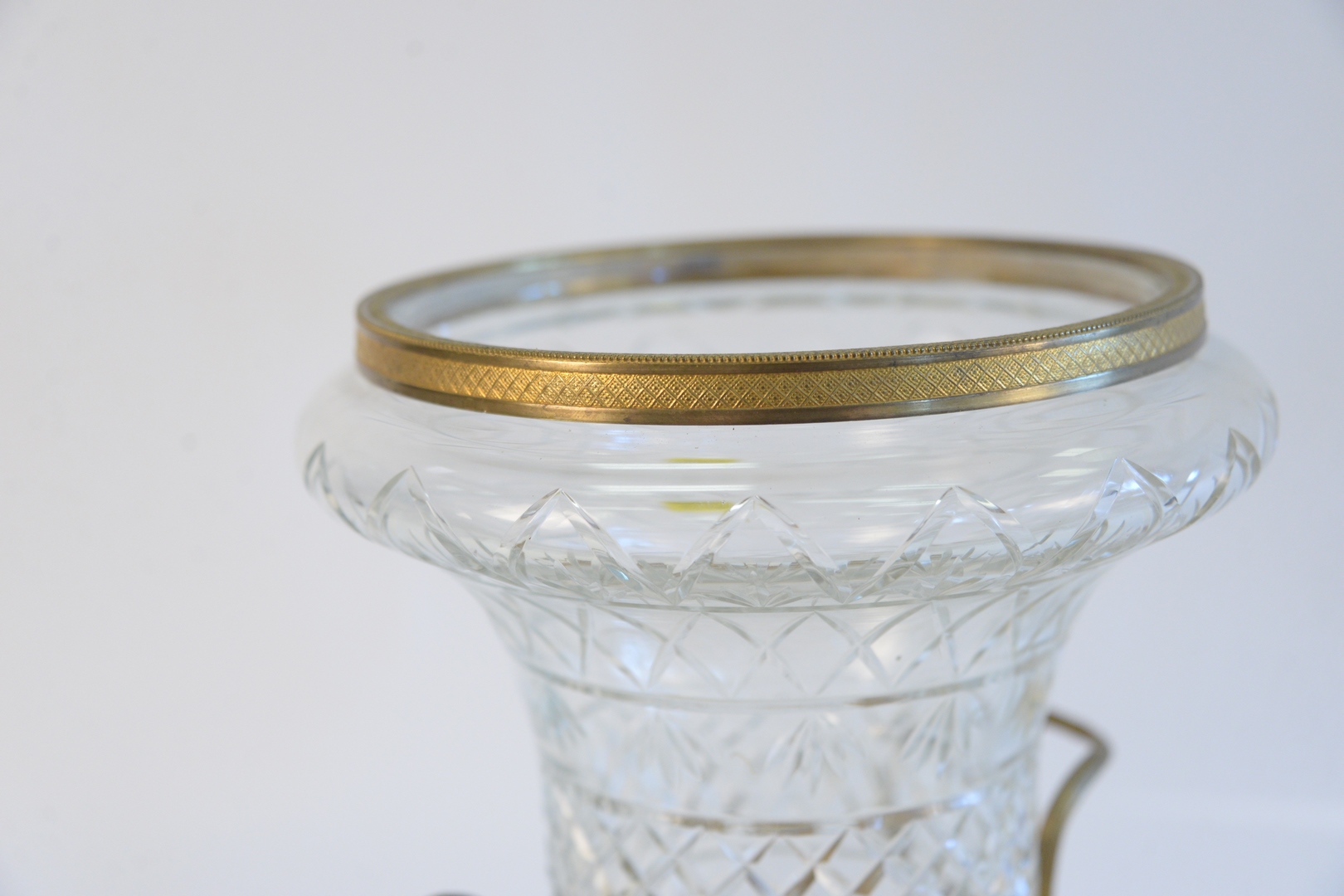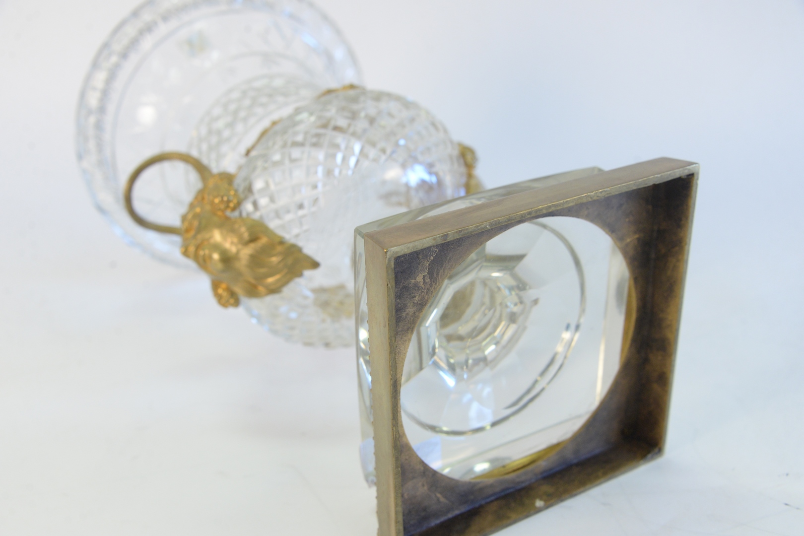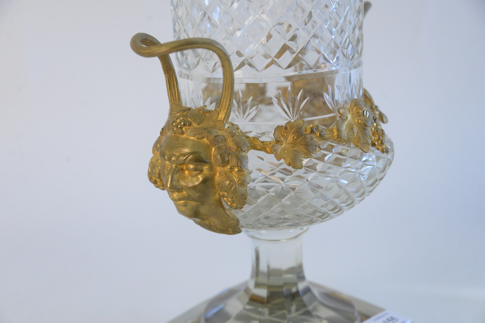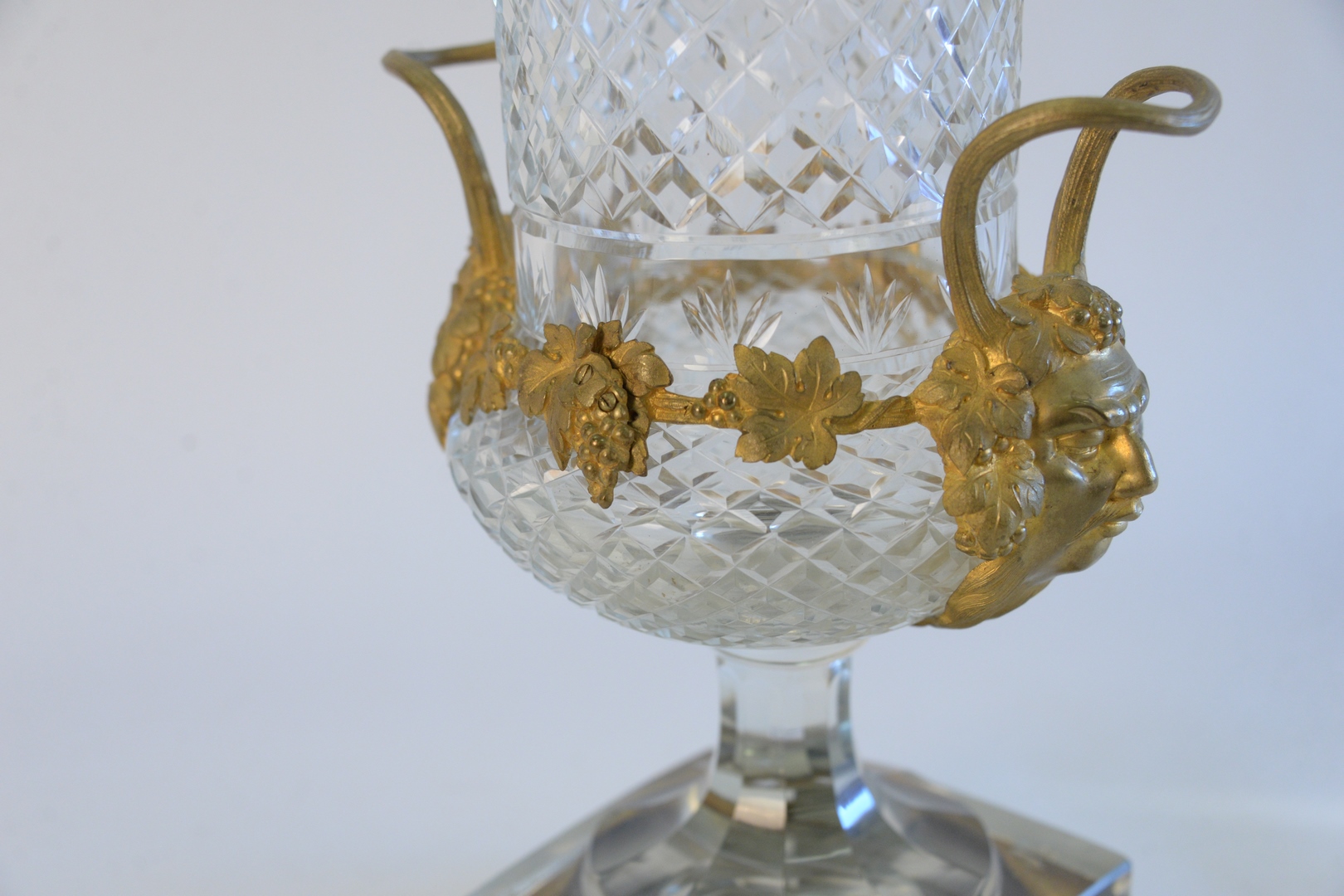Lot 155: French Crystal and Gilt Bronze Urn, having handles with face masks on square, gilt, bronze base, height 16 inches.