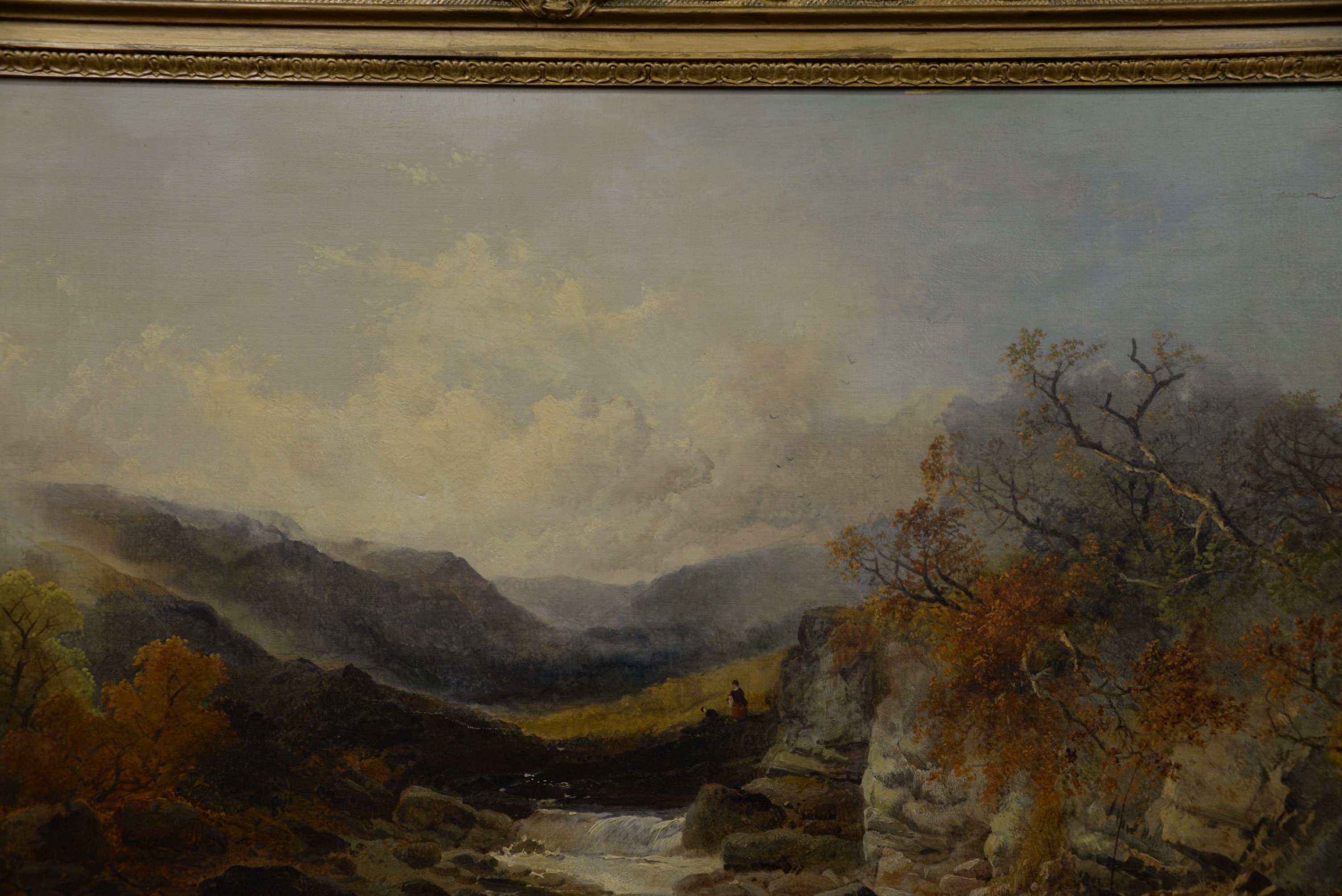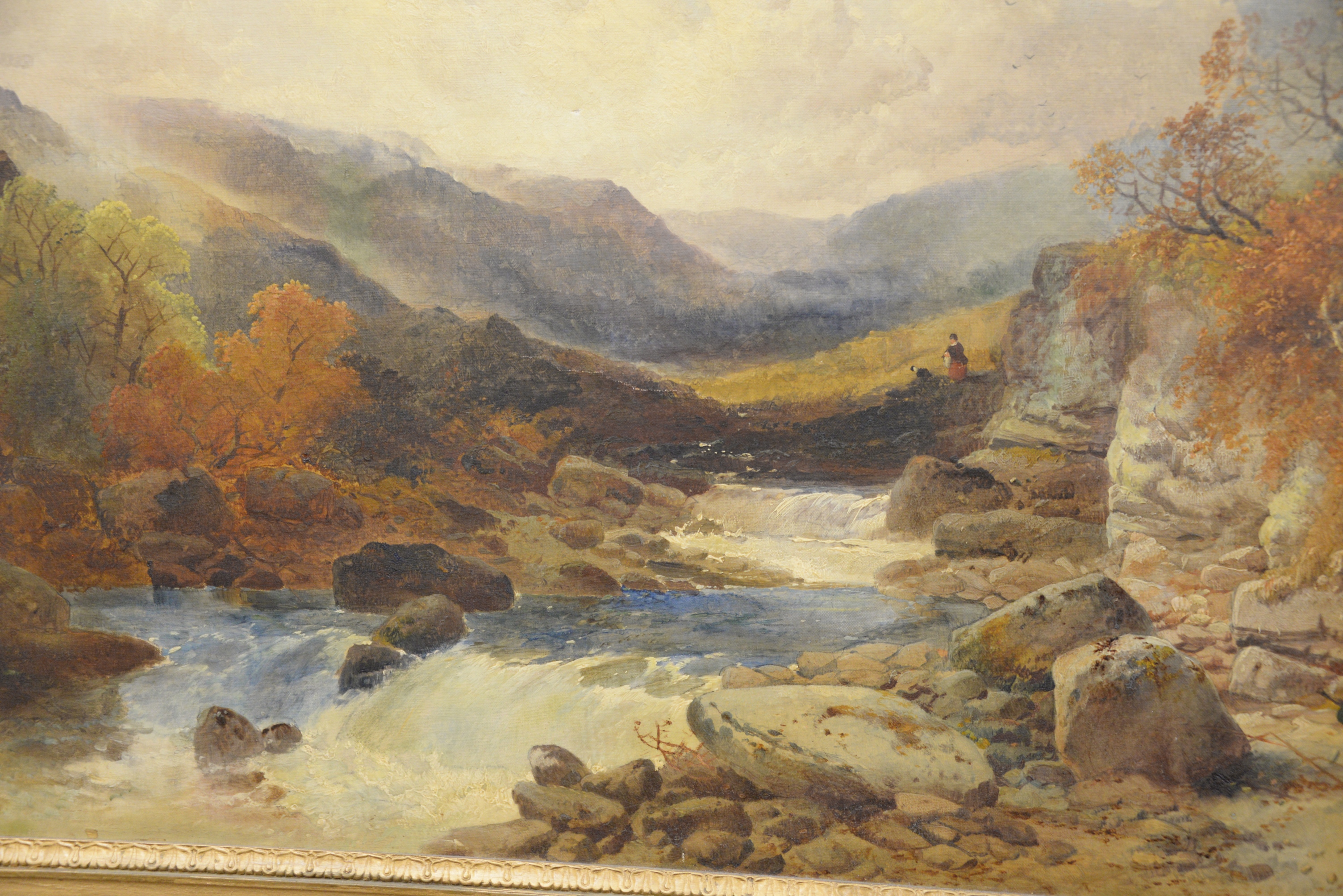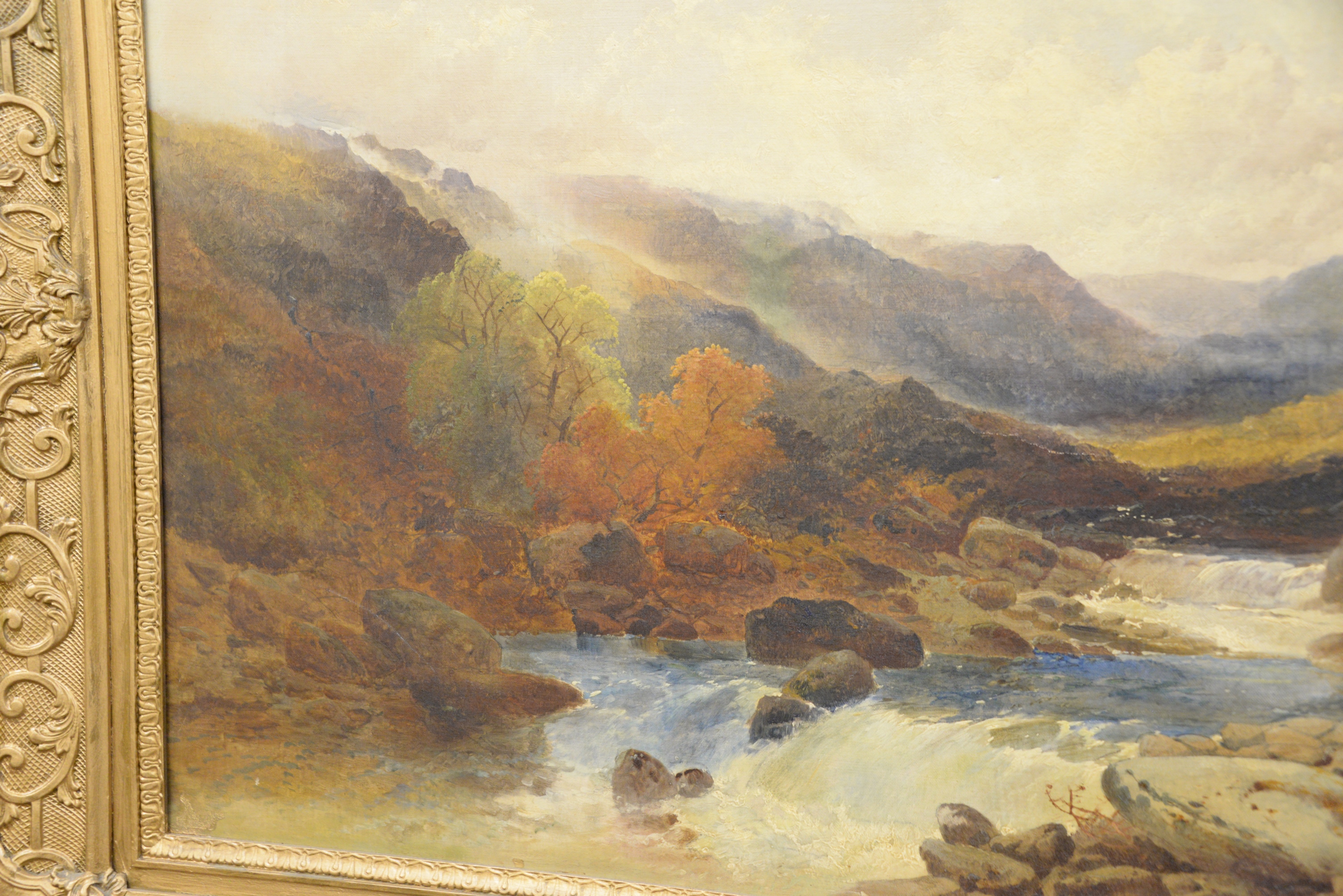 Hudson River School Style “Autumn Stream” oil on canvas 19th century, unknown artist, illegible signature lower right, 23 1/2″ x 41 1/2″.
