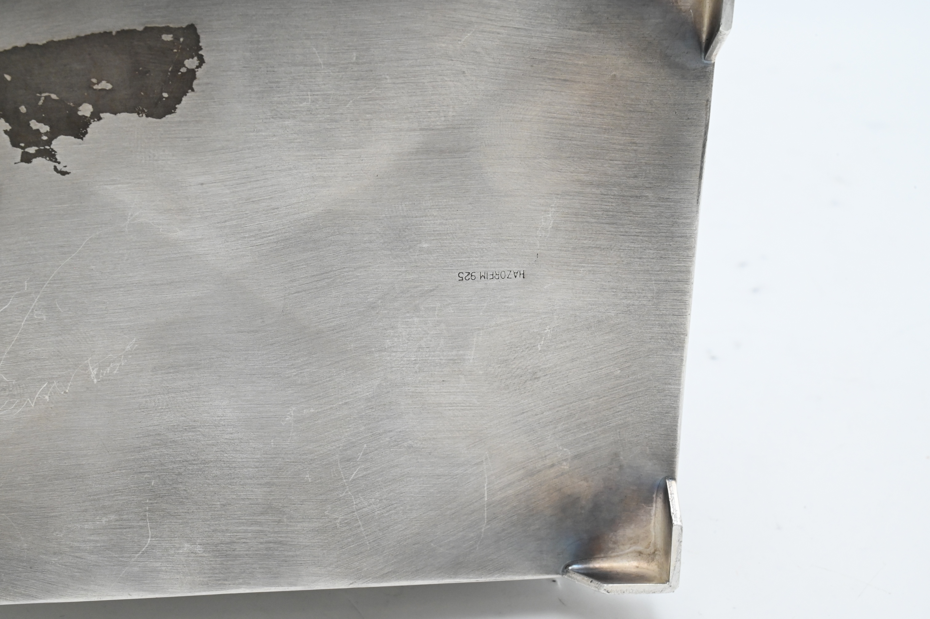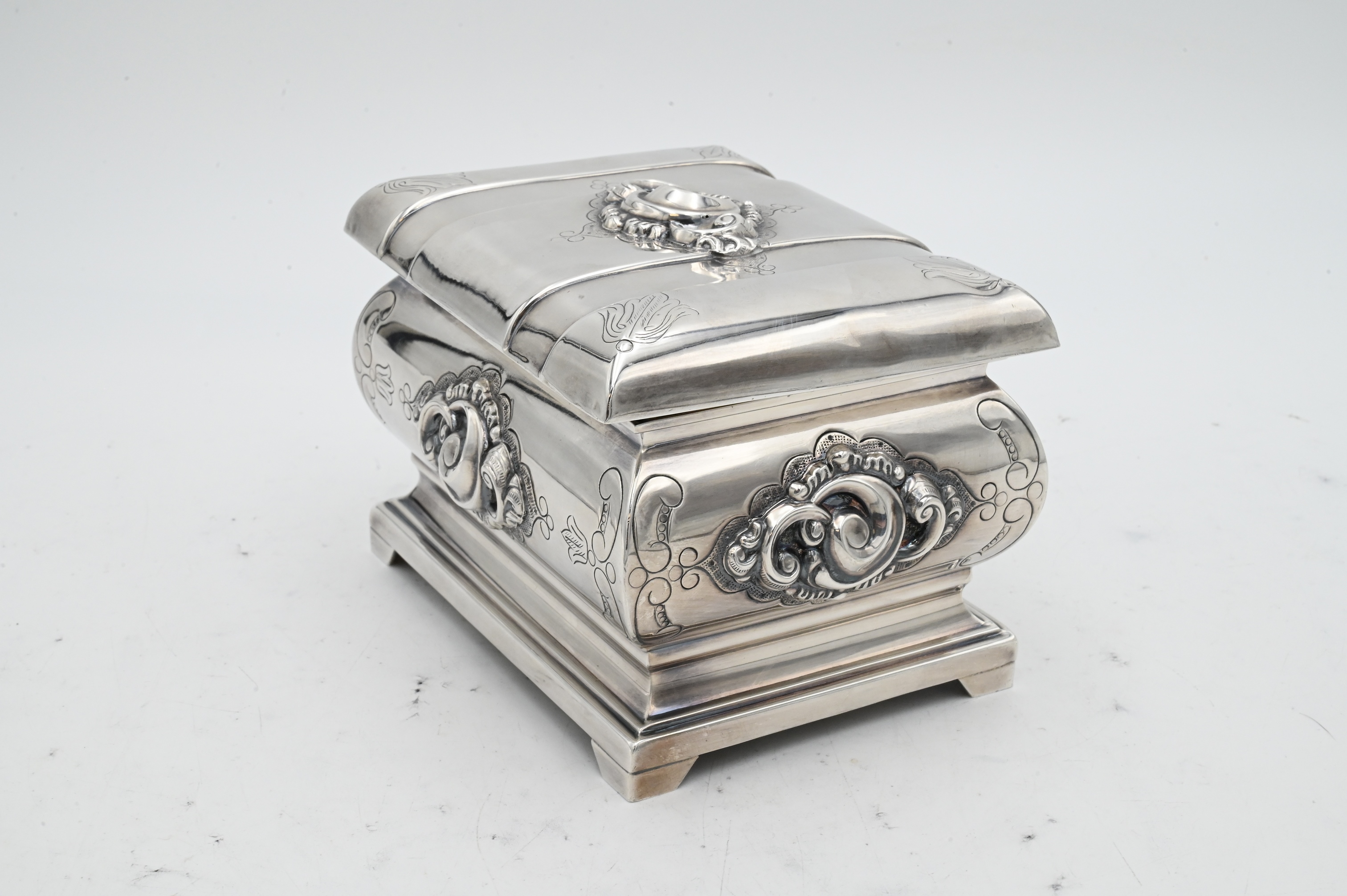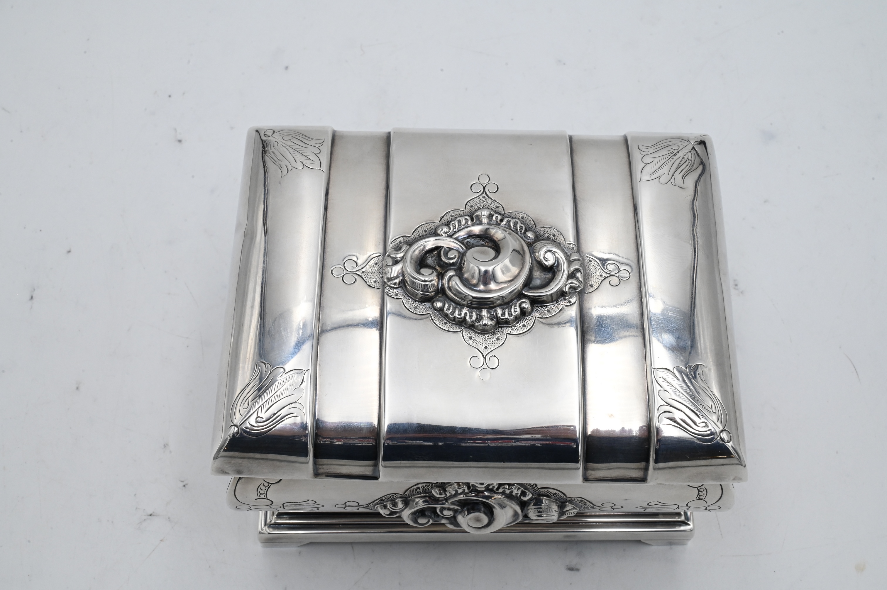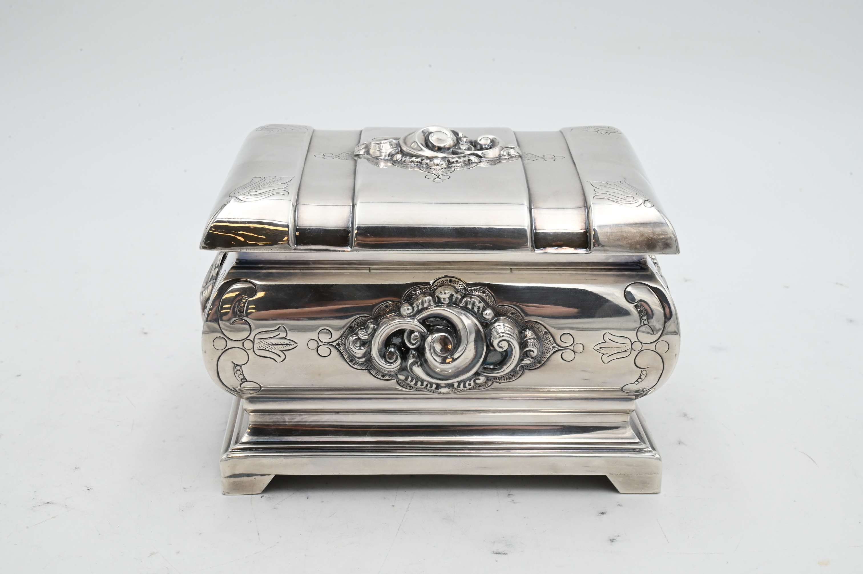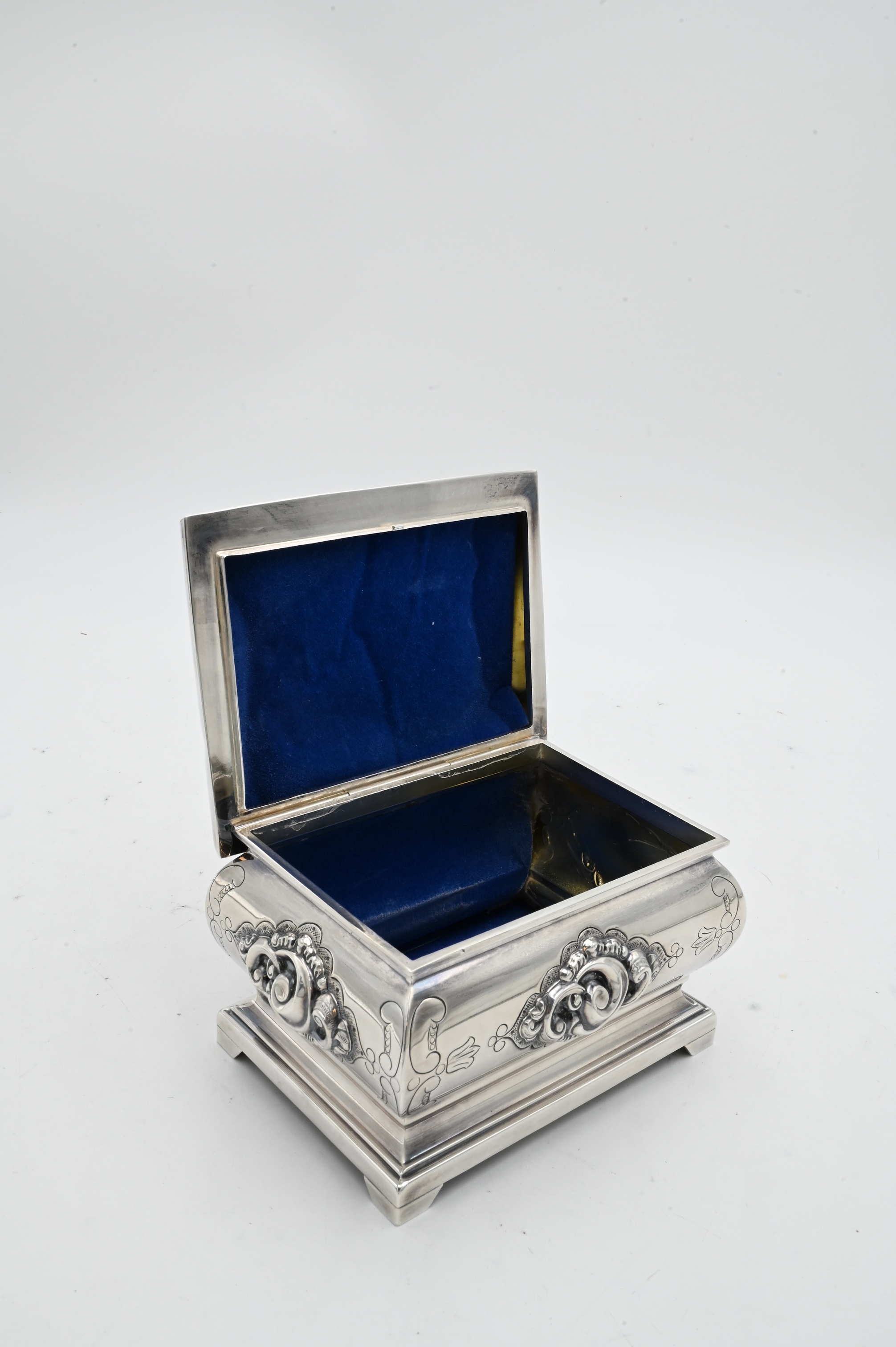 having hinged cover, modeled with scrolls, the interior later-fitted with blue velvet, marked Hazorfim 925
