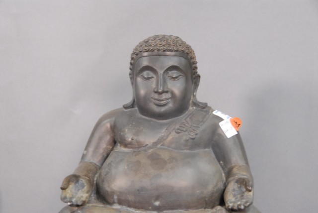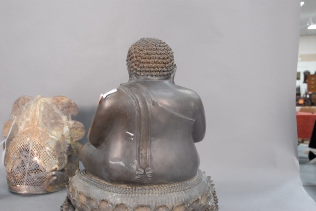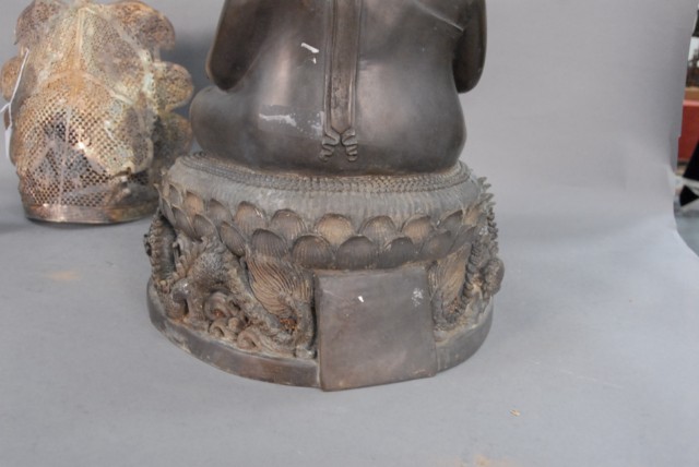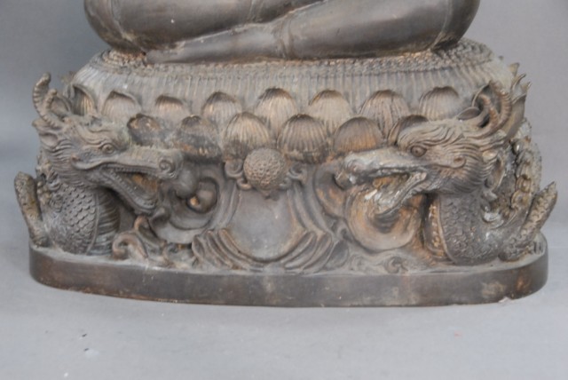 Large bronze sitting Buddha sitting on lotus with dragon circling lotus