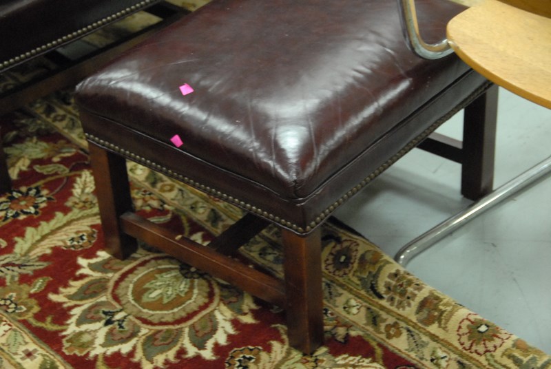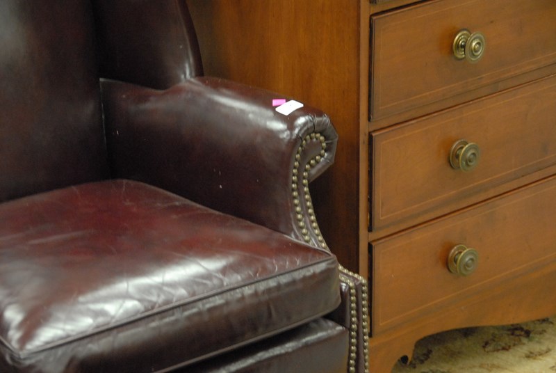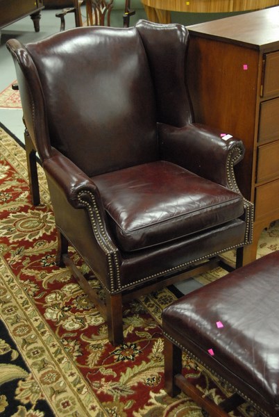 Leather upholstered wing chair and ottoman, ht. 41in.