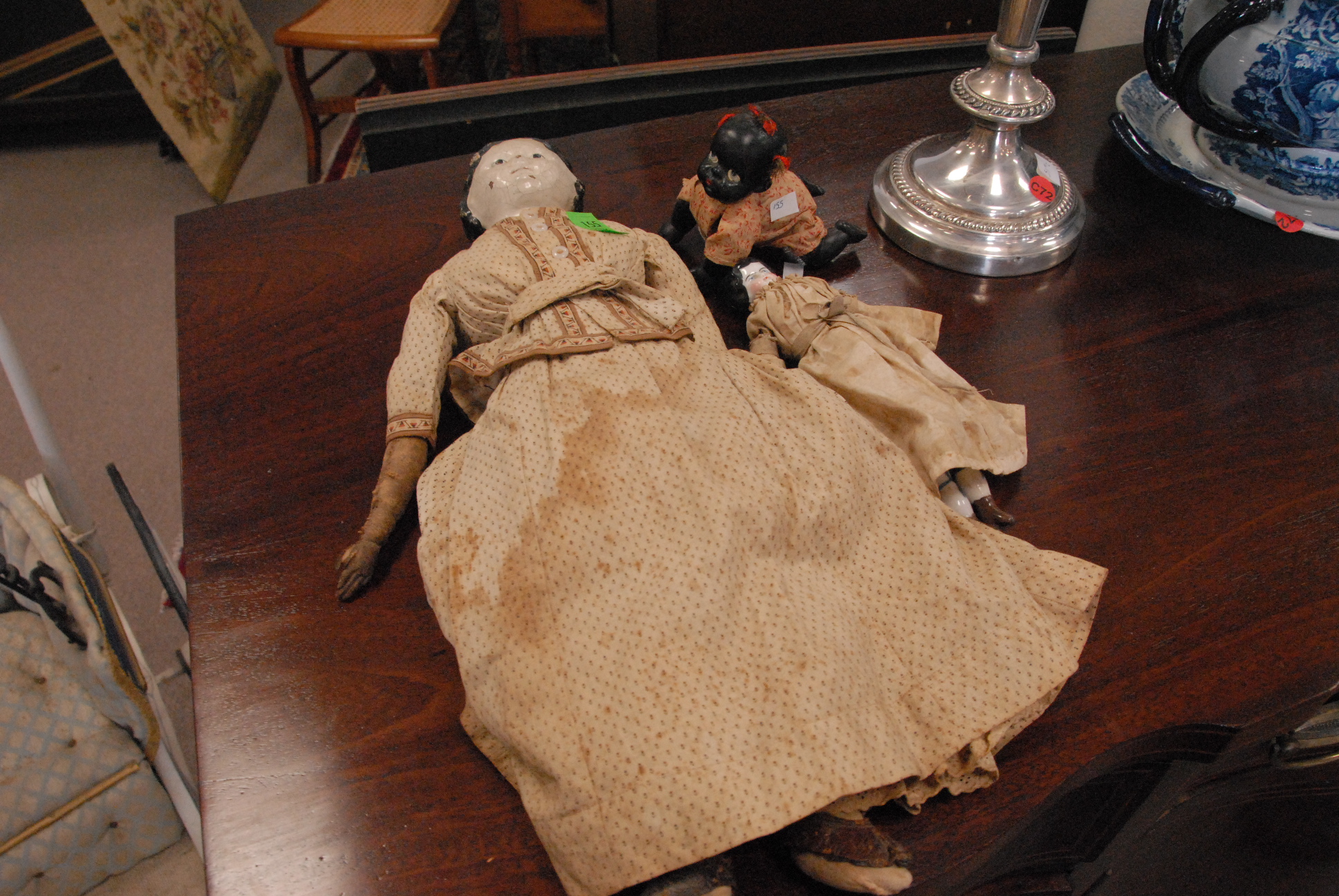Lot of three antique dolls, cloth head doll painted, china head doll, and celluloid windup doll