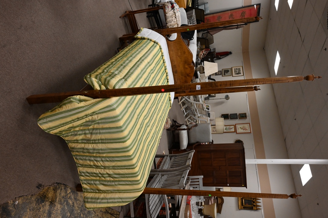 Pair of Custom Tiger Maple Tall Four Post Twin Size Beds, height 82 inches. Provenance: Estate of Peter Tillou, Litchfield, Connecticut.
