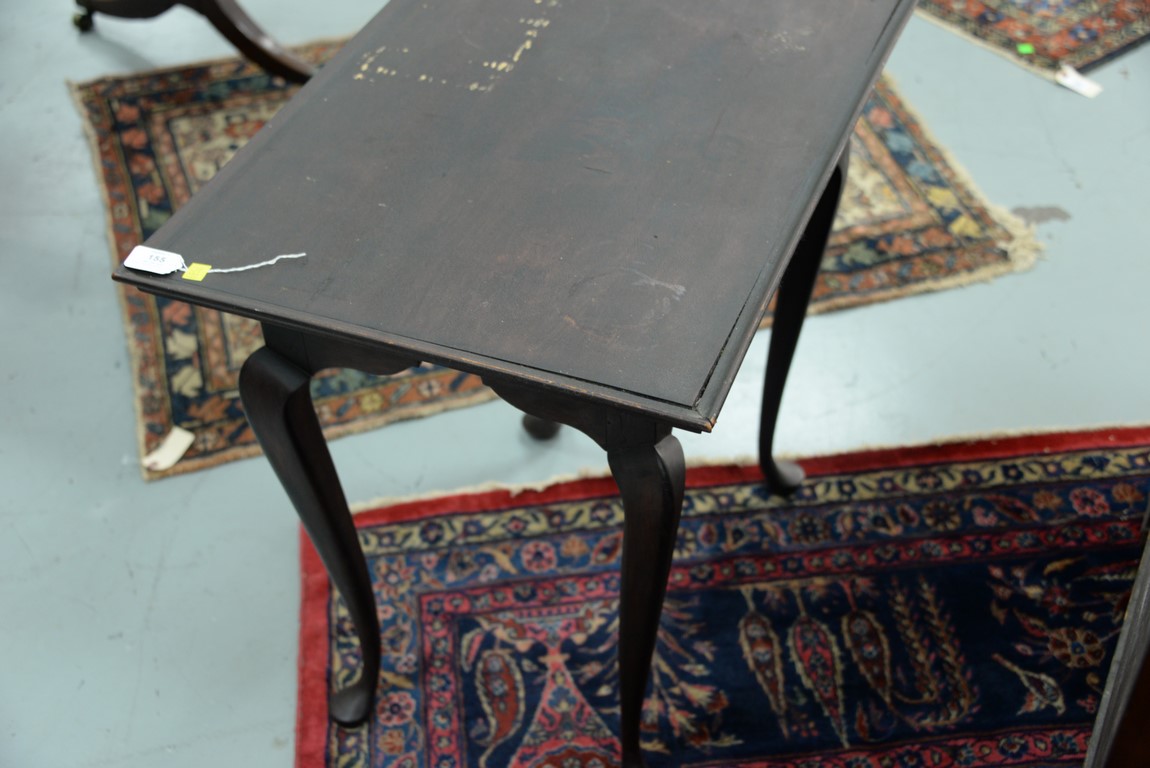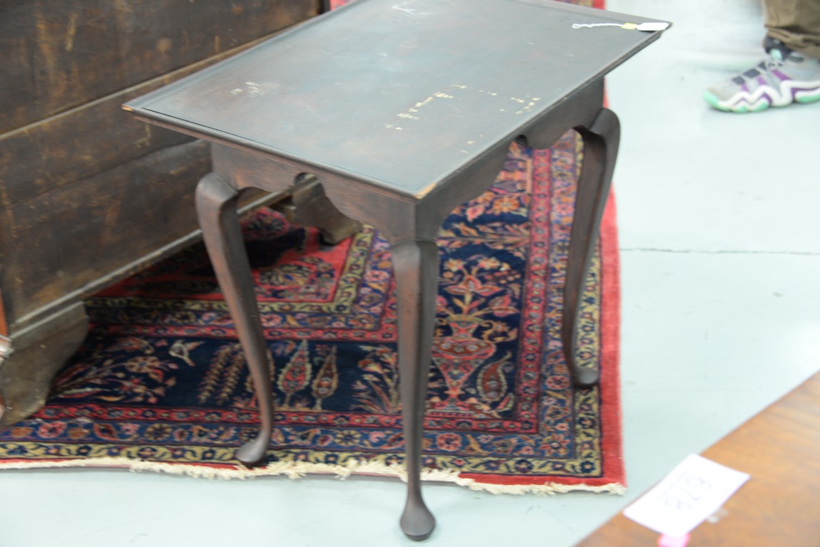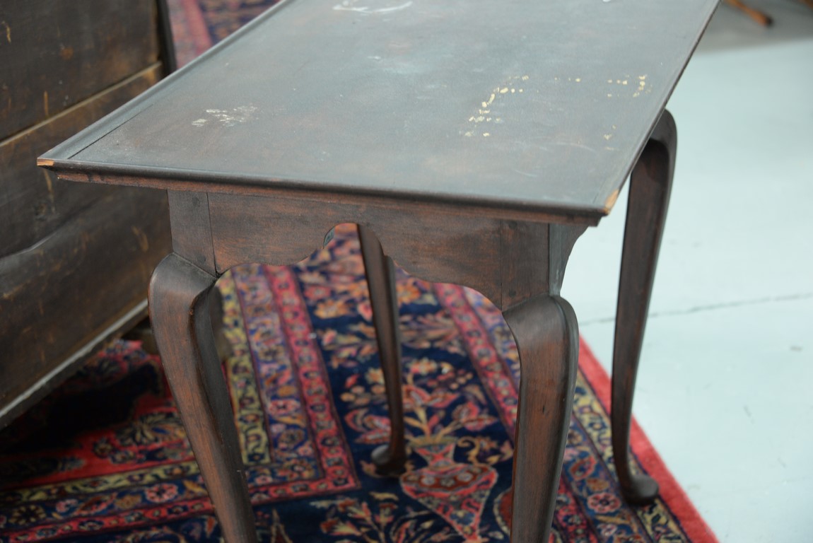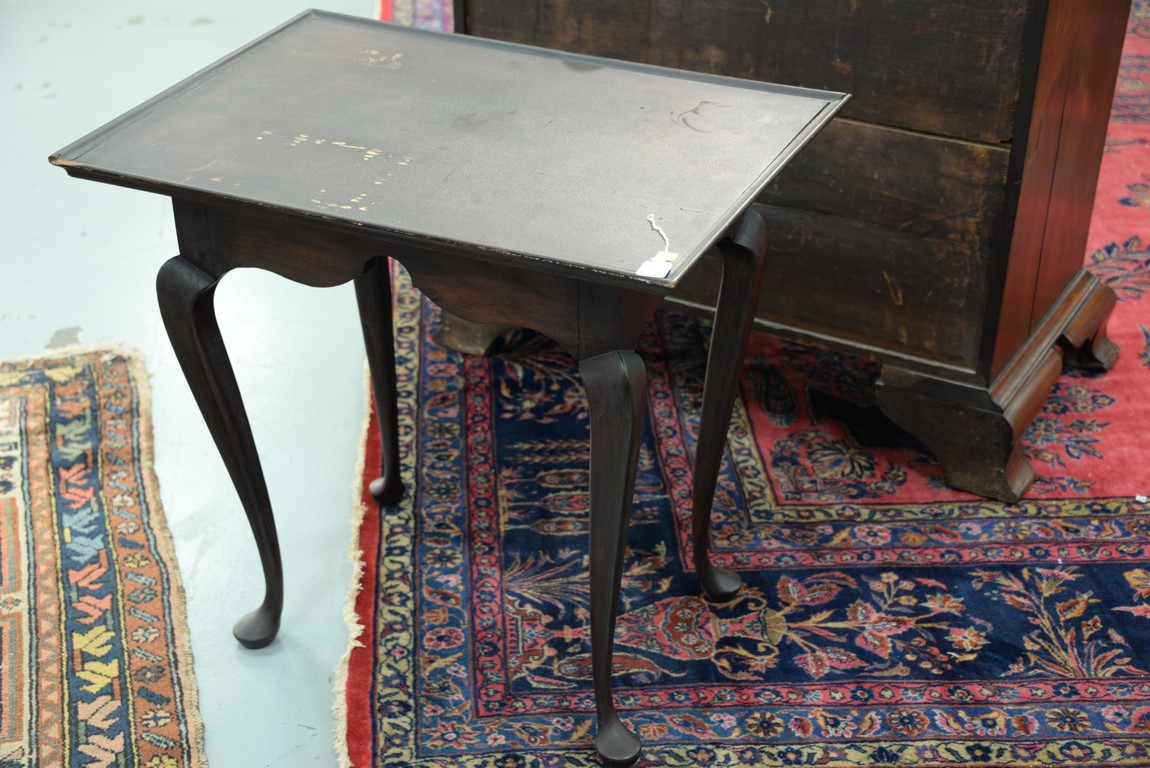 Lot 155: Queen Anne tea table having rectangular top with molded edges over carved skirt on cabriole legs ending in pad feet, 18th century top replaced. ht. 26 1/2 in. top: 28 1/4 x 20 1/4