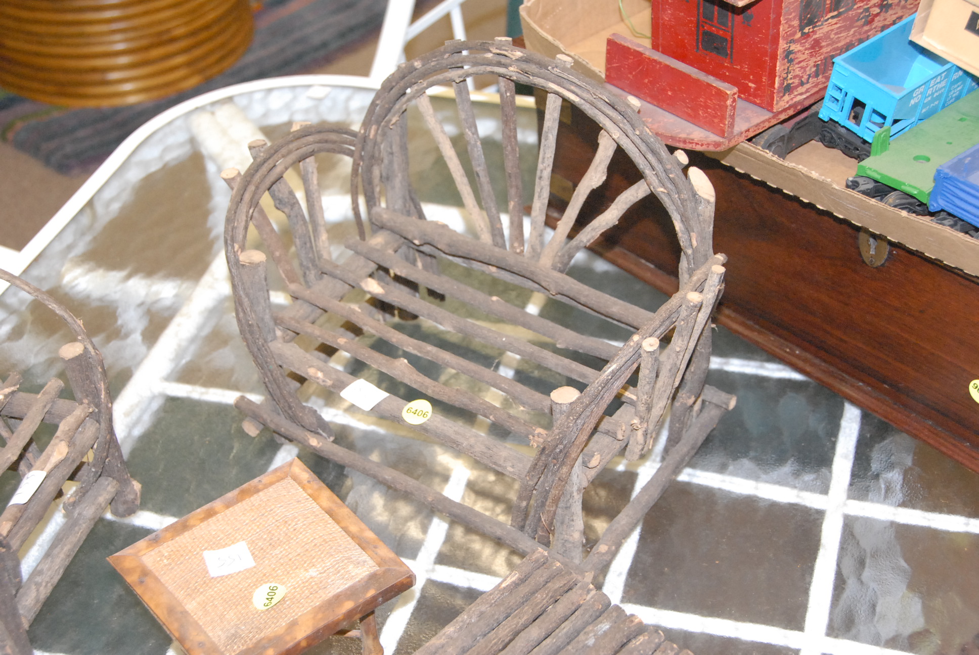 Lot 155: Seven piece lot four pieces miniature Adirondack style furniture and black lacquered side chair