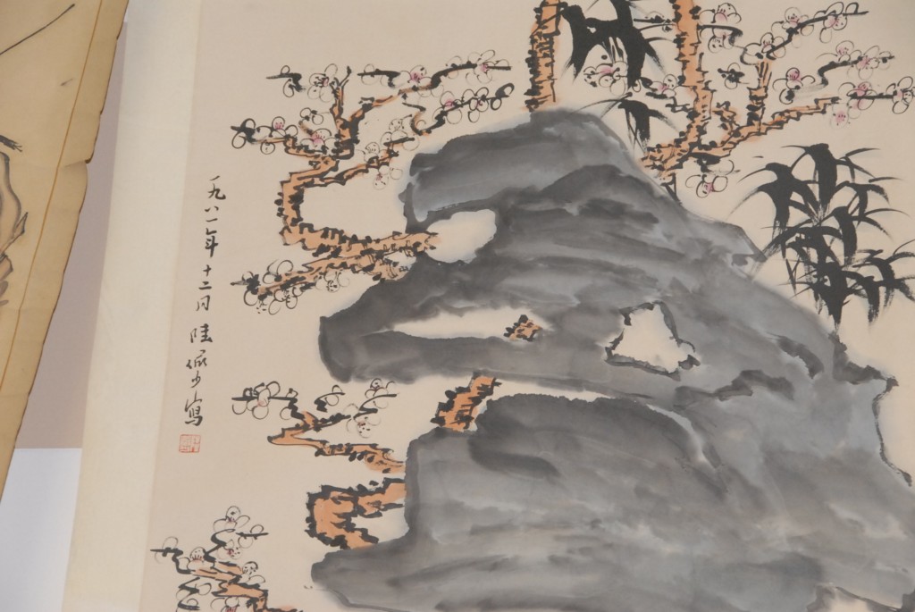 Lot 155: Three Oriental scrolls watercolor of blossoming tree 54 x 27, watercolor of tree with bird 39 x 18, and watercolor of peaches w…