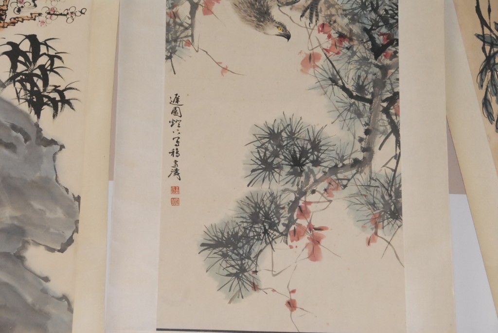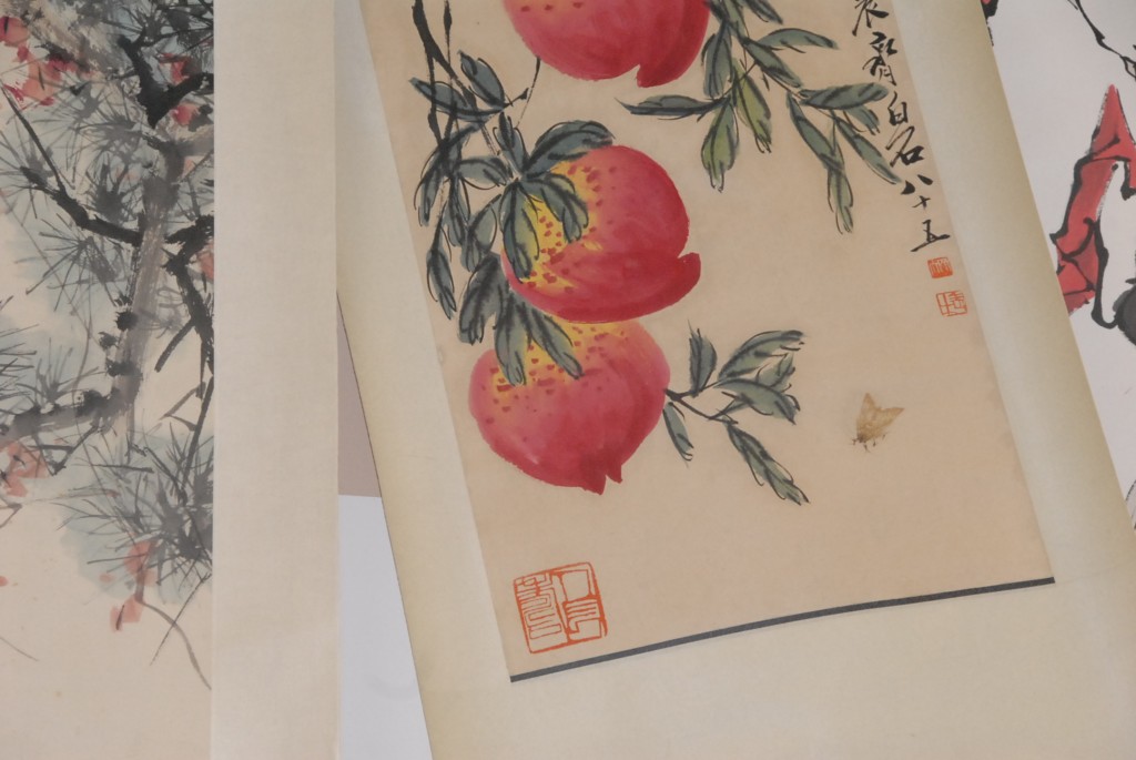 Three Oriental scrolls watercolor of blossoming tree 54 x 27, watercolor of tree with bird 39 x 18, and watercolor of peaches with bugs 35 x 15.