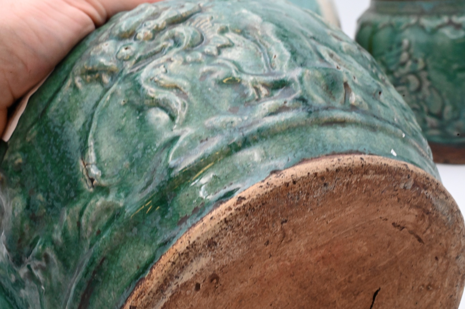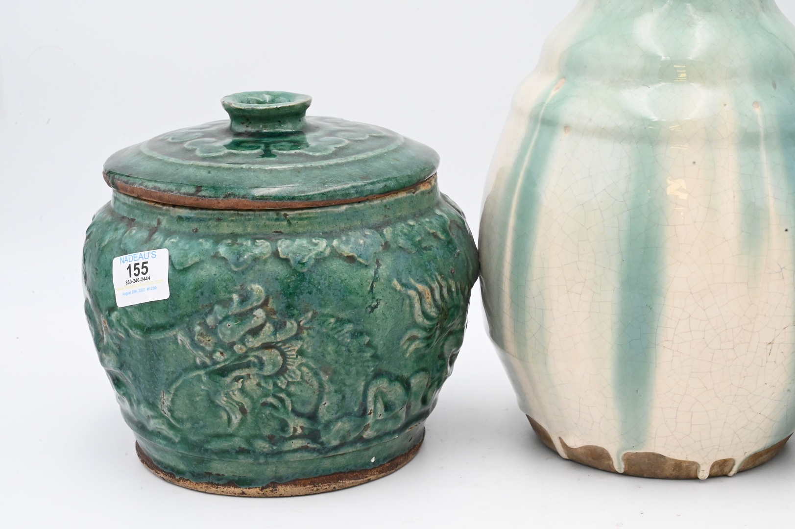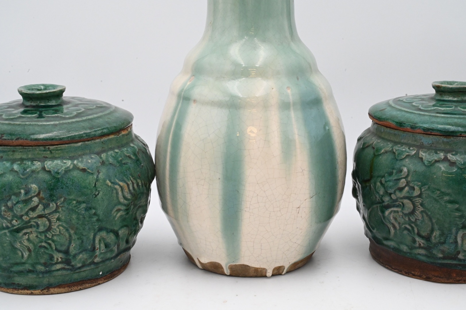 Three Piece Group of Glazed Stoneware, to include a pair of green covered pots with flowers, animals and dragons; along with a green and white glazed vase, tallest 13 inches. Provenance: Estate of Peter Tillou, Litchfield, Connecticut.