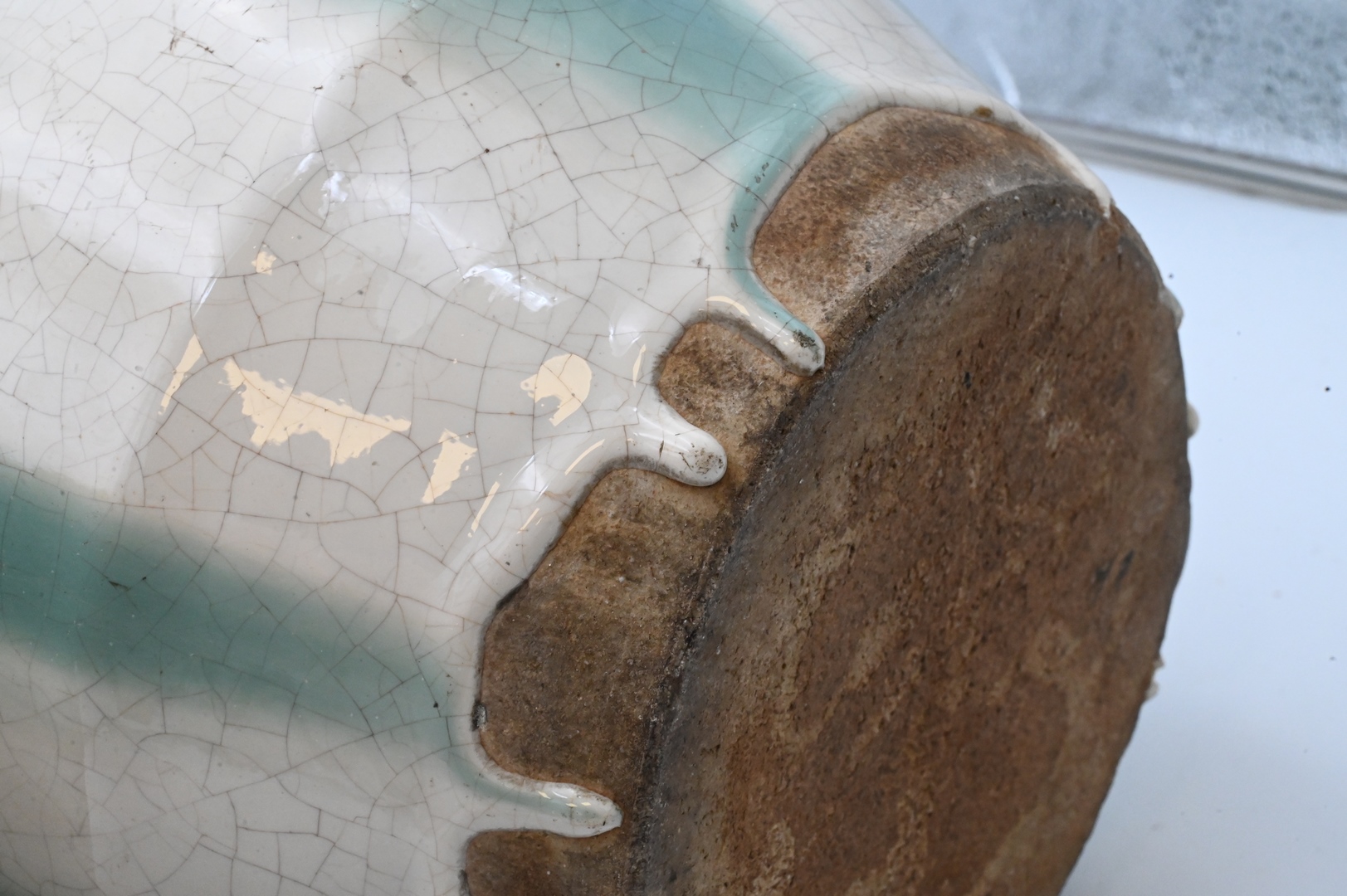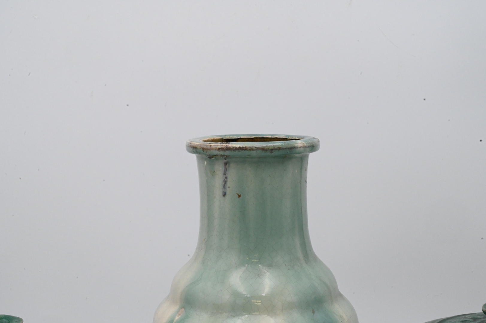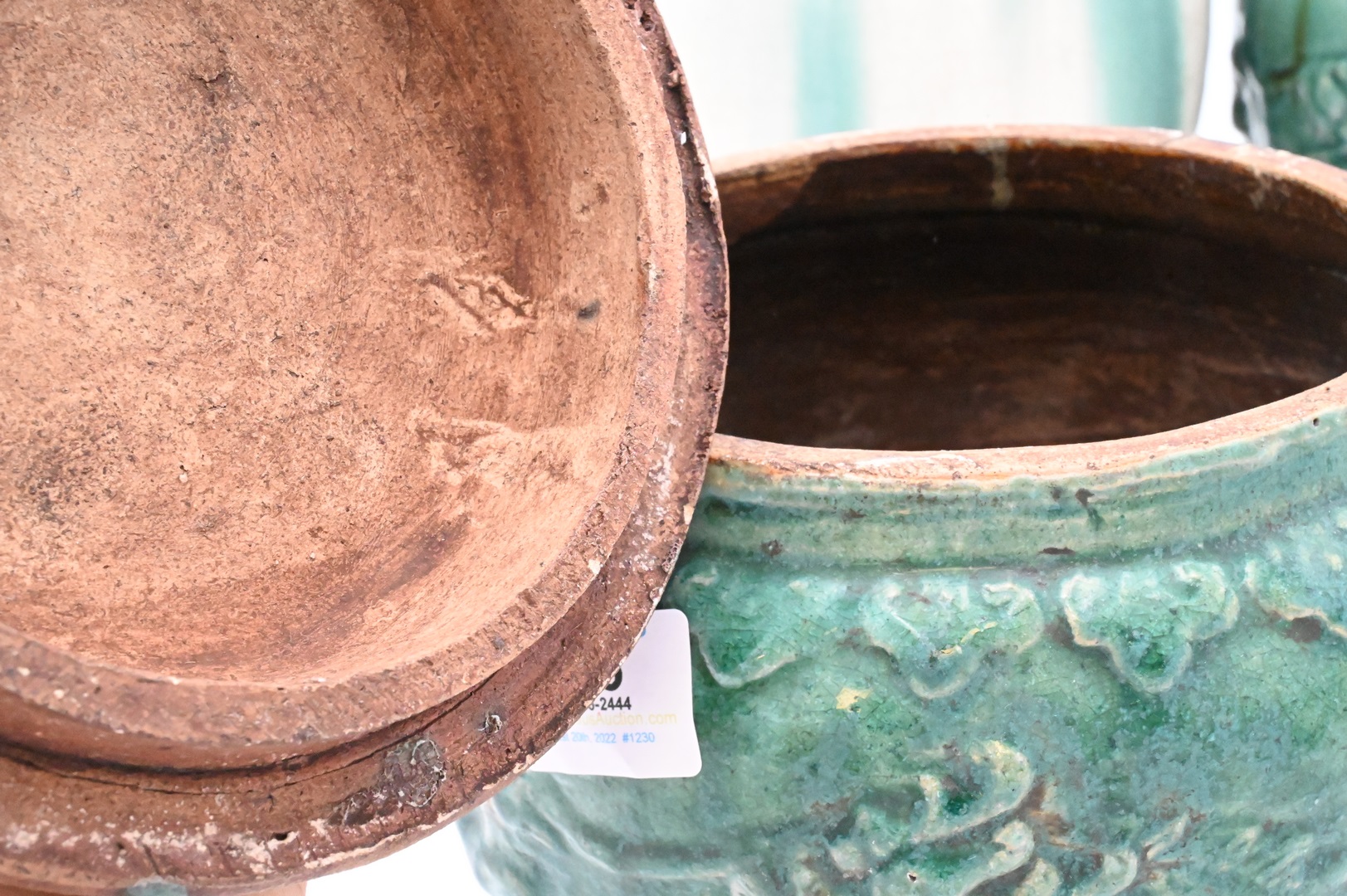 Three Piece Group of Glazed Stoneware, to include a pair of green covered pots with flowers, animals and dragons; along with a green and white glazed vase, tallest 13 inches. Provenance: Estate of Peter Tillou, Litchfield, Connecticut.