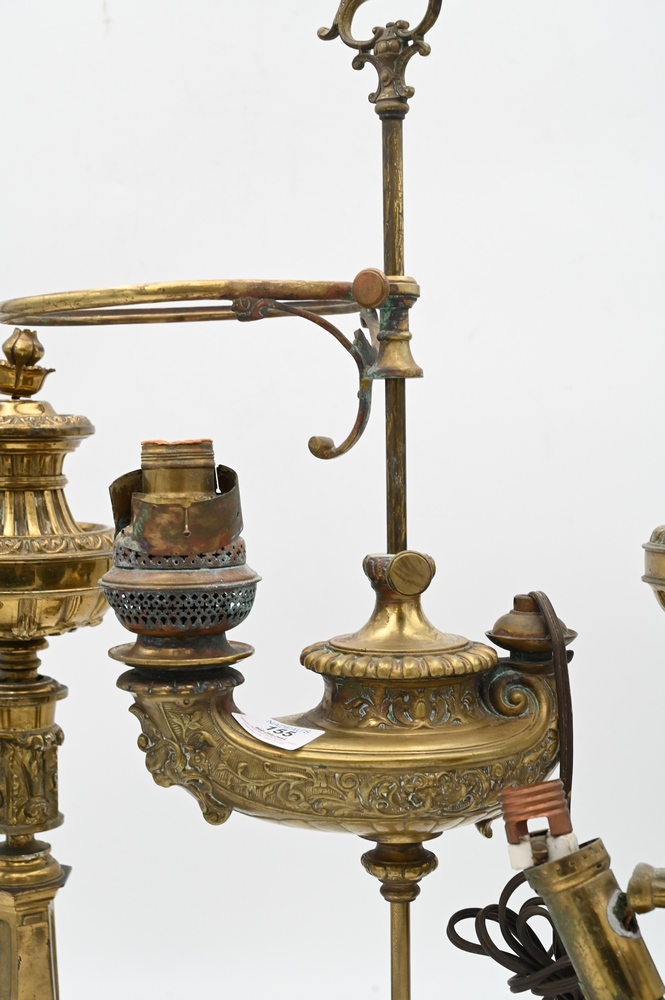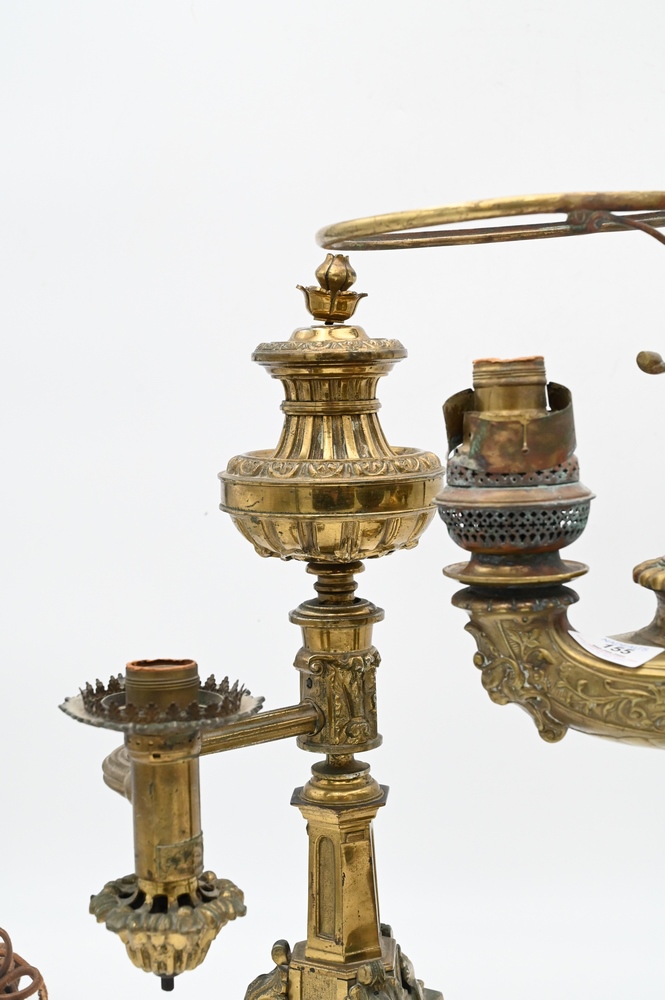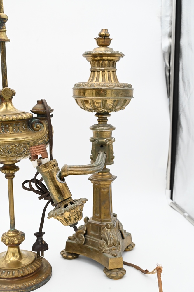 Lot 155: Three Piece Lot, to include a Clarkcoit Cargill New York Argand Lamp, having triangular base, column supports and decorative collars, with one arm, height 18 inches; along with bronze argand lamp, having adjustable oil well with lion mask, height 25 inches.