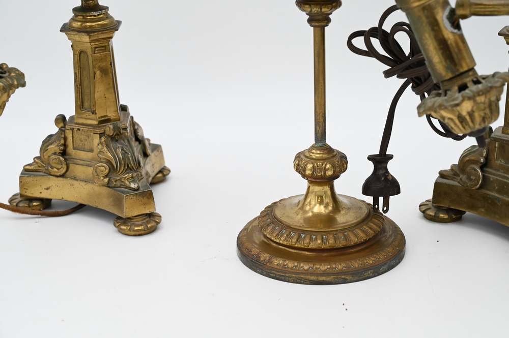 Three Piece Lot, to include a Clarkcoit Cargill New York Argand Lamp, having triangular base, column supports and decorative collars, with one arm, height 18 inches; along with bronze argand lamp, having adjustable oil well with lion mask, height 25 inches.
