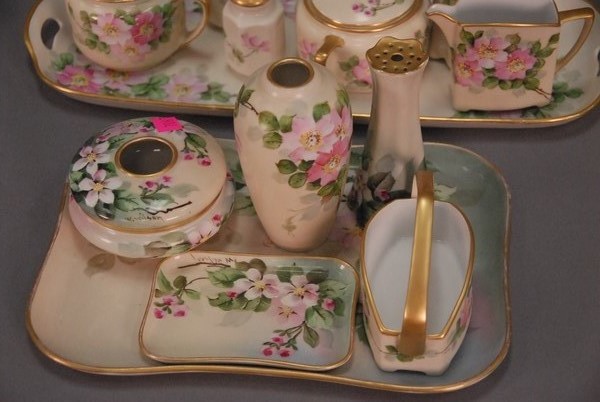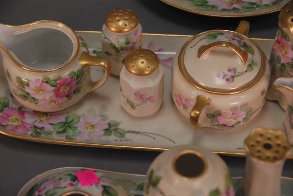 Lot 155: Twenty-five piece lot of Walter Wilson hand painted china to include dresser pieces, cake set, etc.