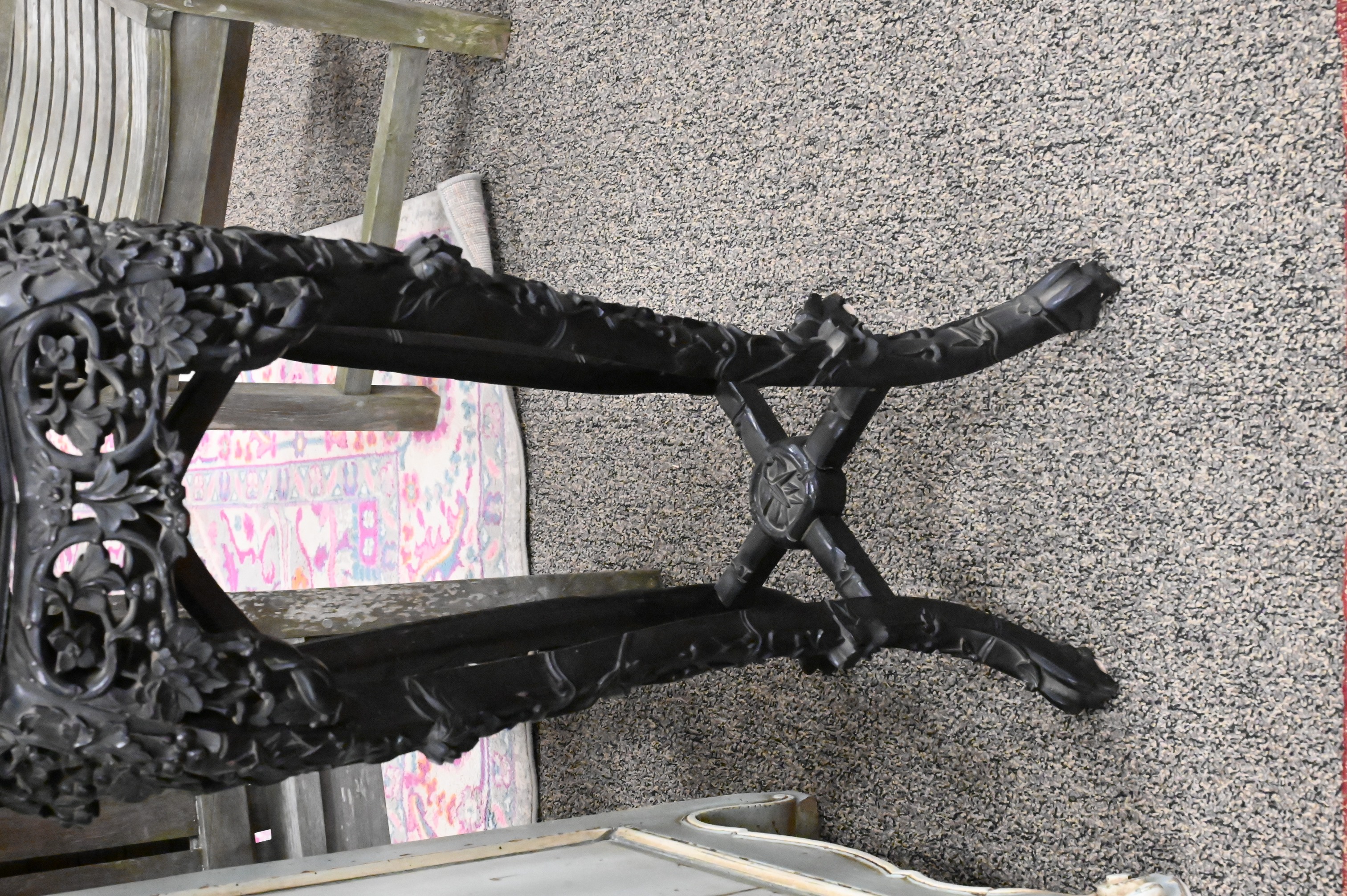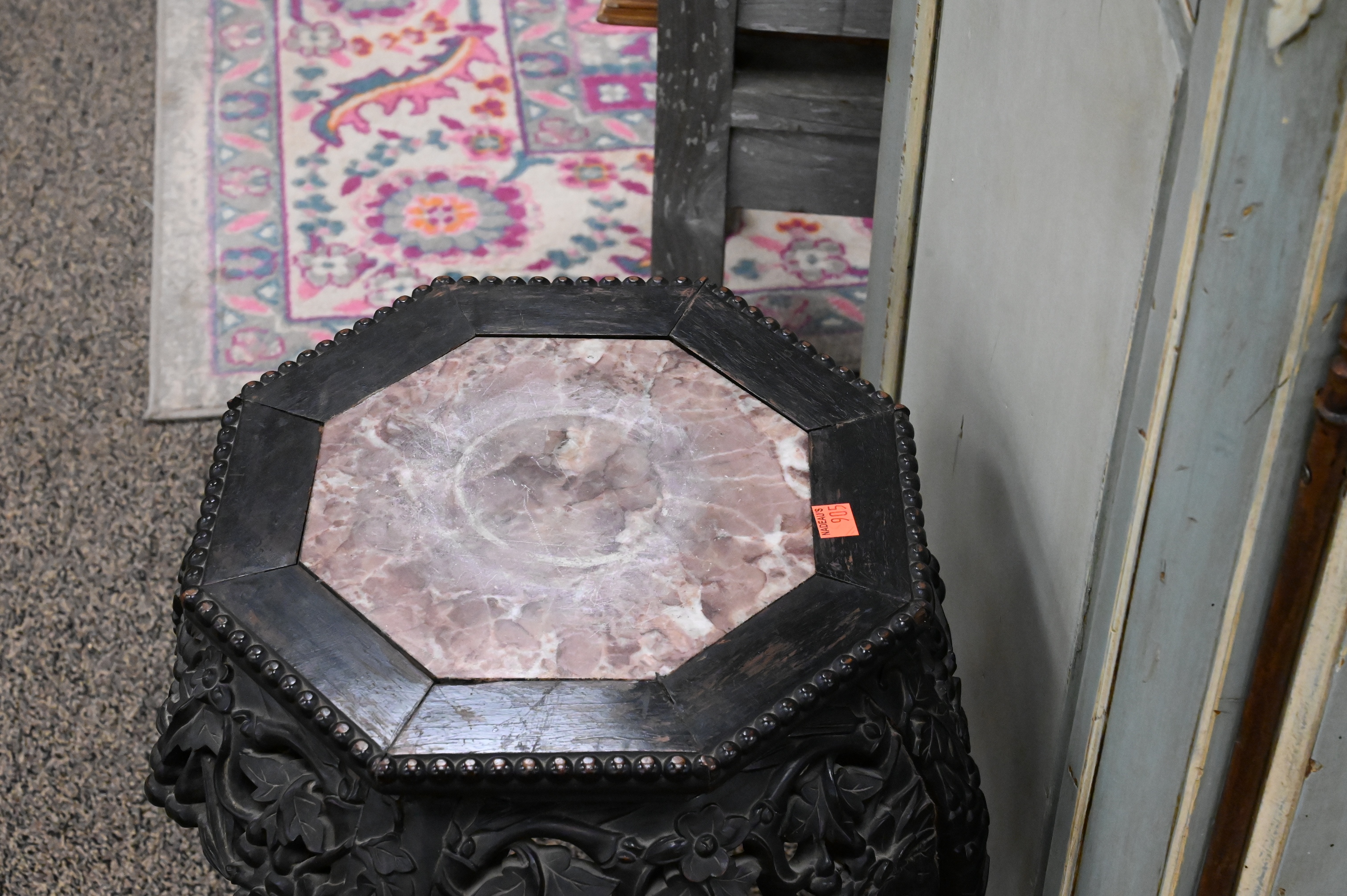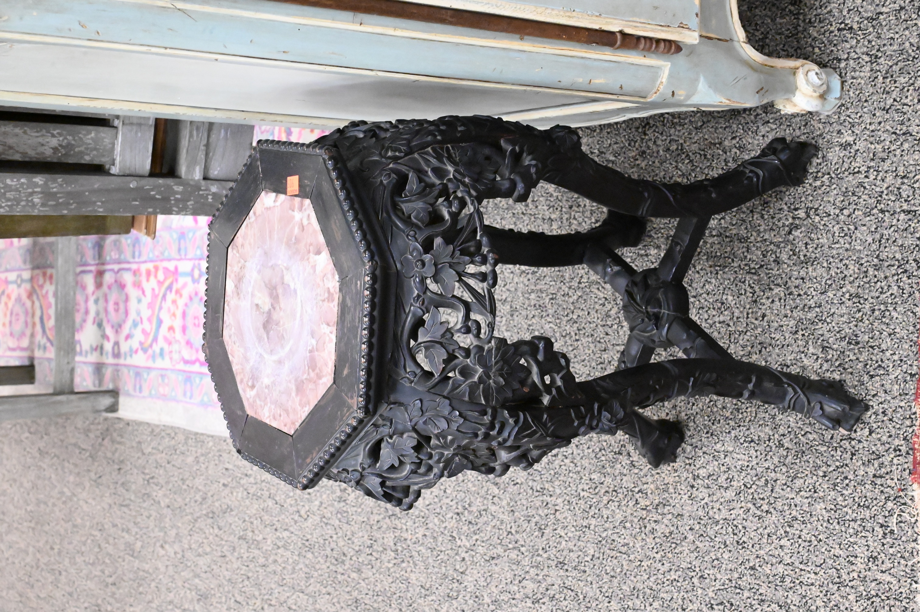 each having octagonal top with inset marble over pierce foliate carved skirt, raised on foliate carved legs with stretcher base
