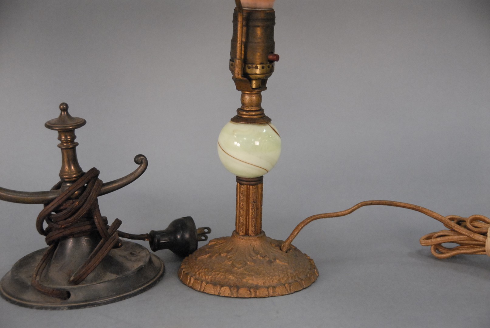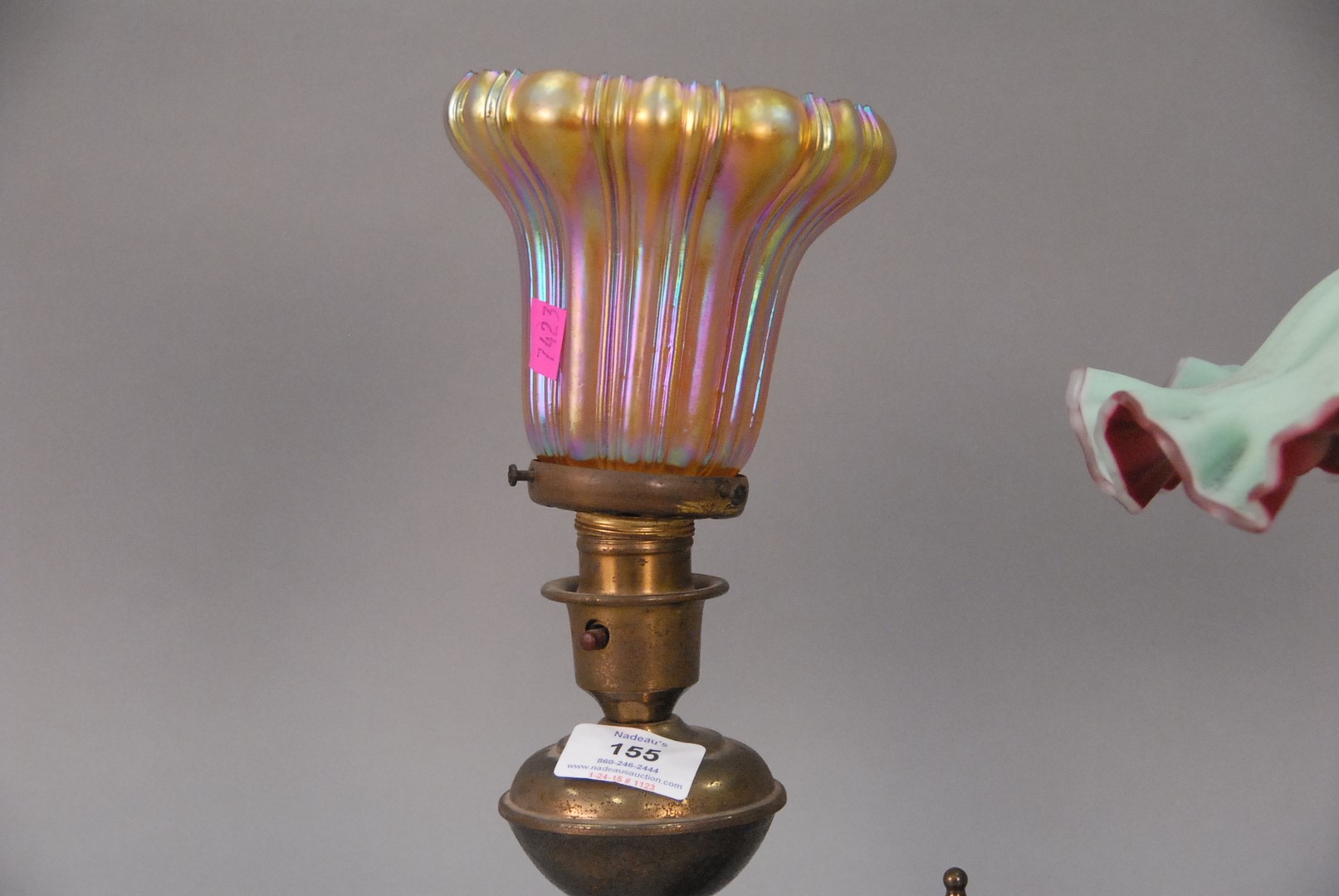 Lot 155: Two piece lot to include a brass lamp with iridescent shade, signed Steuben, along with another lamp. ht. 10 1/2 and ht. 4 1/2