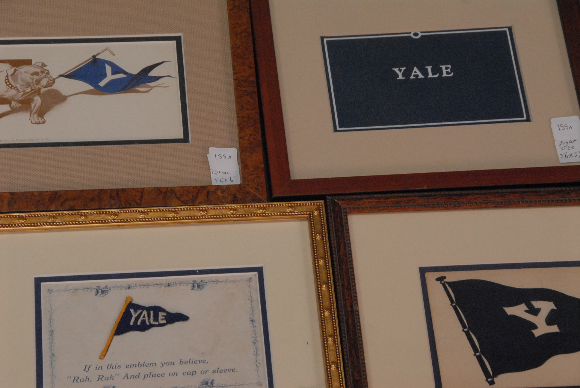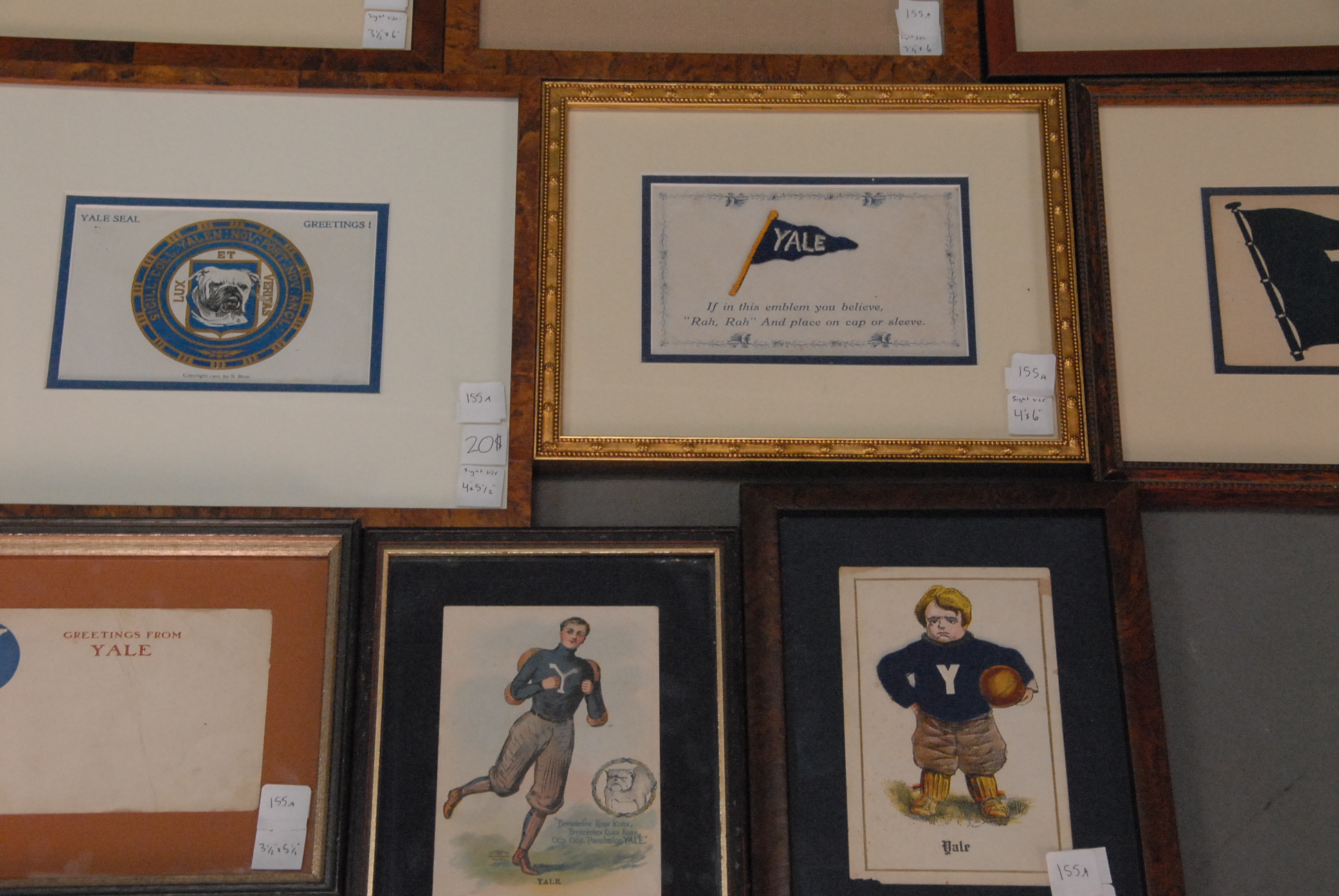 Group of nine framed post cards and prints.