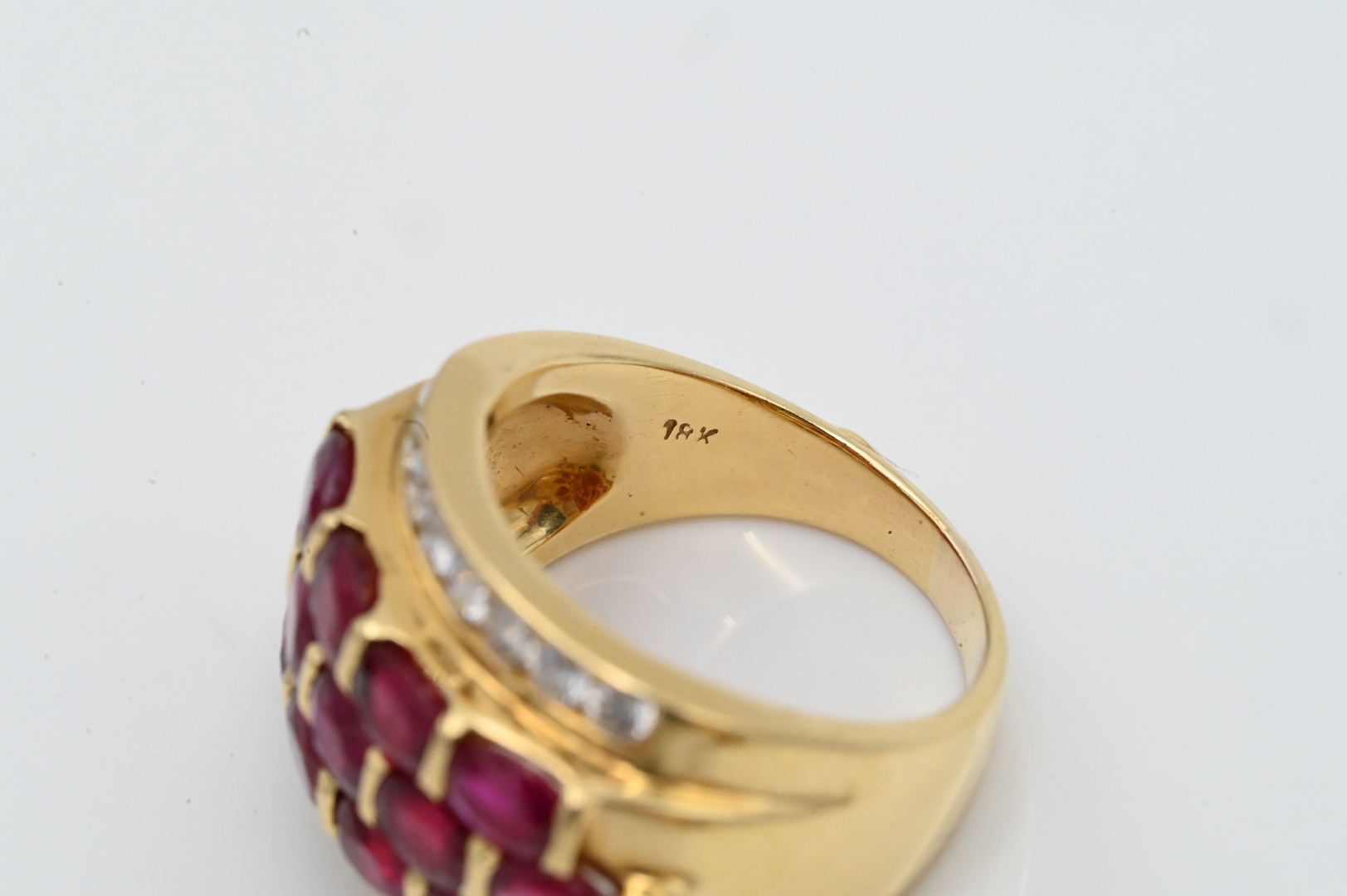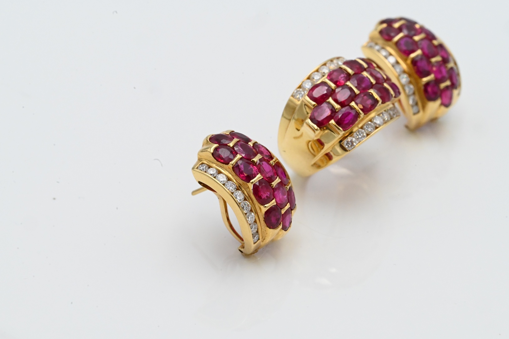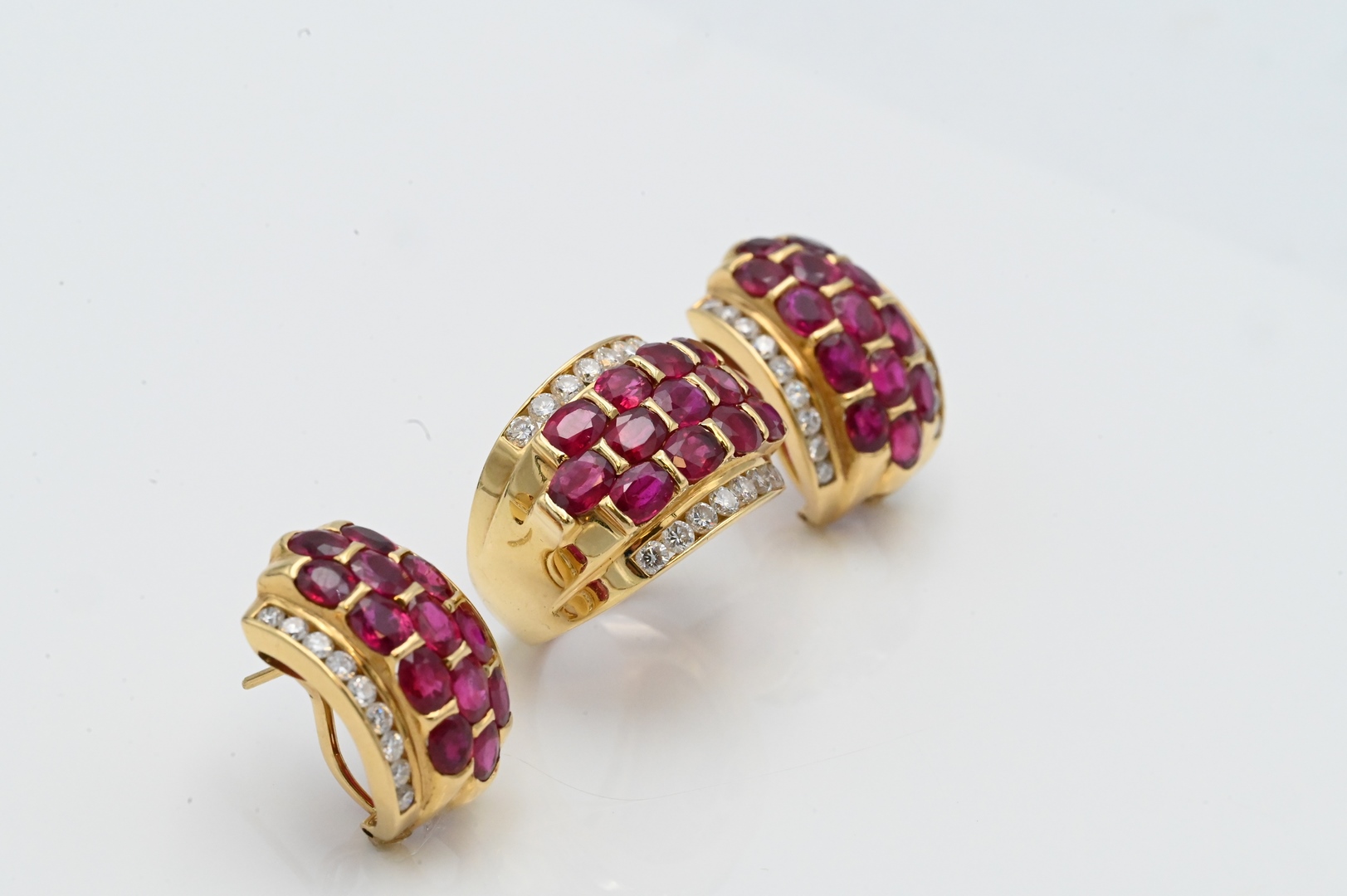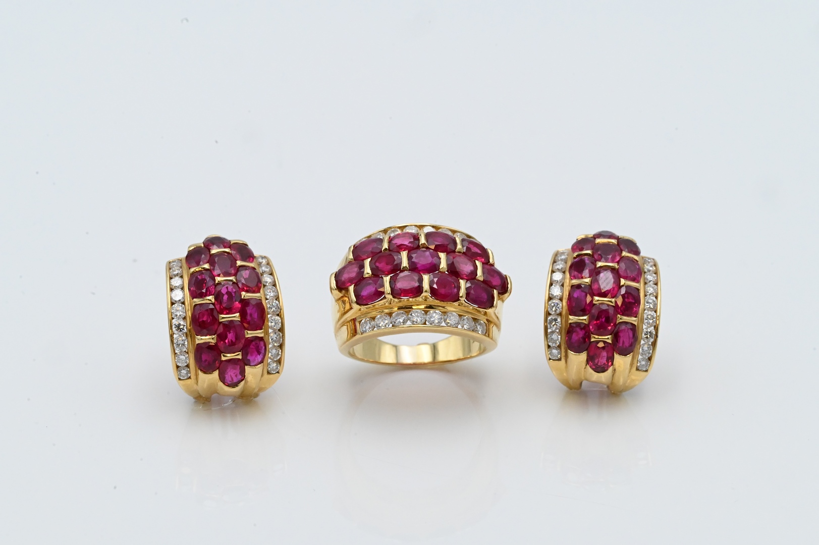 to include pierced earrings along with a ring, each piece set with 13 rubies, ring having 16 diamonds each, earring having 18 diamonds