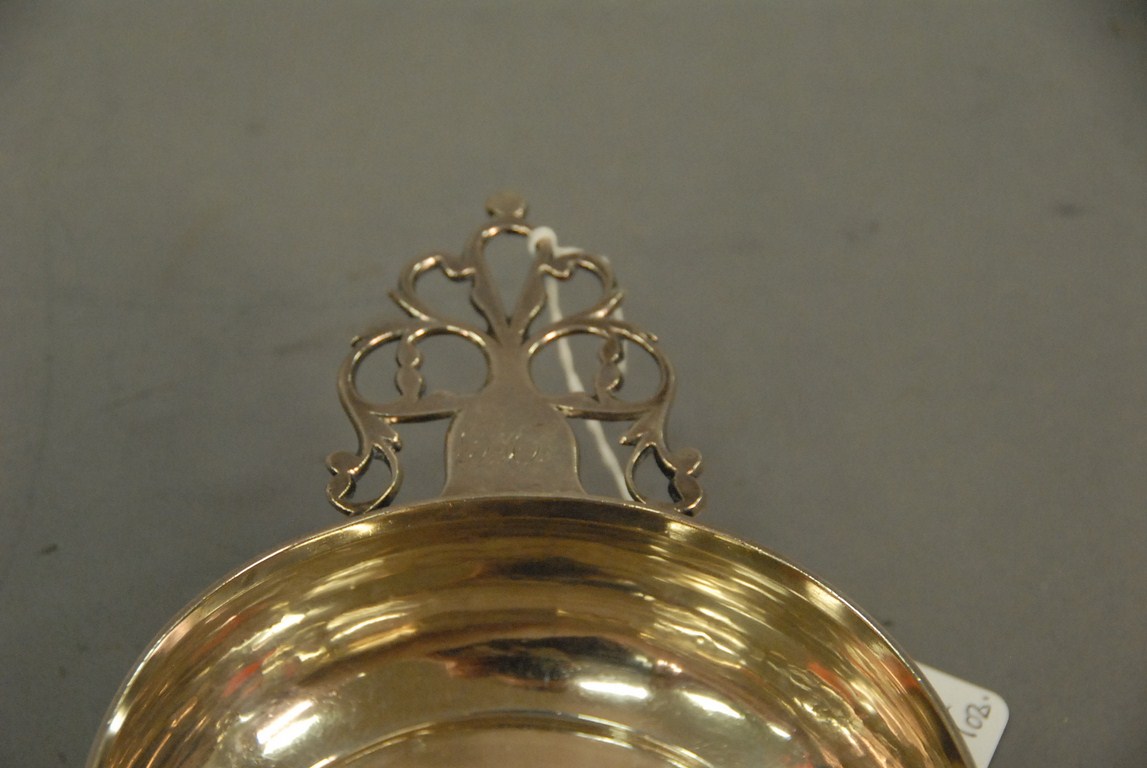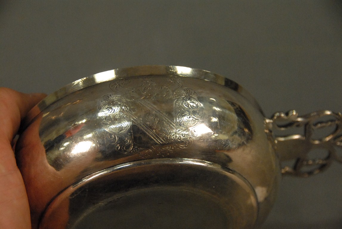 Lot 156: American silver porringer with pierced handle, possibly Benjamin Hiller or Jacob Hurd Boston, monogrammed BAS Samuel Brown 1731. 7.1…