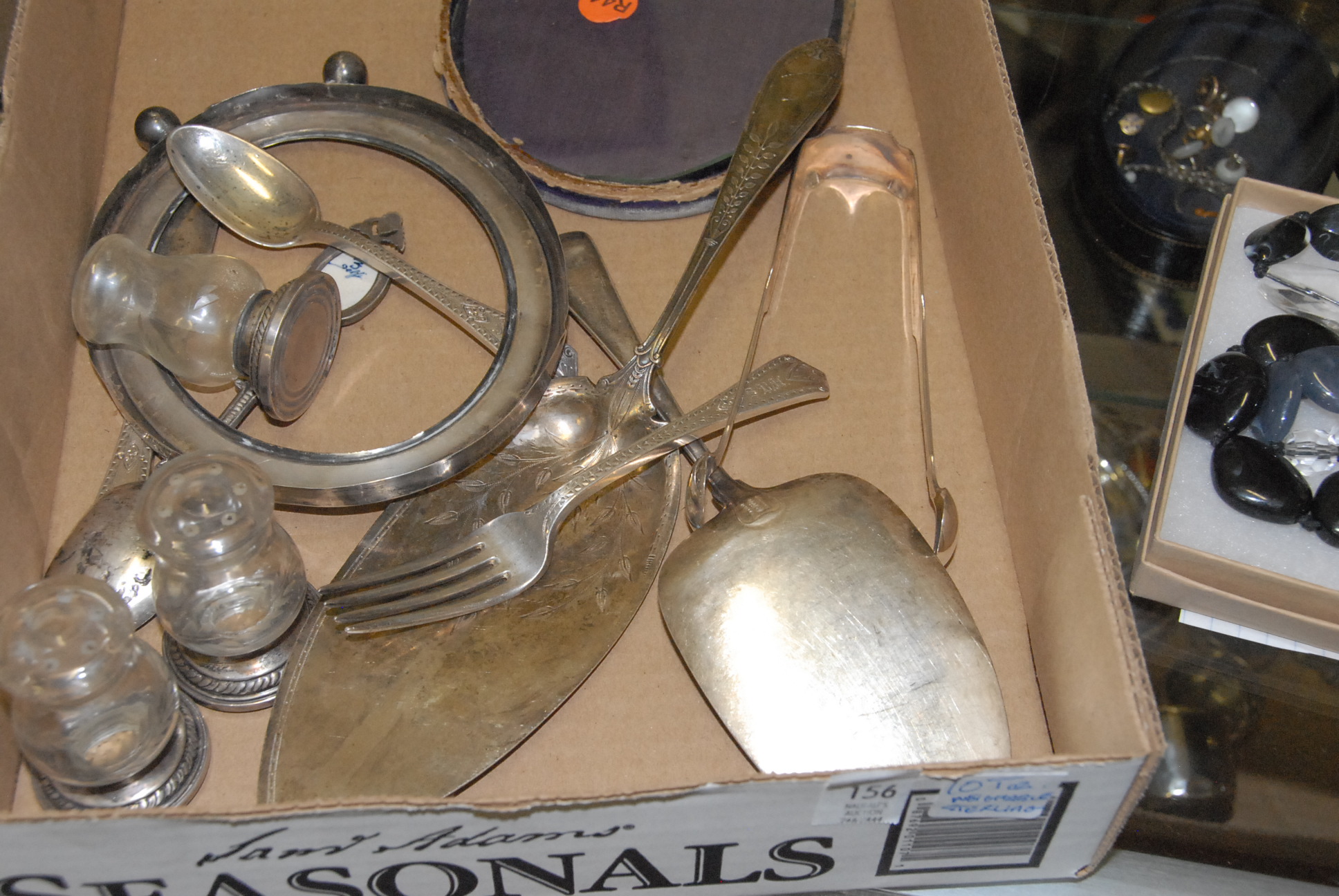 Box lot of sterling silver including serving pieces, frame, tongs, 10 troy oz. weighable silver.