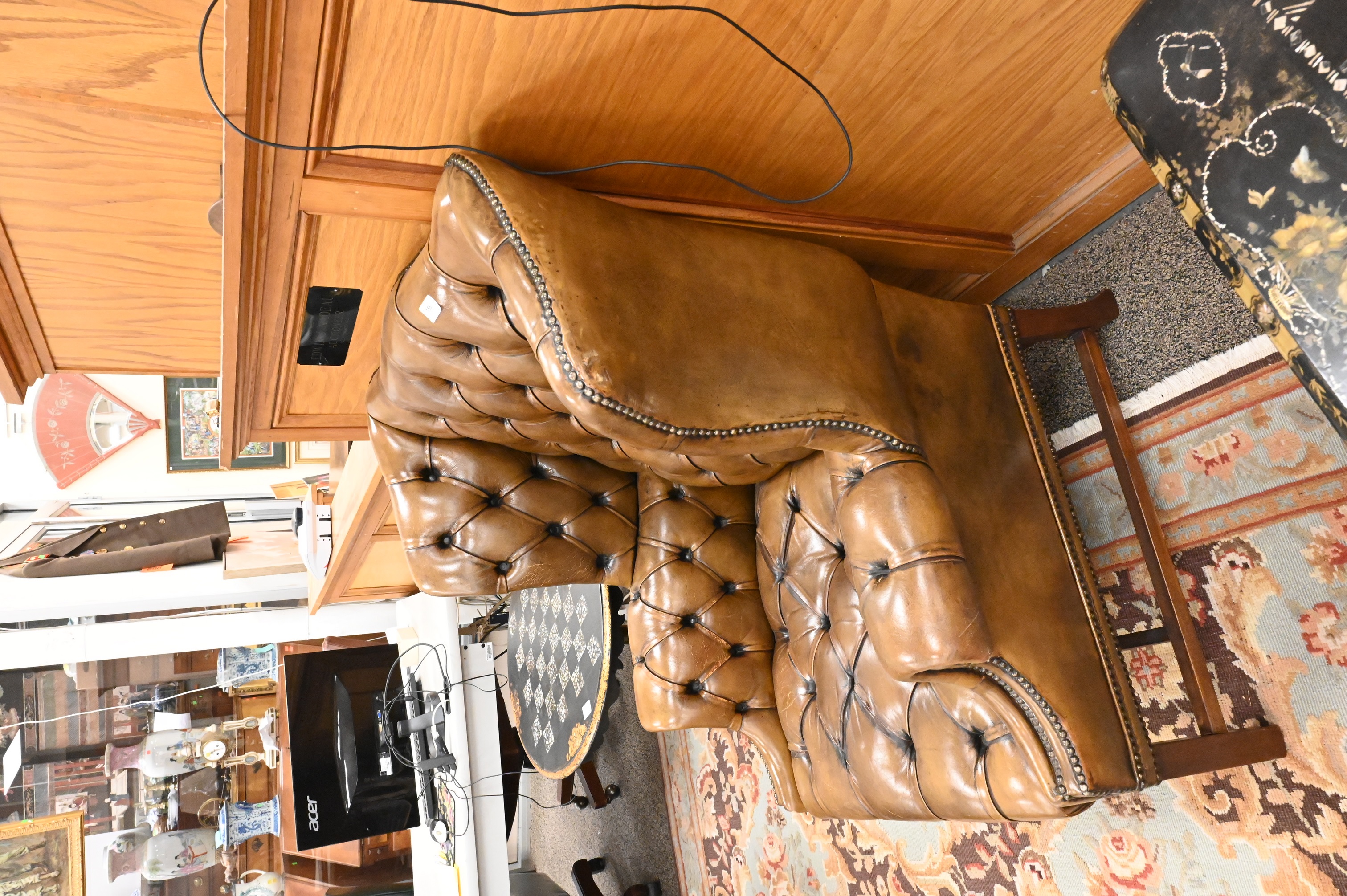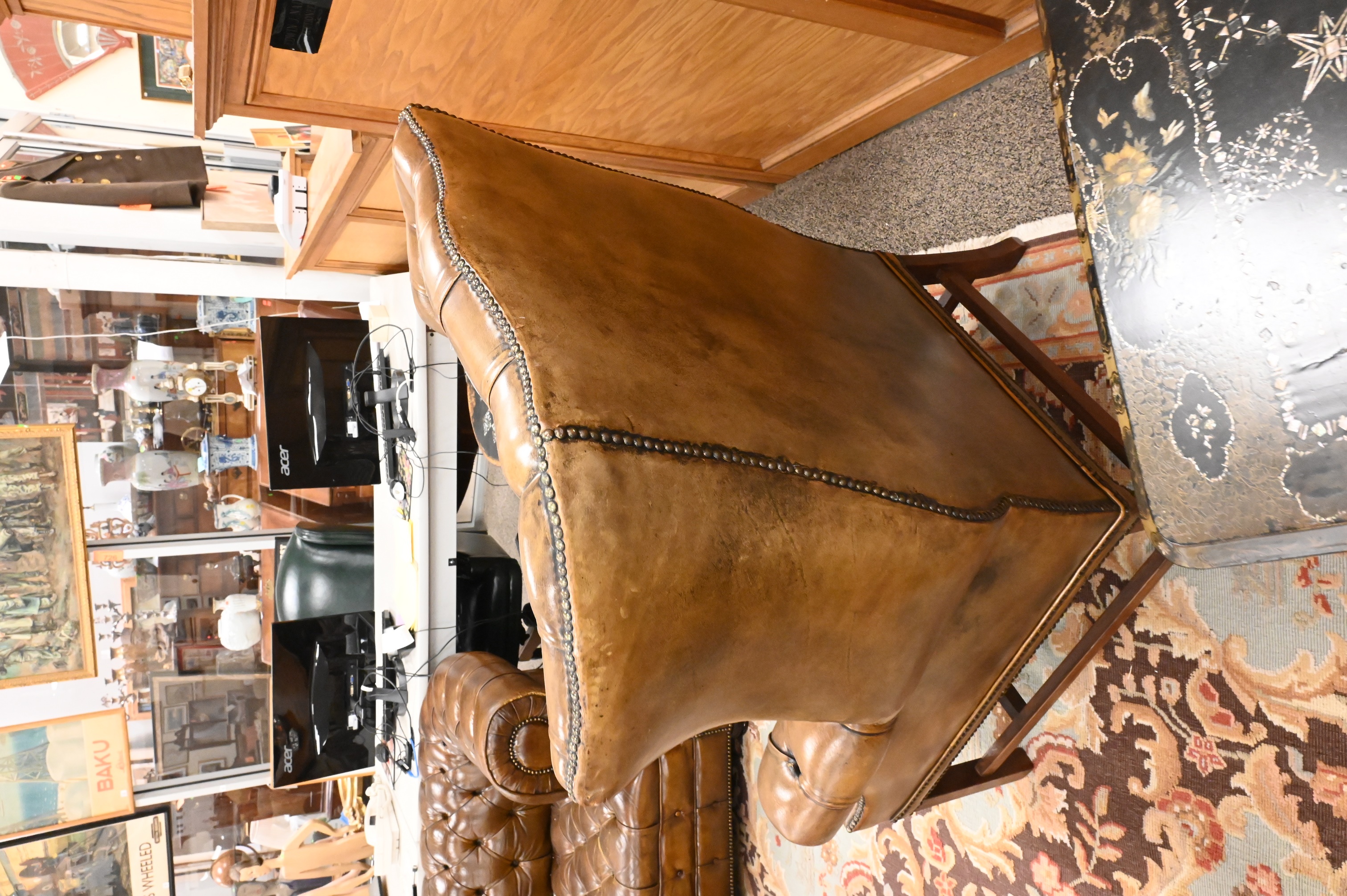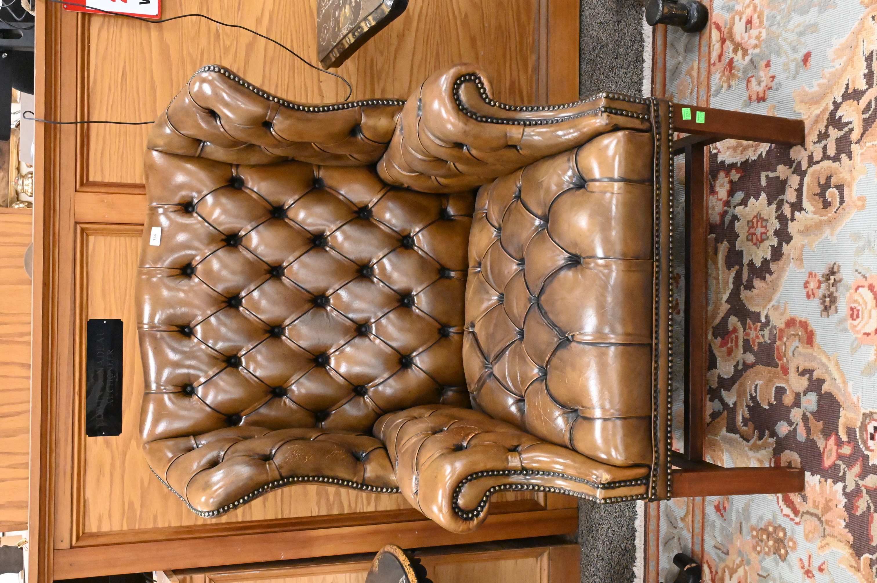 Lot 156: Brown Leather Tufted Chippendale Style Wing Chair