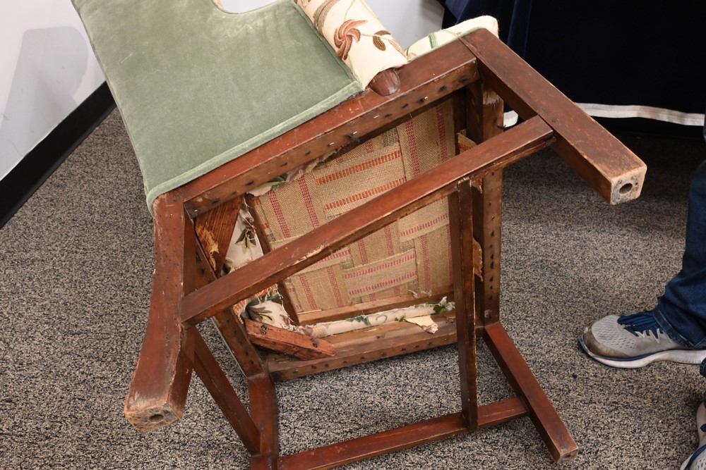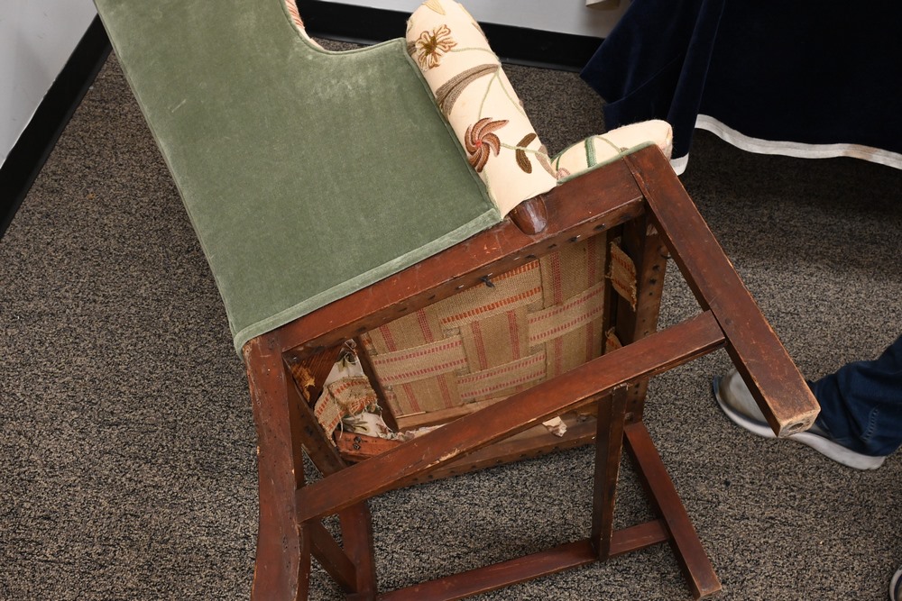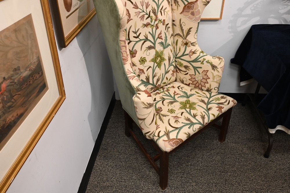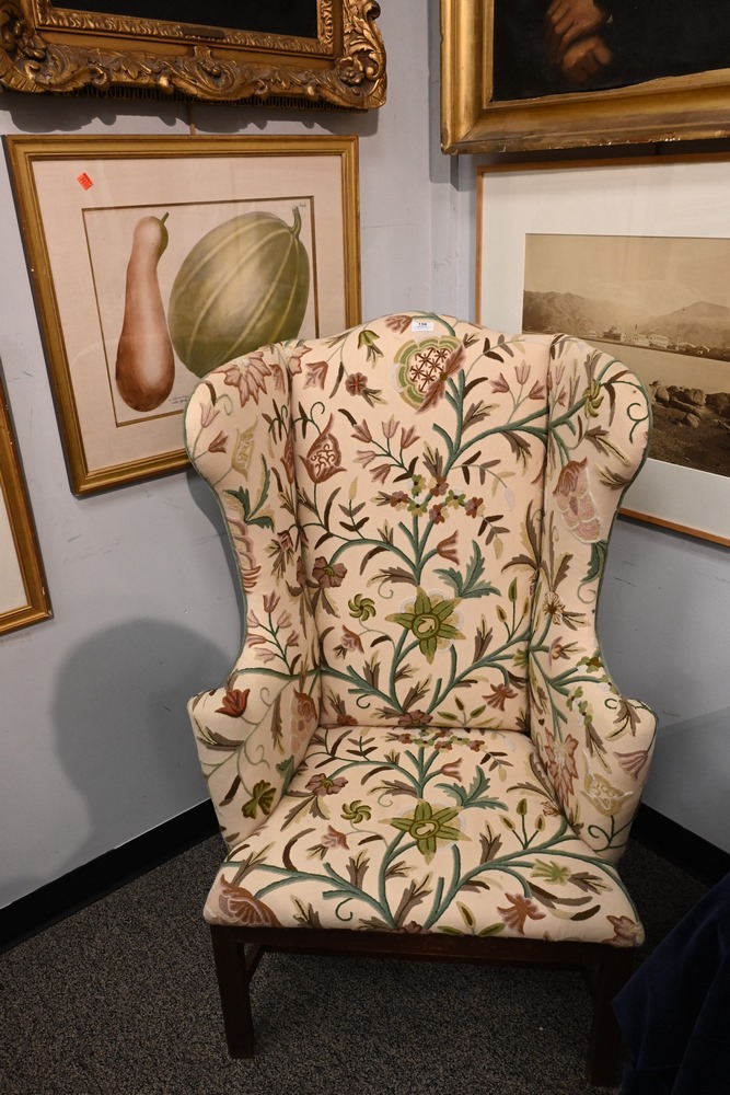 Lot 156: Chippendale Maple Upholstered Wing Chair in crewel work upholstery set on base with squared legs with H stretchers height 46 inches, seat height 16 inches