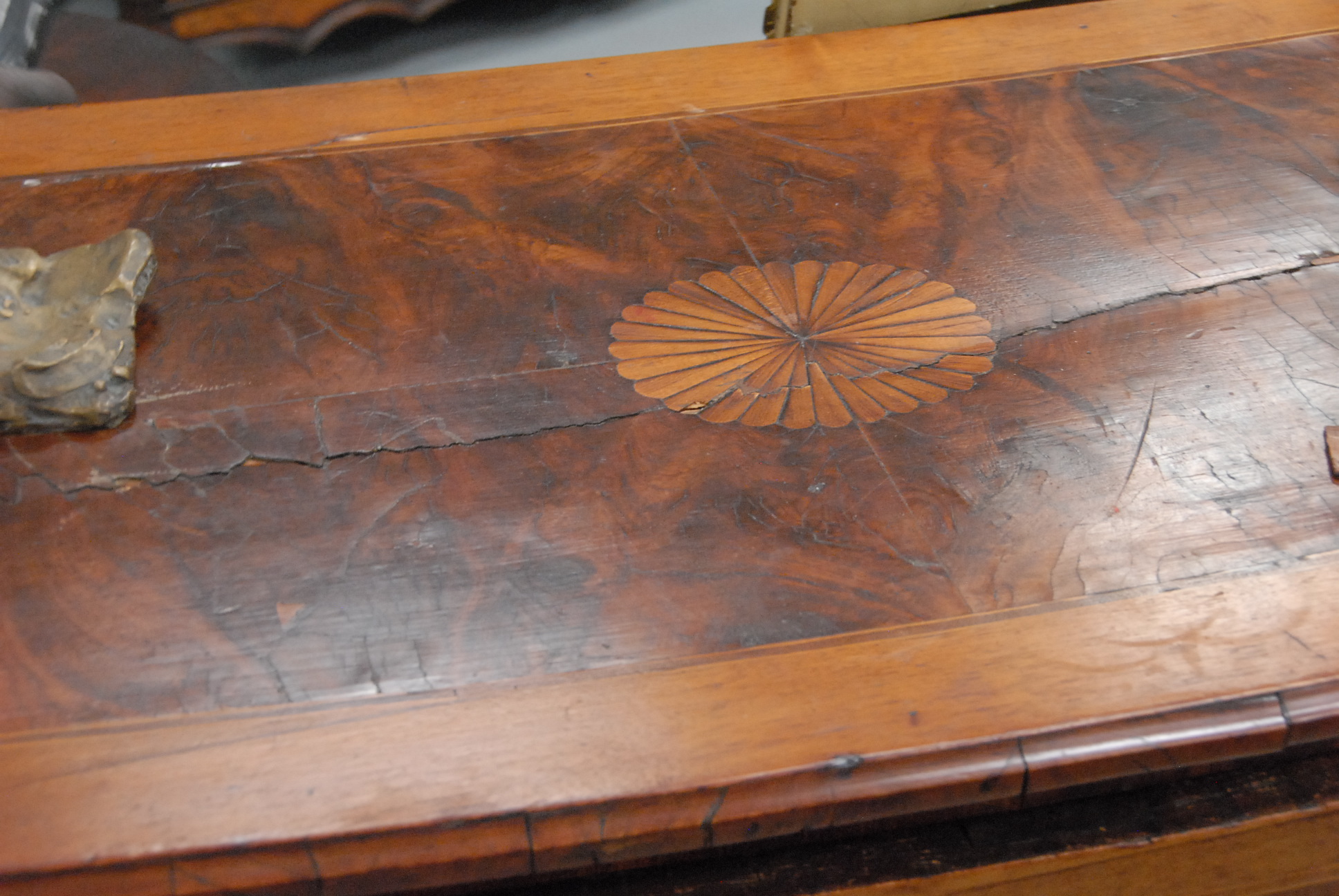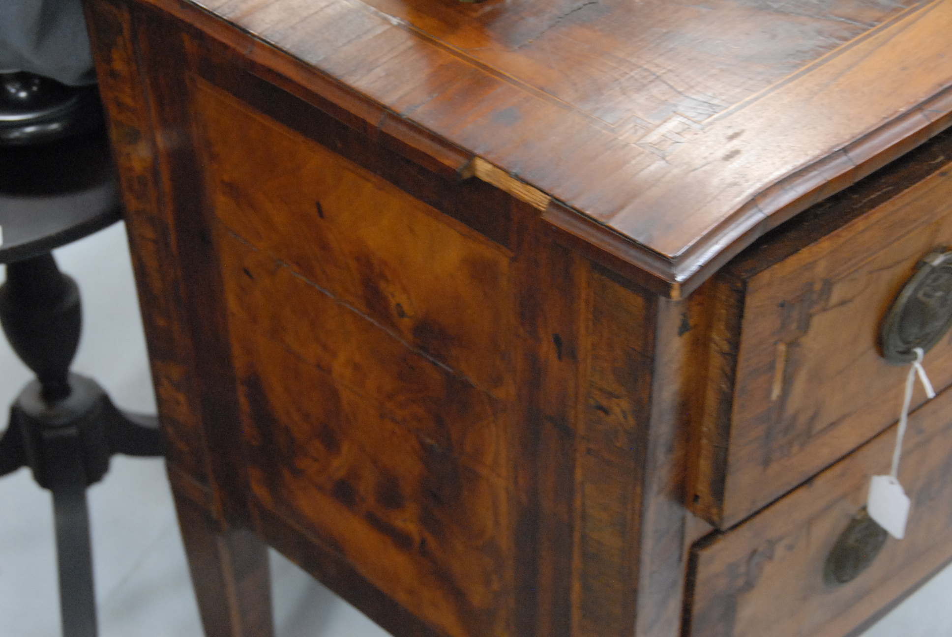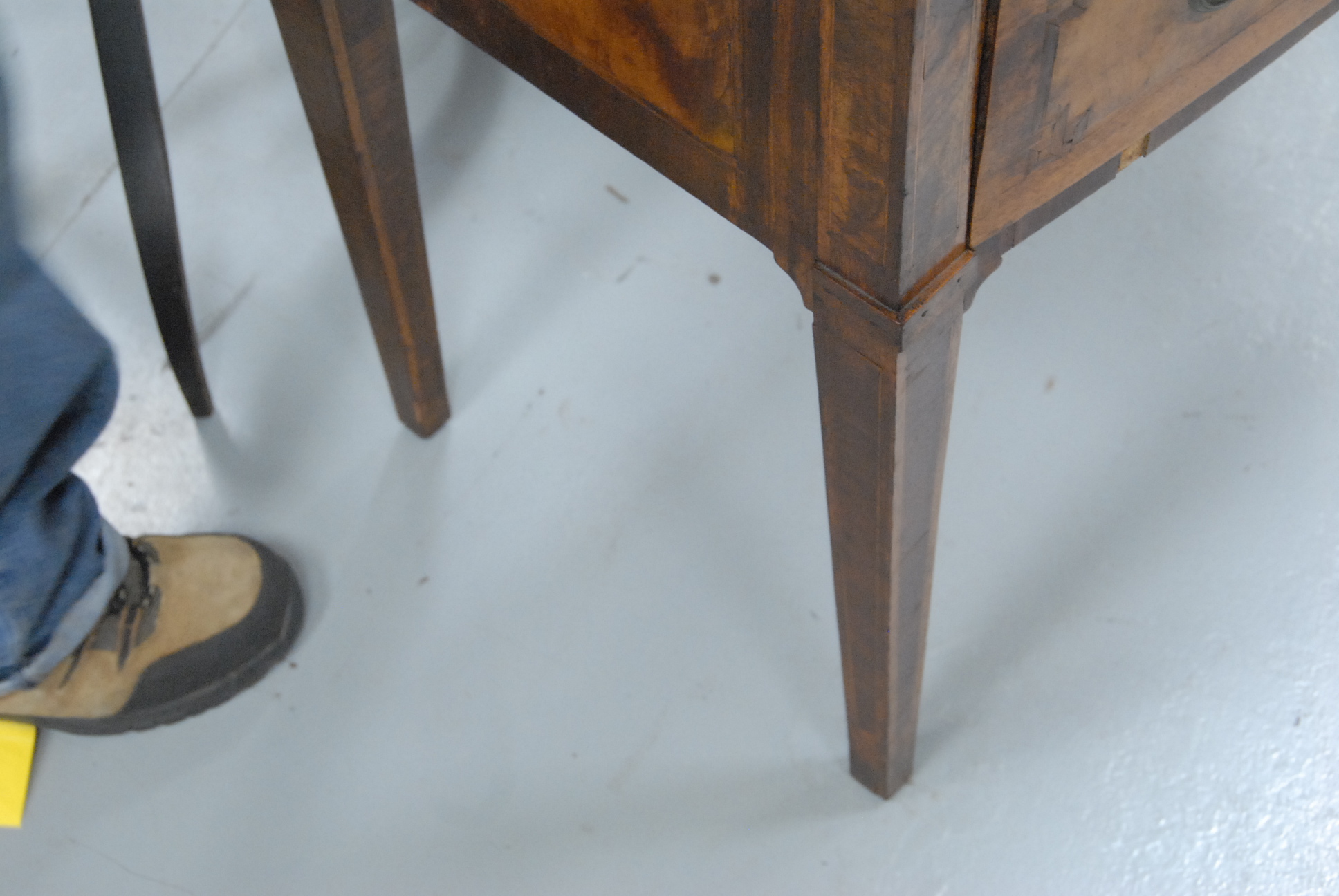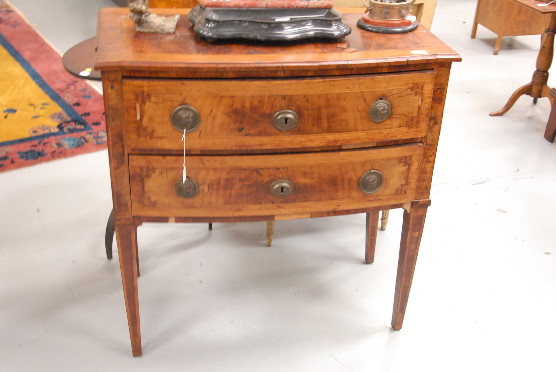 Continental server bowfront mahogany & mahogany veneer with line inlays, two drawers on square tapered legs, original brasses, late 18th to early 19th century, southern Germany or northern Italy.