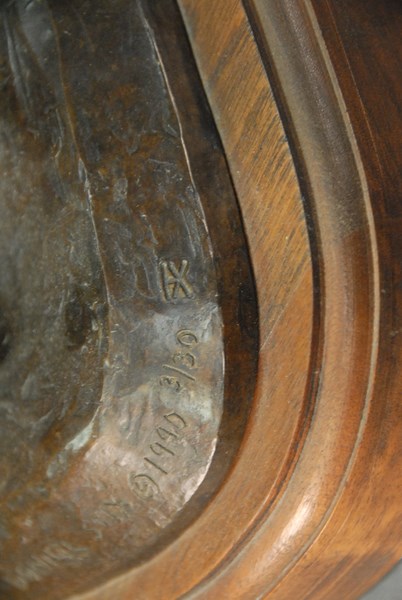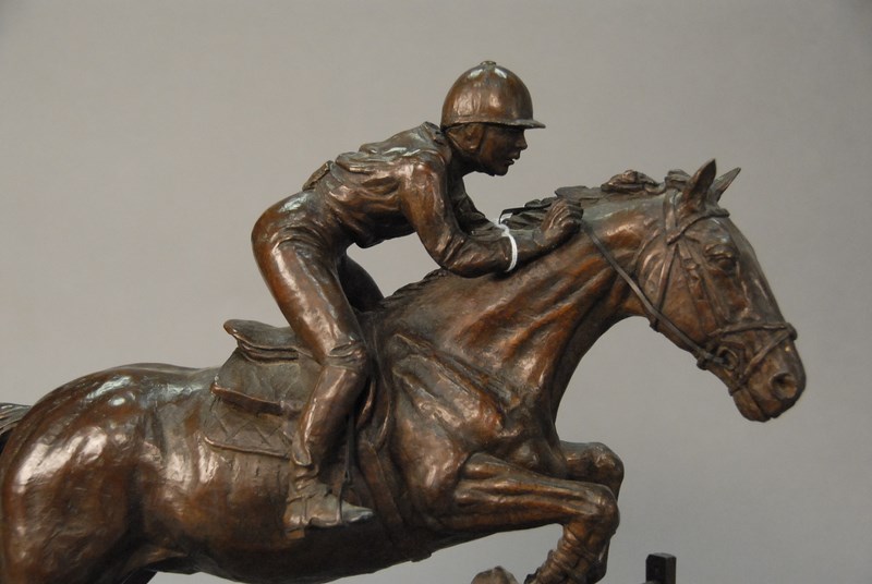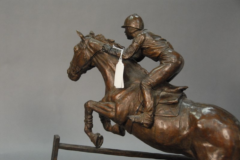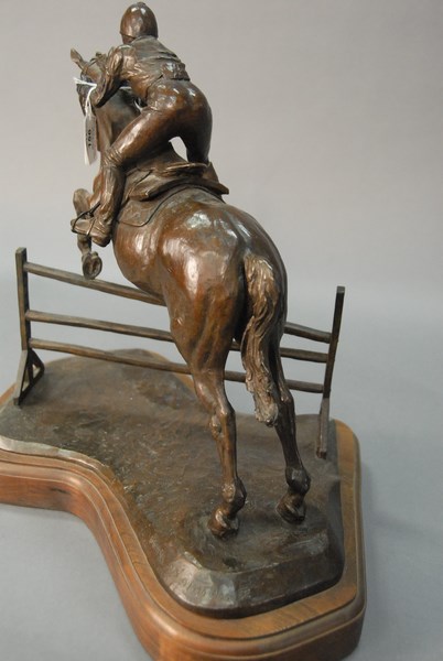 Lot 156: Dan Stix Bronze Horse and Rider Jumping Fence on wood base signed Daniel Stix 1990 3/30 along with wood pedestal ht. 17in. lg. 18in.