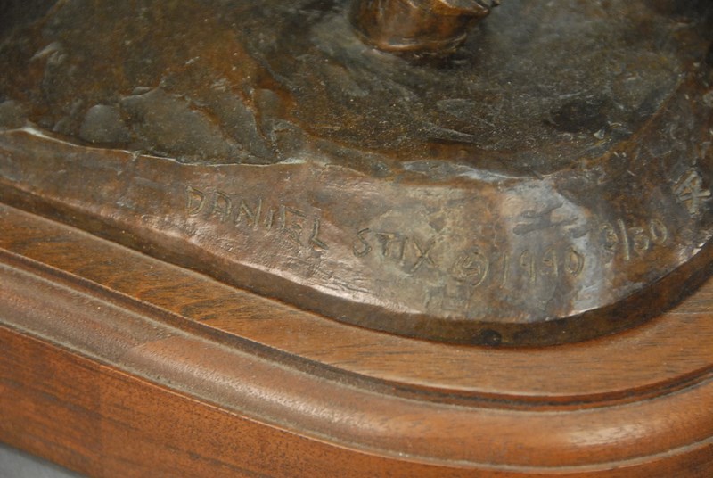Dan Stix Bronze Horse and Rider Jumping Fence on wood base signed Daniel Stix 1990 3/30 along with wood pedestal ht. 17in. lg. 18in.