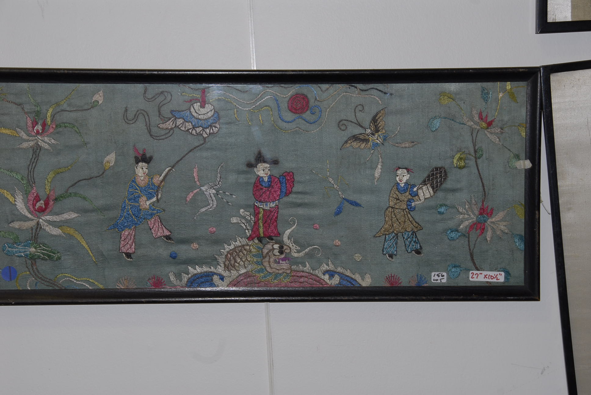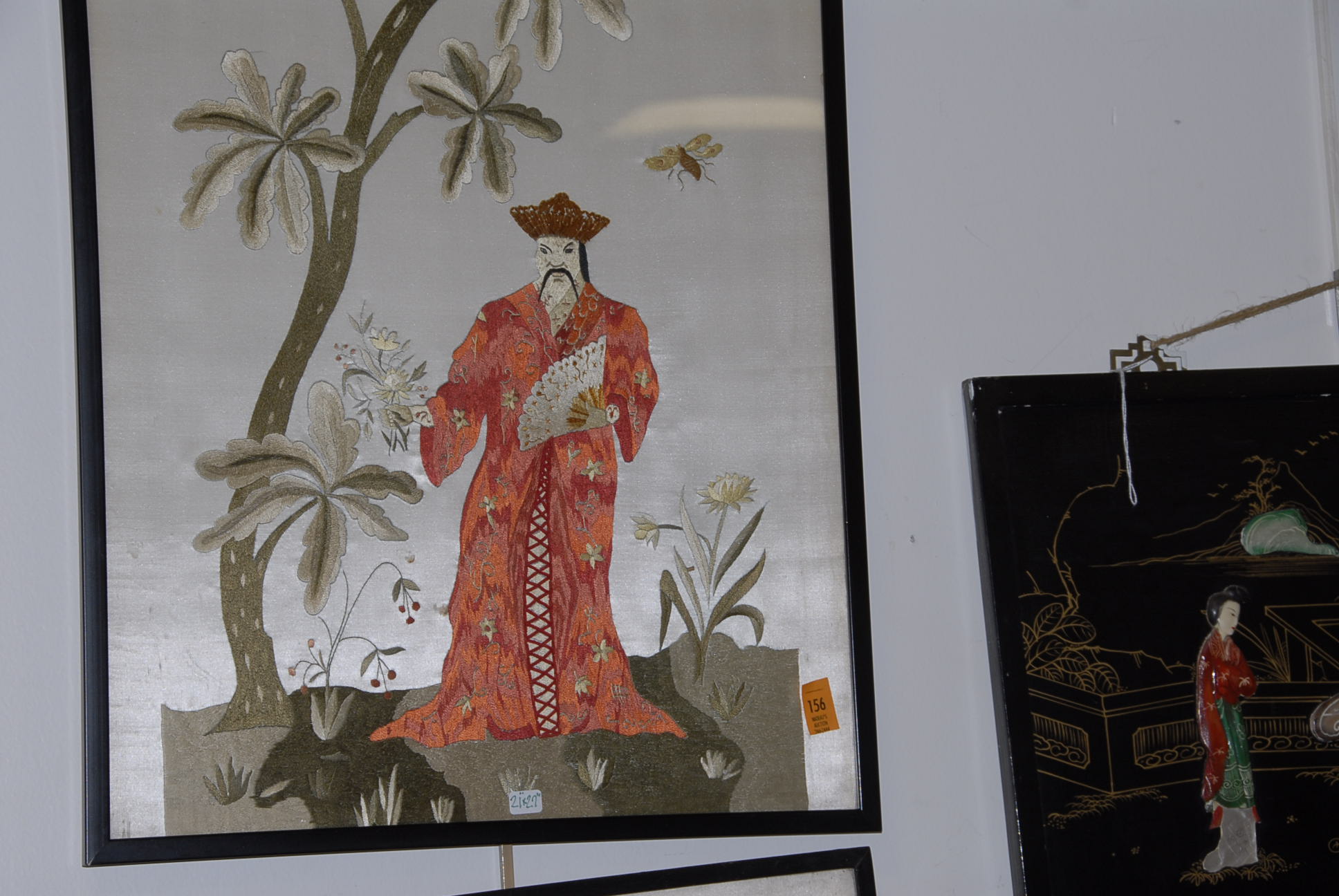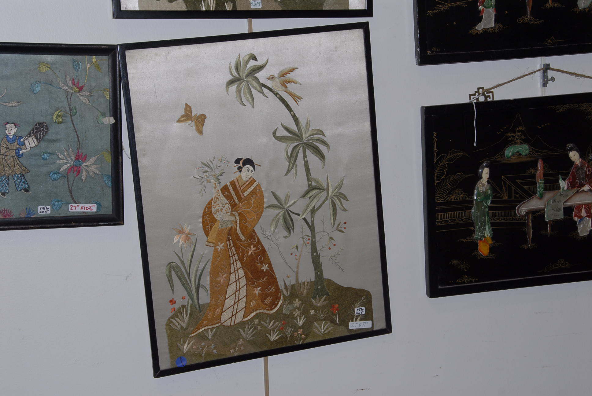 Five Oriental wall hangings, three are embroidered