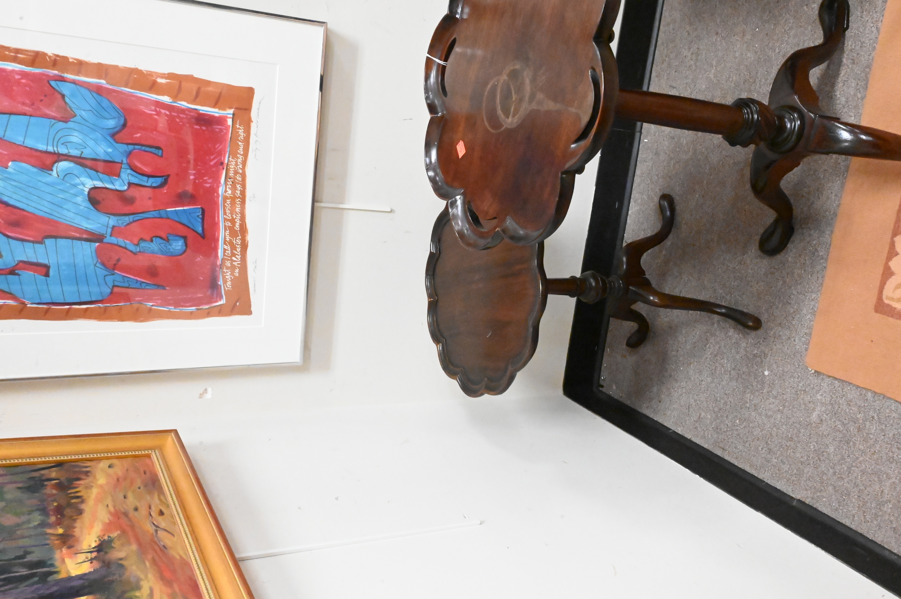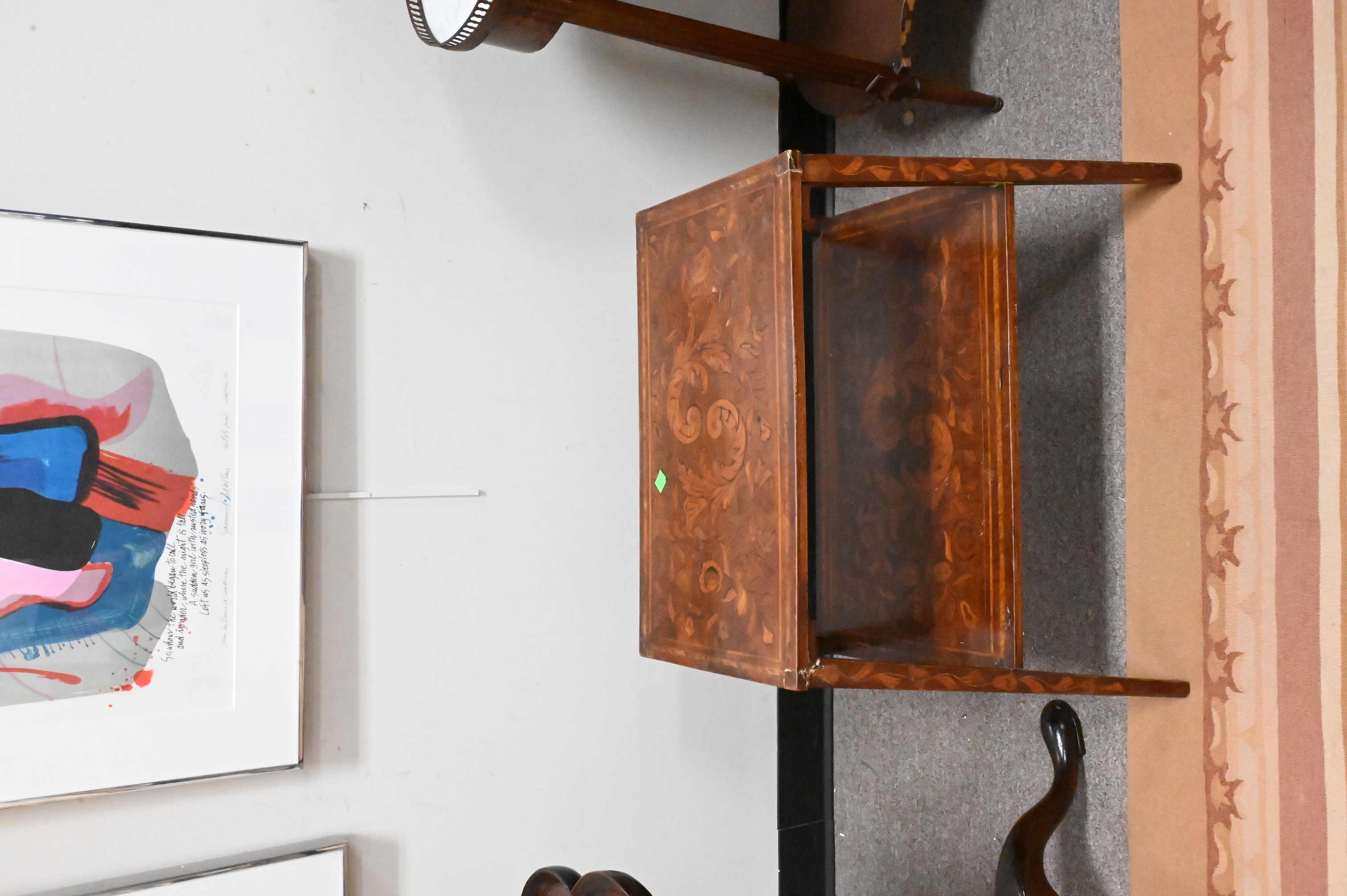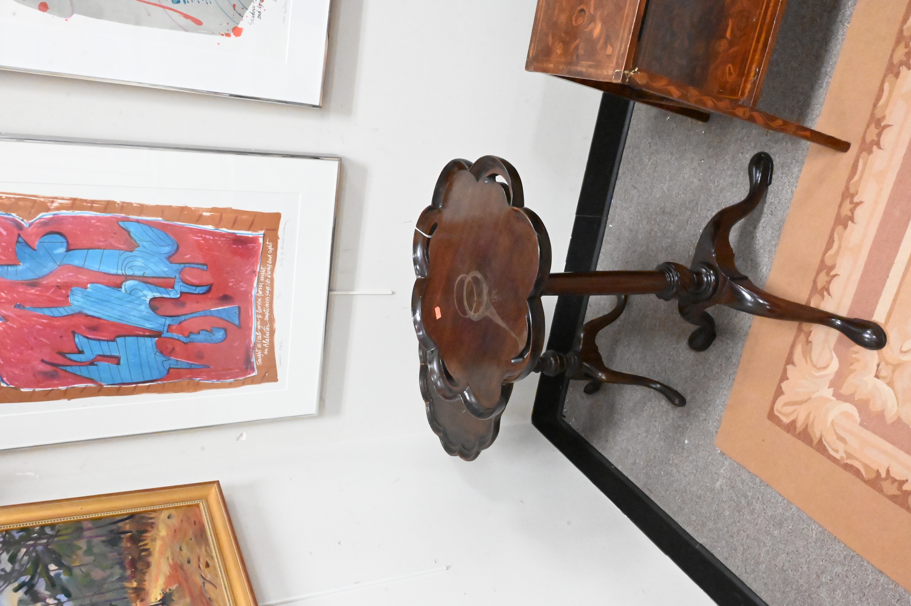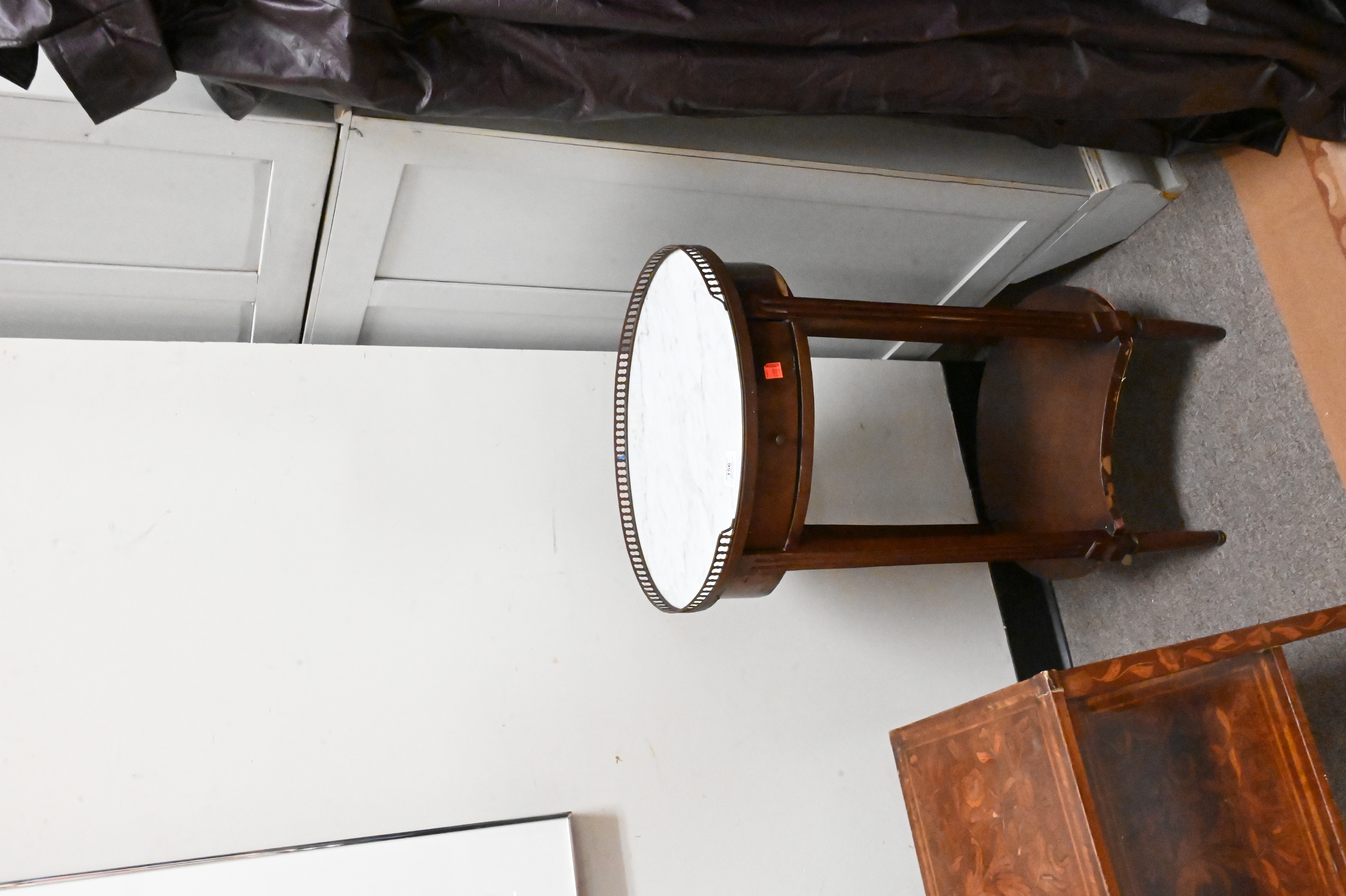 to include two shaped stands including one English mahogany dish top tripod candle stand circa 1900, one marble top stand with drawer, and one marquetry inlaid table