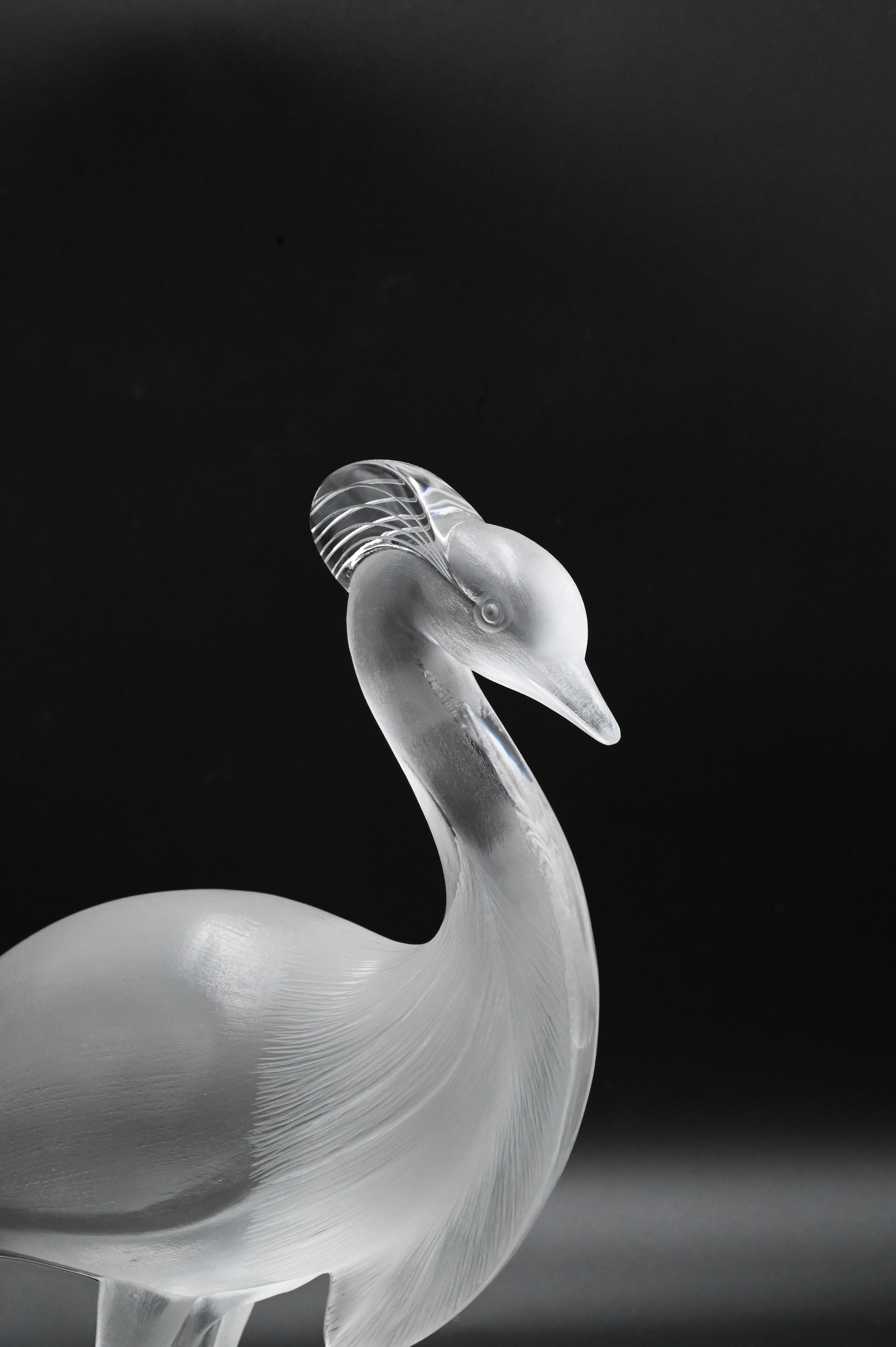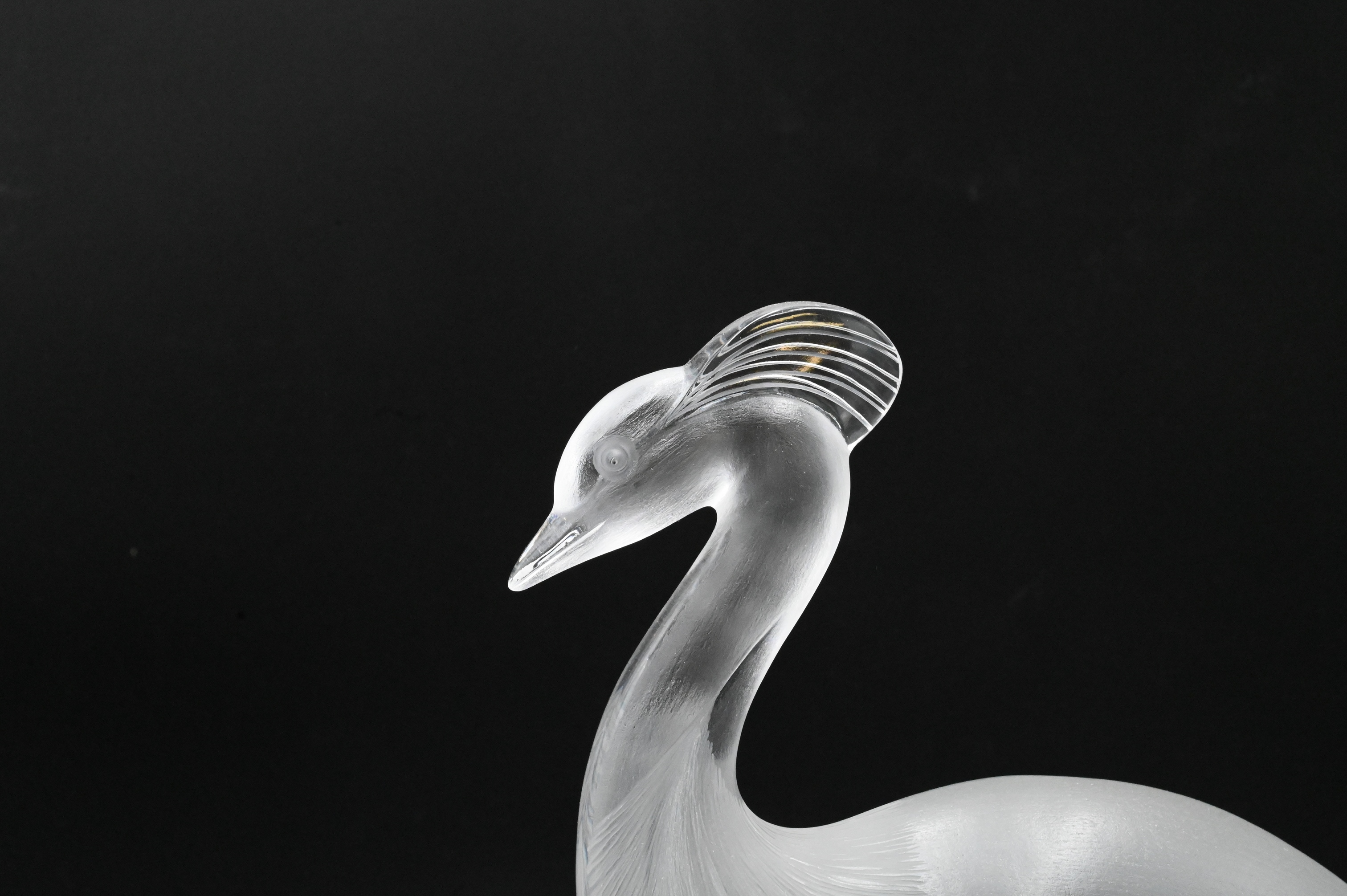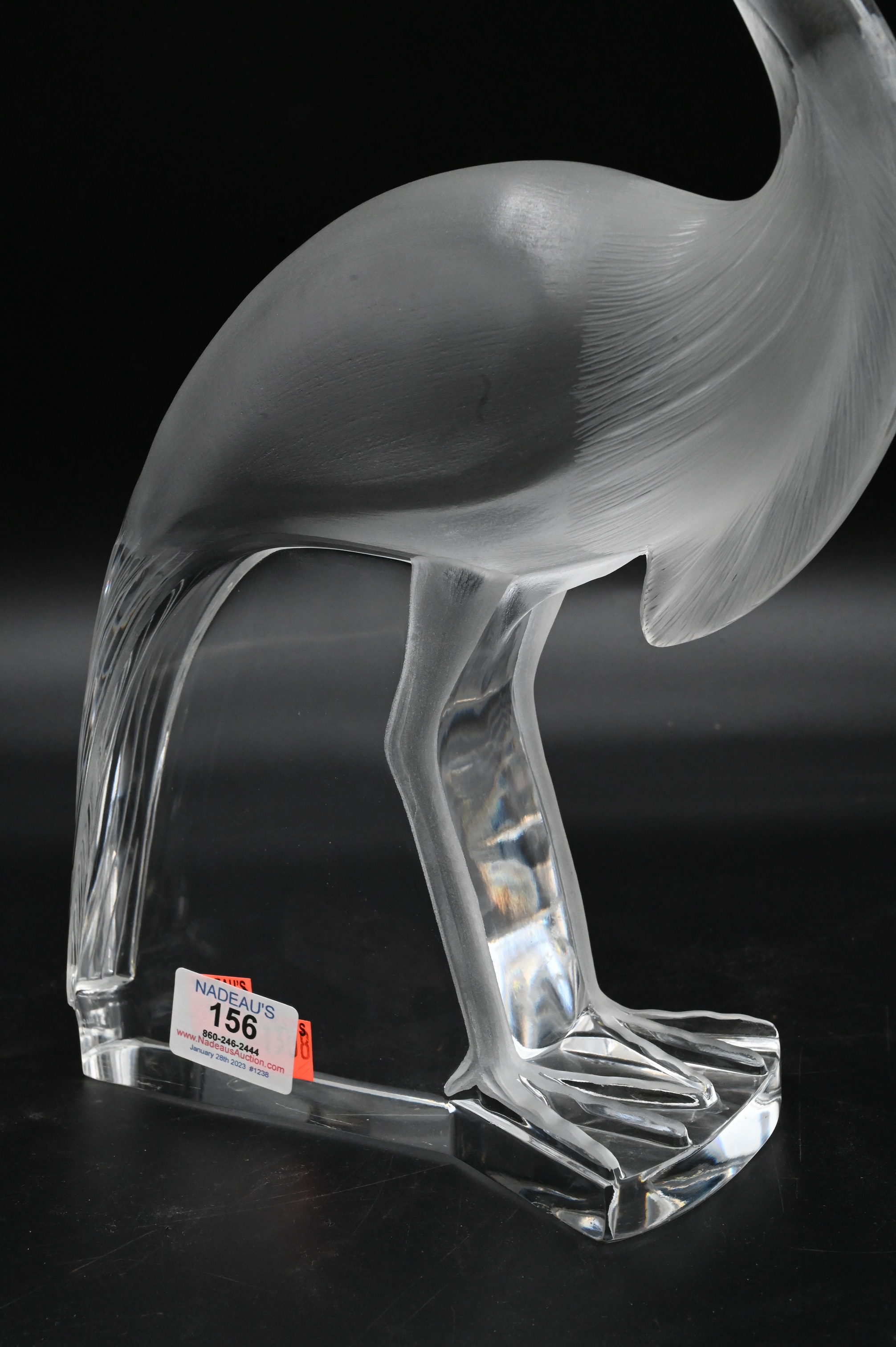 Lalique Louisiane Crystal Peacock, having frosted body with clear base, signed ‘Lalique France’ on bottom, height 13 1/2 inches.