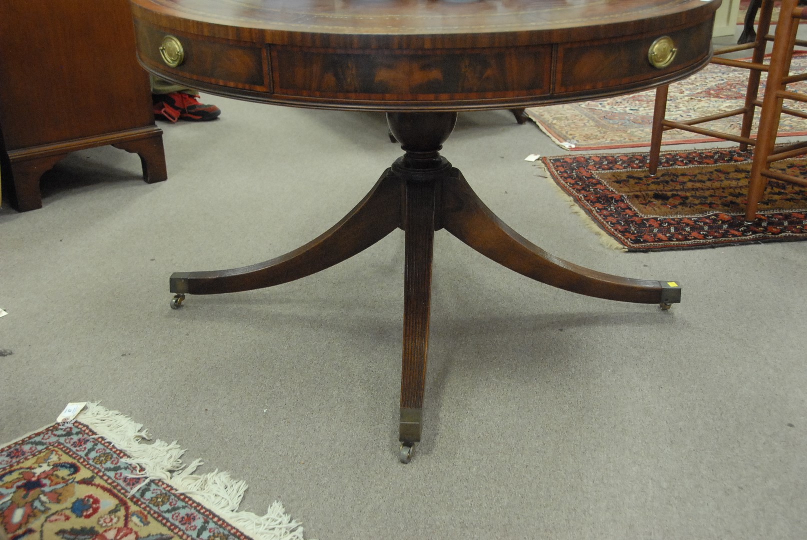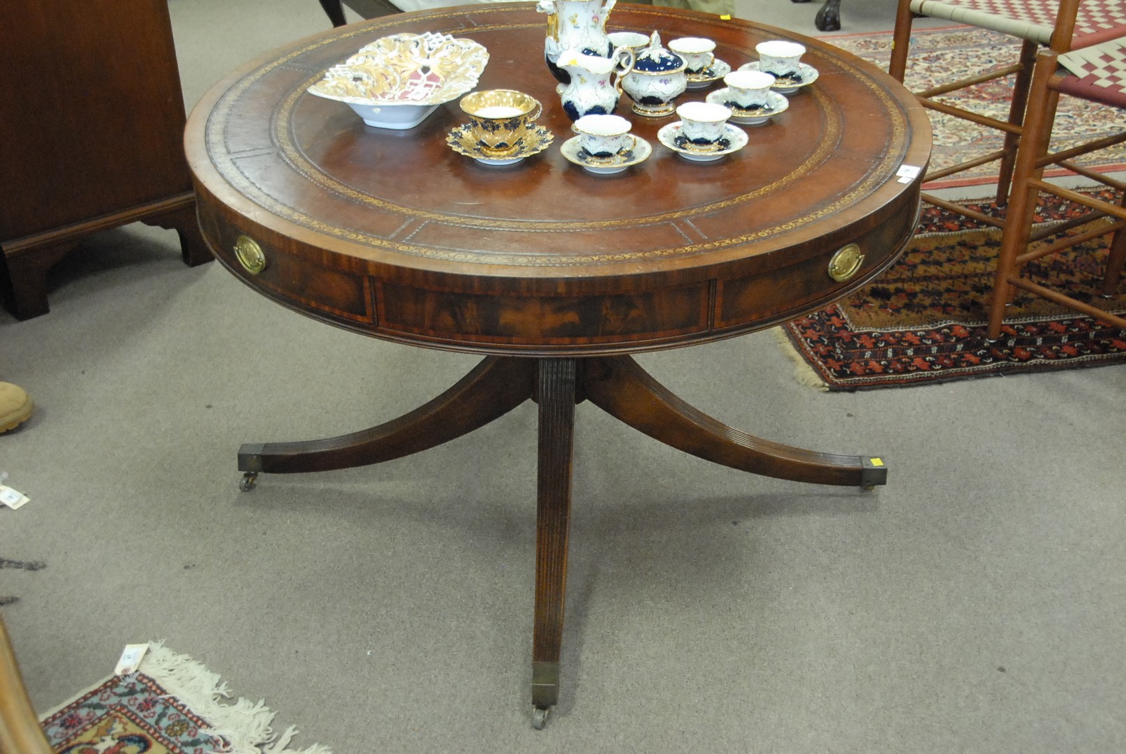Large mahogany drum table with leather top. ht 28 1/2/ dia.44