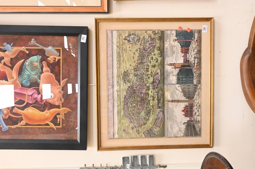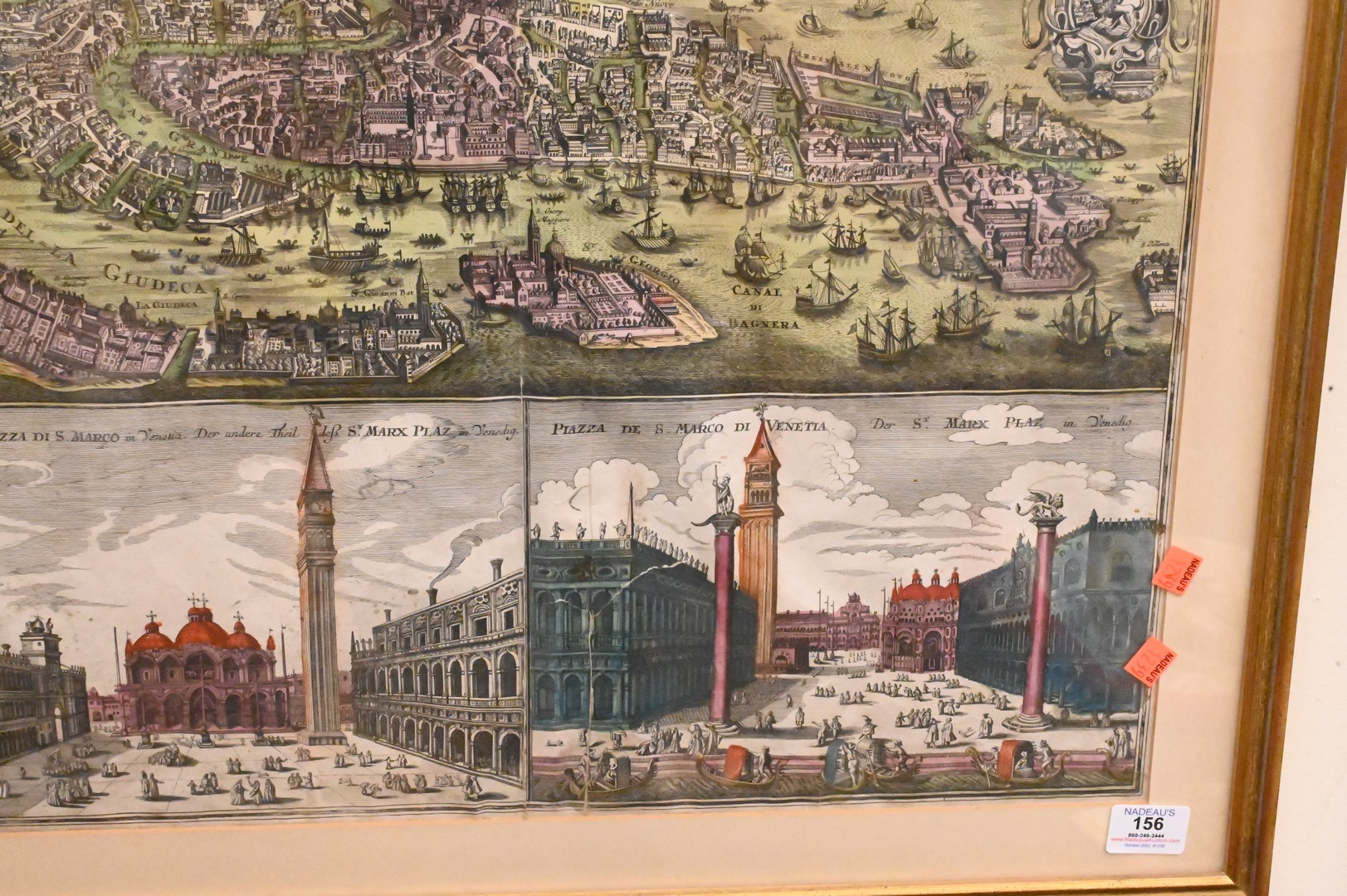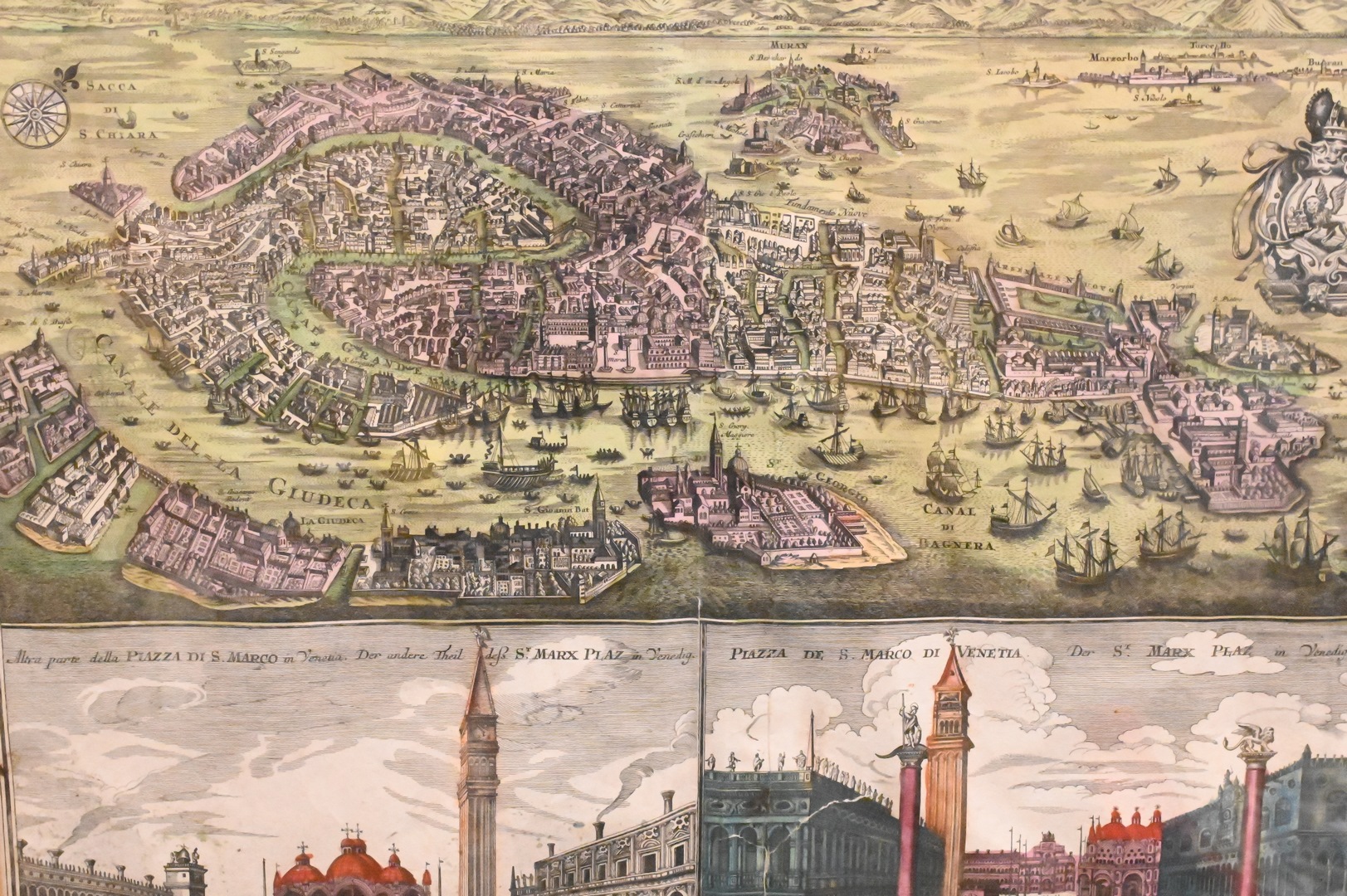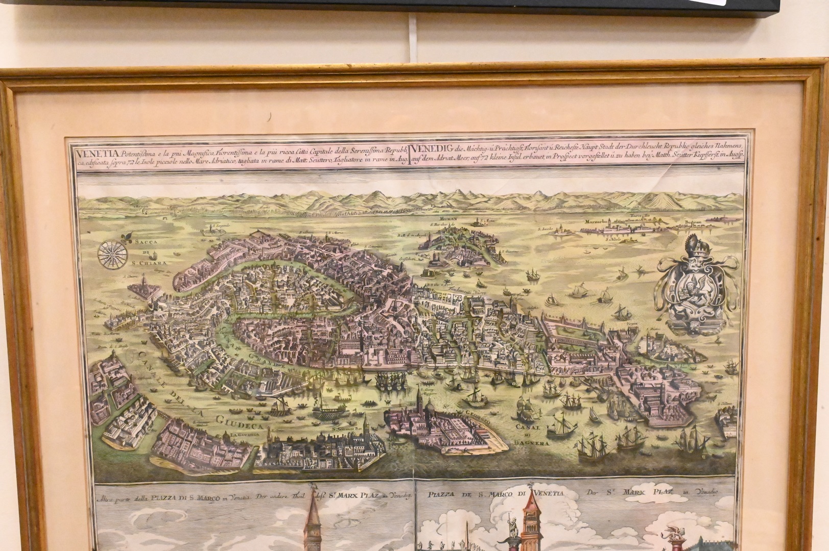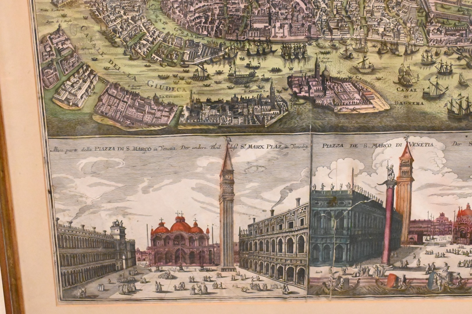 Matthaus Seutter, hand colored engraving, birds eye view of Venice, Piazza Di S. Marco in Venezia/Piazza de S. Marco Di Venetia, sight size 20″ x 22″.