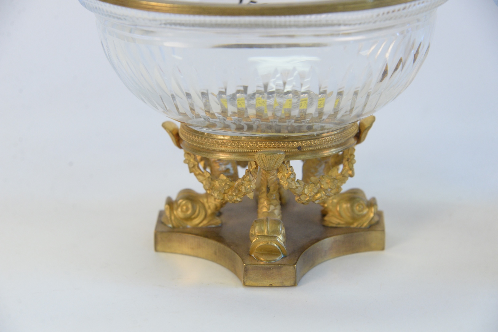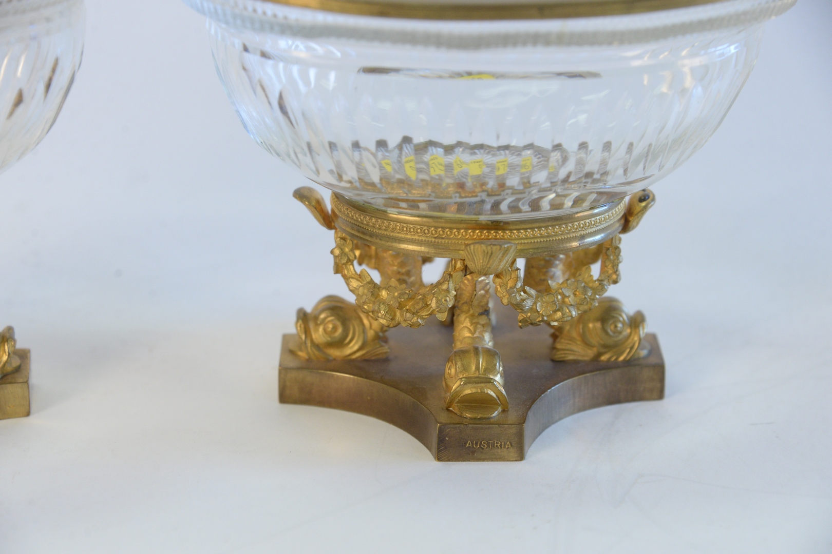 Lot 156: Pair Crystal and Gilt Bronze Oval Dishes, on gilt bronze dolphin bases, height 4 1/2 inches, top 4 1/4 x 5 7/8.