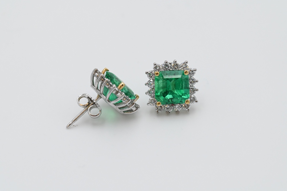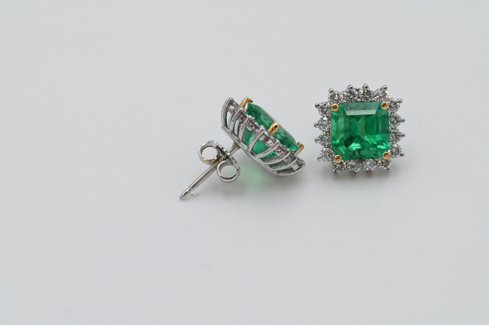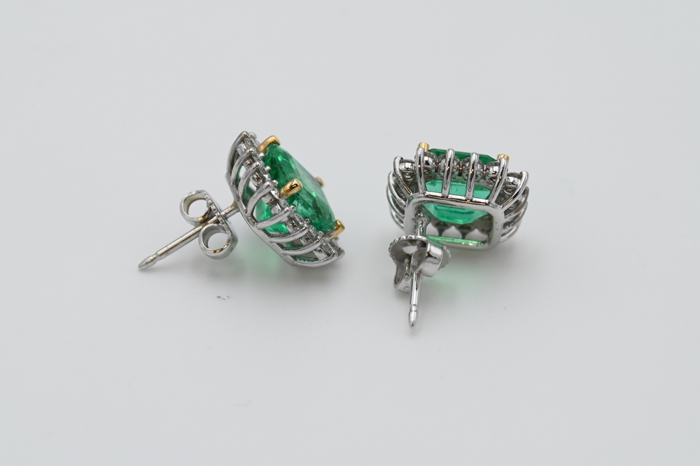 Pair of 18 Karat White Gold and Emerald Earrings, total emerald weight 5.13 carats, surrounded by 32 brilliant cut diamonds, total weight 1.17 carats; along with EGL report and appraisal.