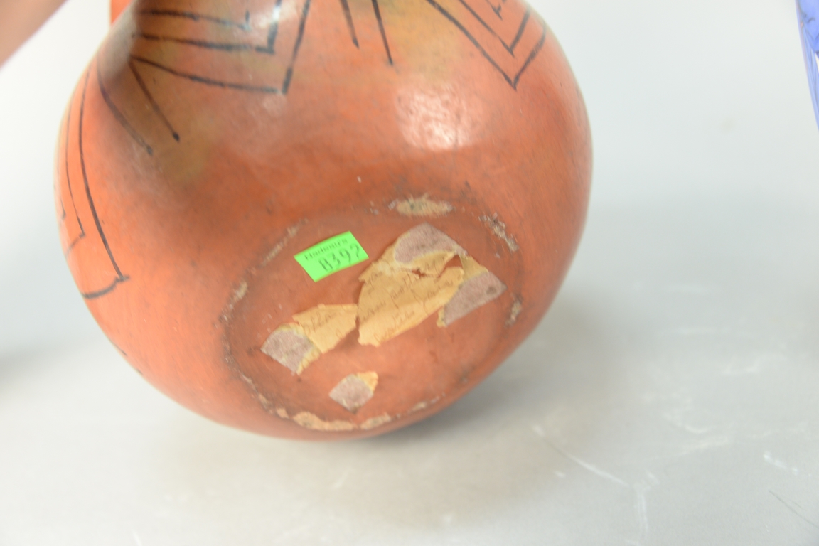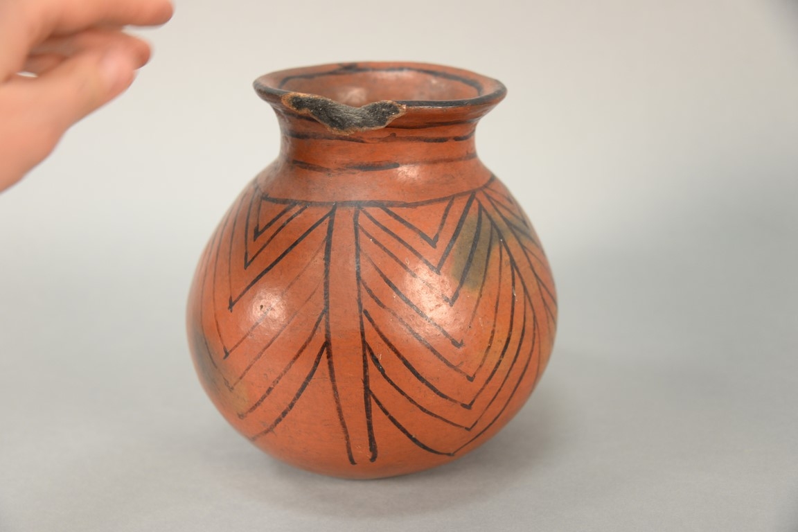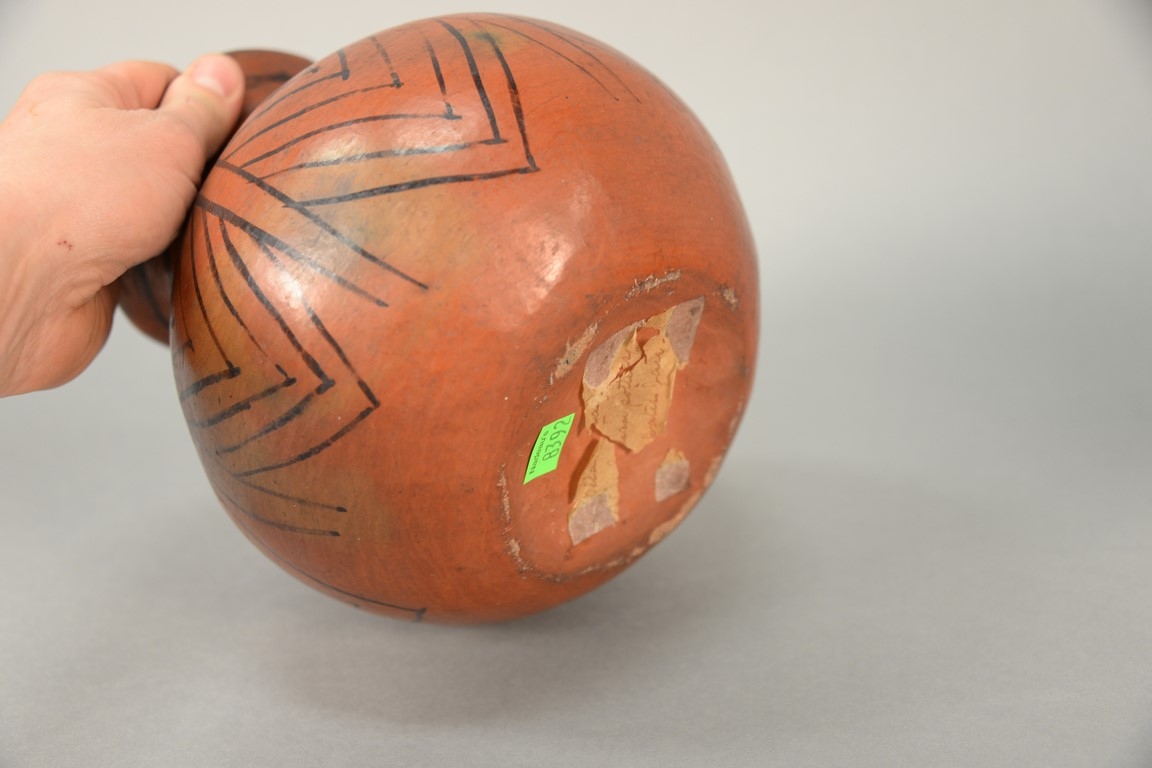 Lot 156: Southwest U.S. Indian pottery pot, red with black geometric designs. rim chips height 8 1/2 inches