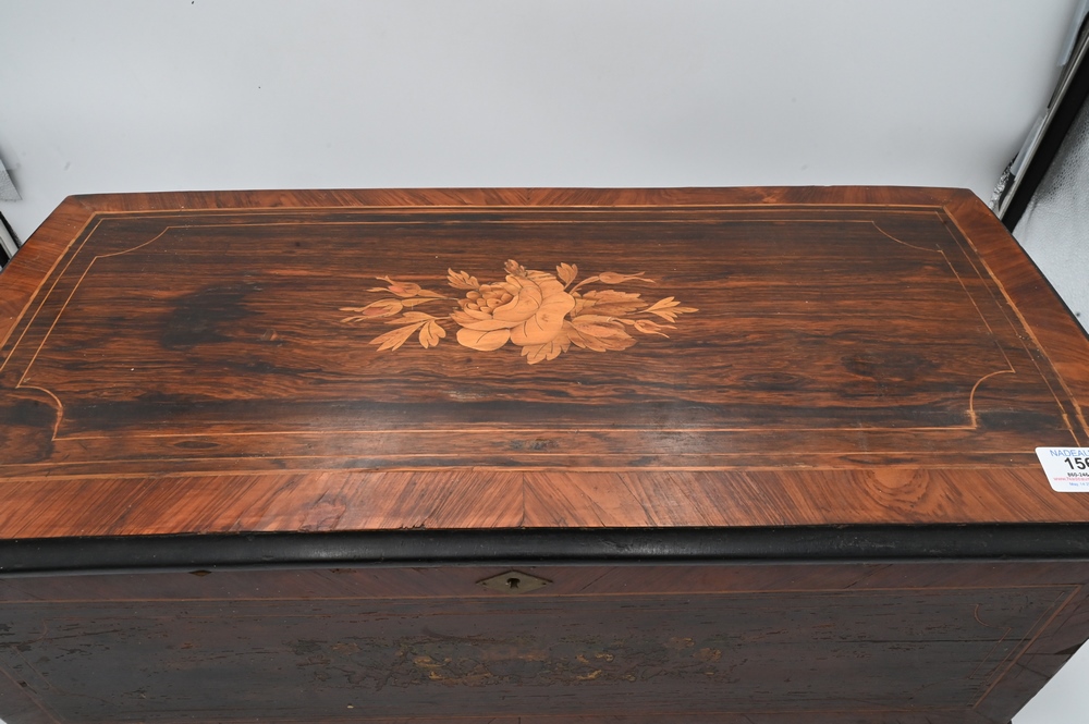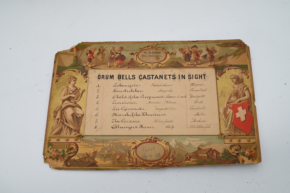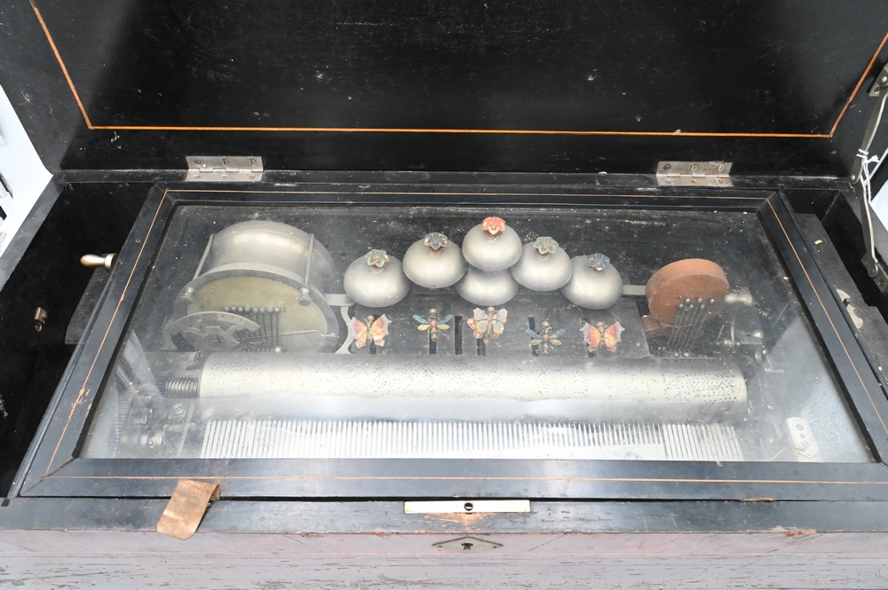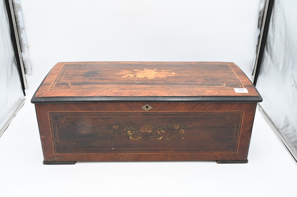 Lot 156: Swiss 8 Airs Music Box, having 15 1/4 inch cylinder, drum bells, castanets in sight in inlaid rosewood case.