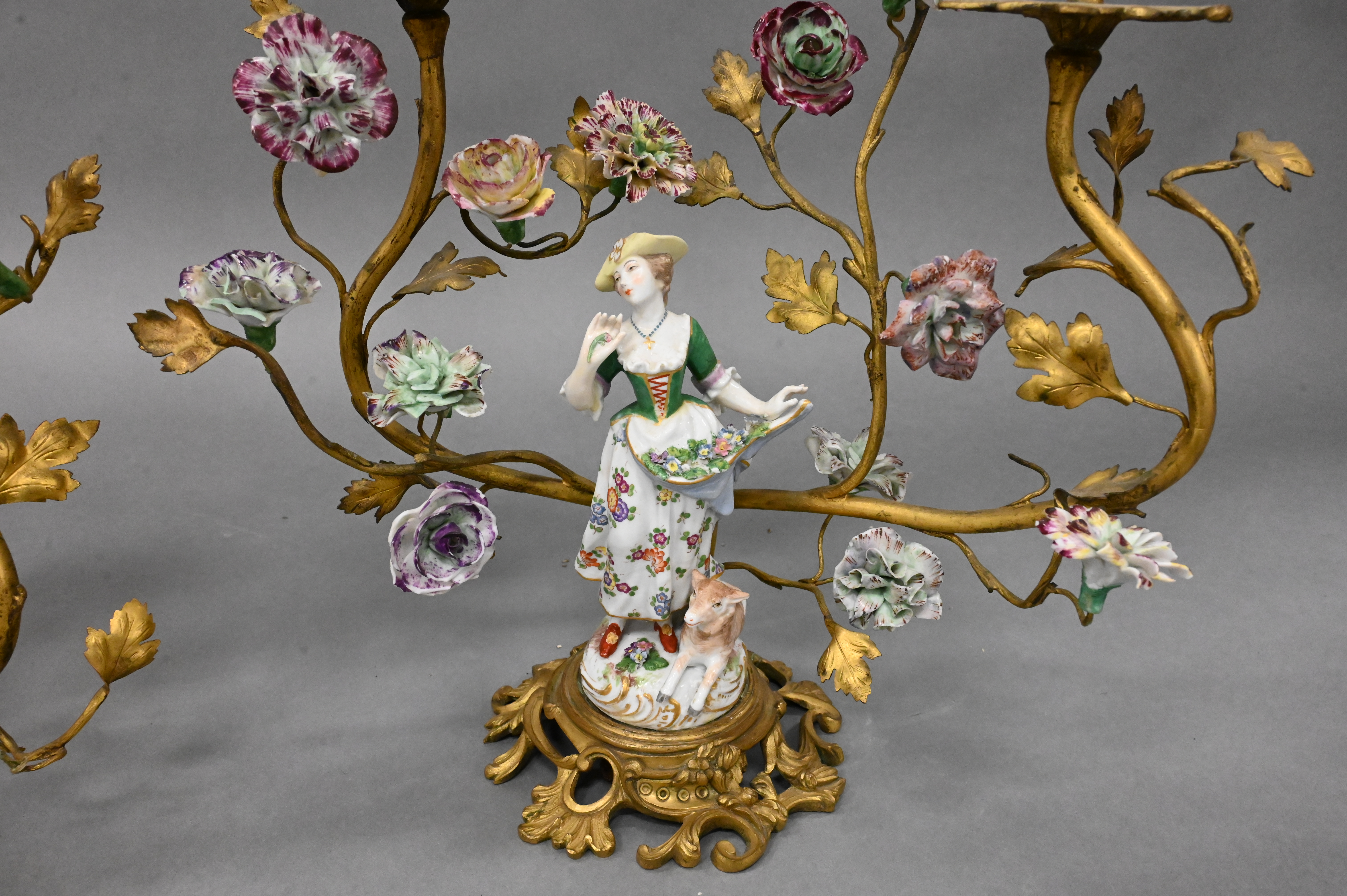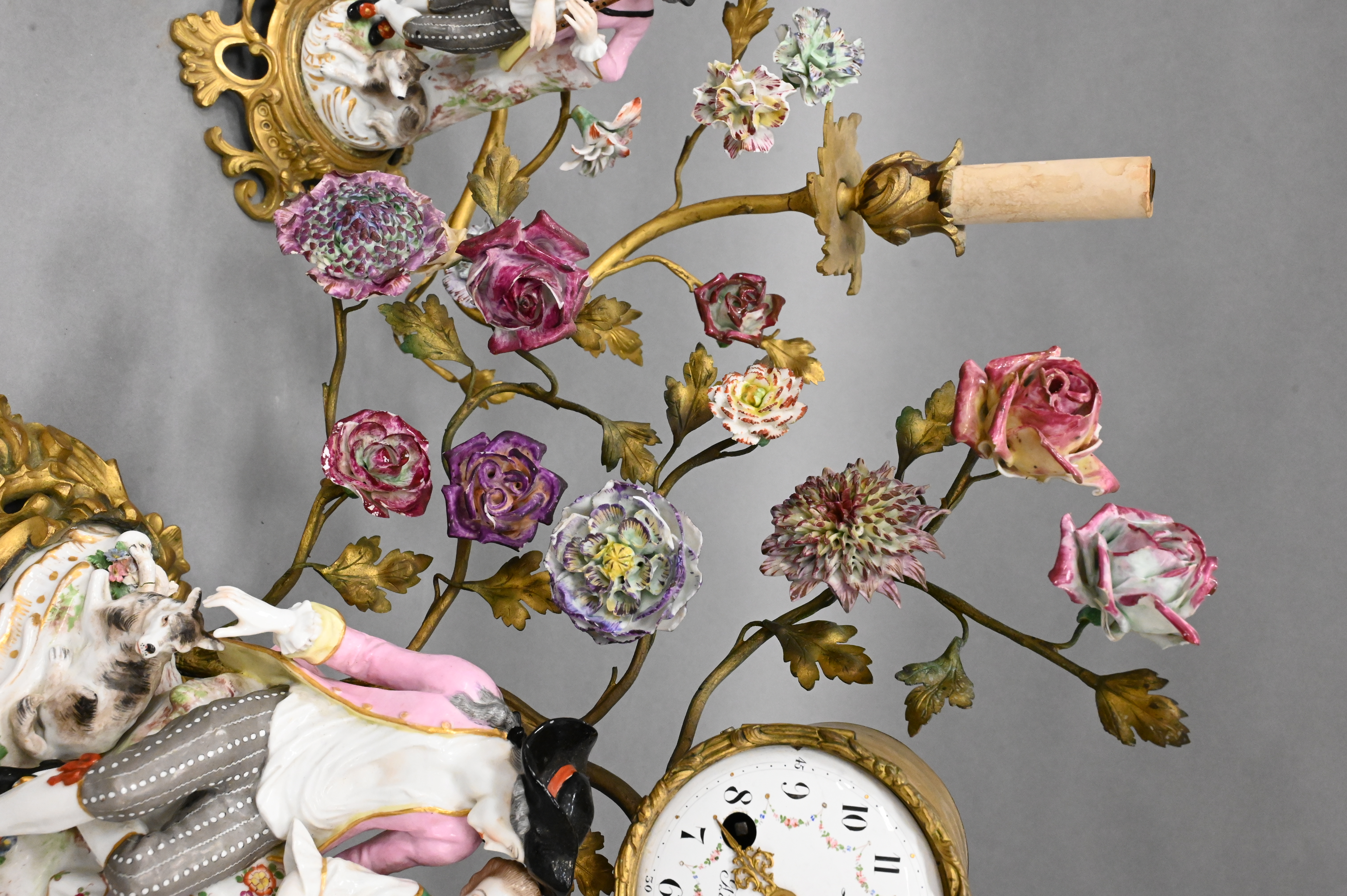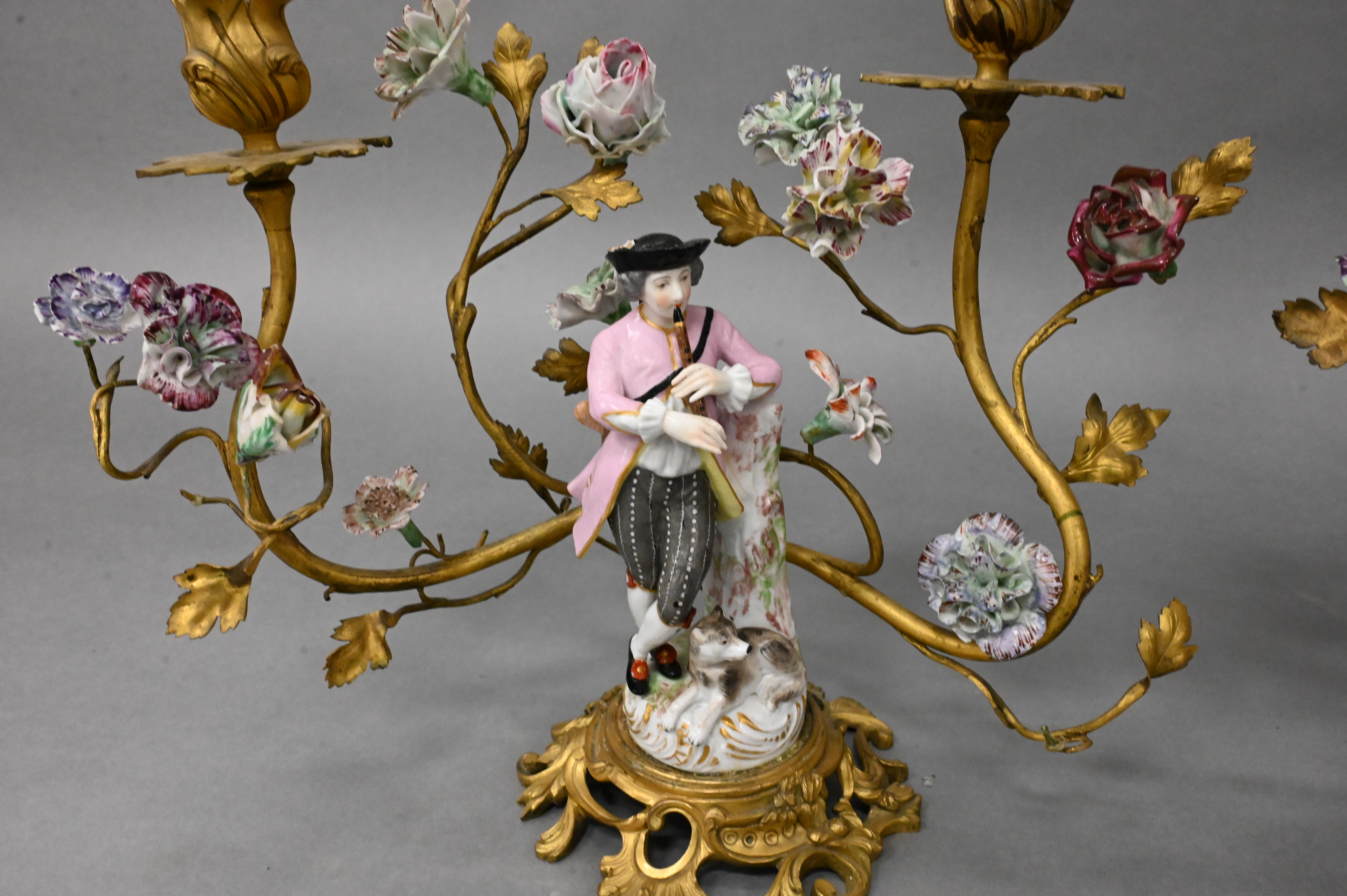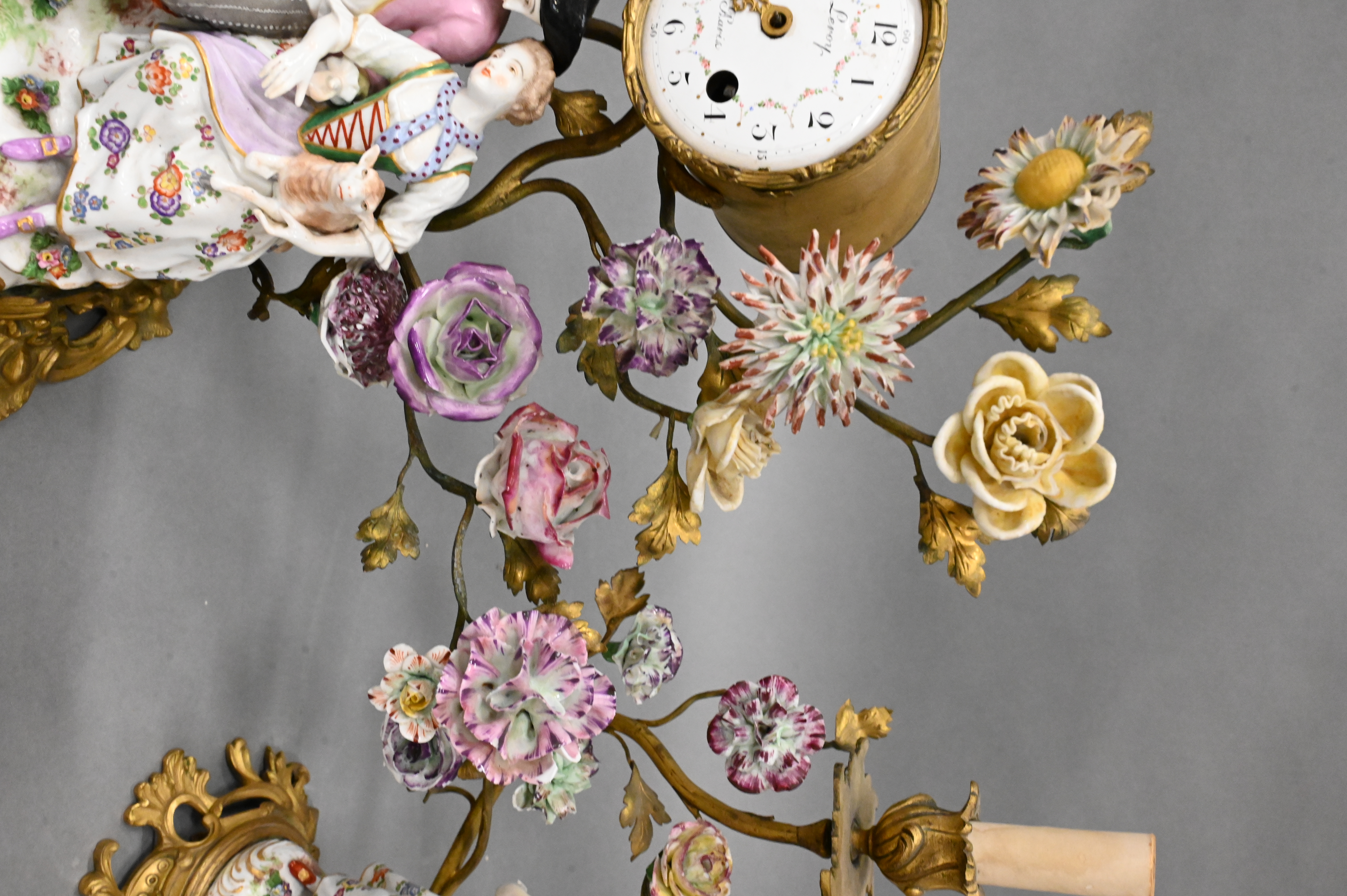 an elaborate three-piece garniture comprising a central mantel clock and a pair of two-light candelabra, each richly mounted with hand-painted German porcelain figures in 19th-century pastoral dress, the clock surmounted by an enameled dial with open escapement, framed by gilt-metal foliate mounts and flanked by a courting couple seated upon a rocaille-molded porcelain base adorned with applied flowers, sheep, and scrolling gilt details, the candelabra each centered by a standing shepherd or shepherdess figure modeled in polychrome porcelain, raised on scroll-cast gilt-metal bases, crossed swords mark to verso