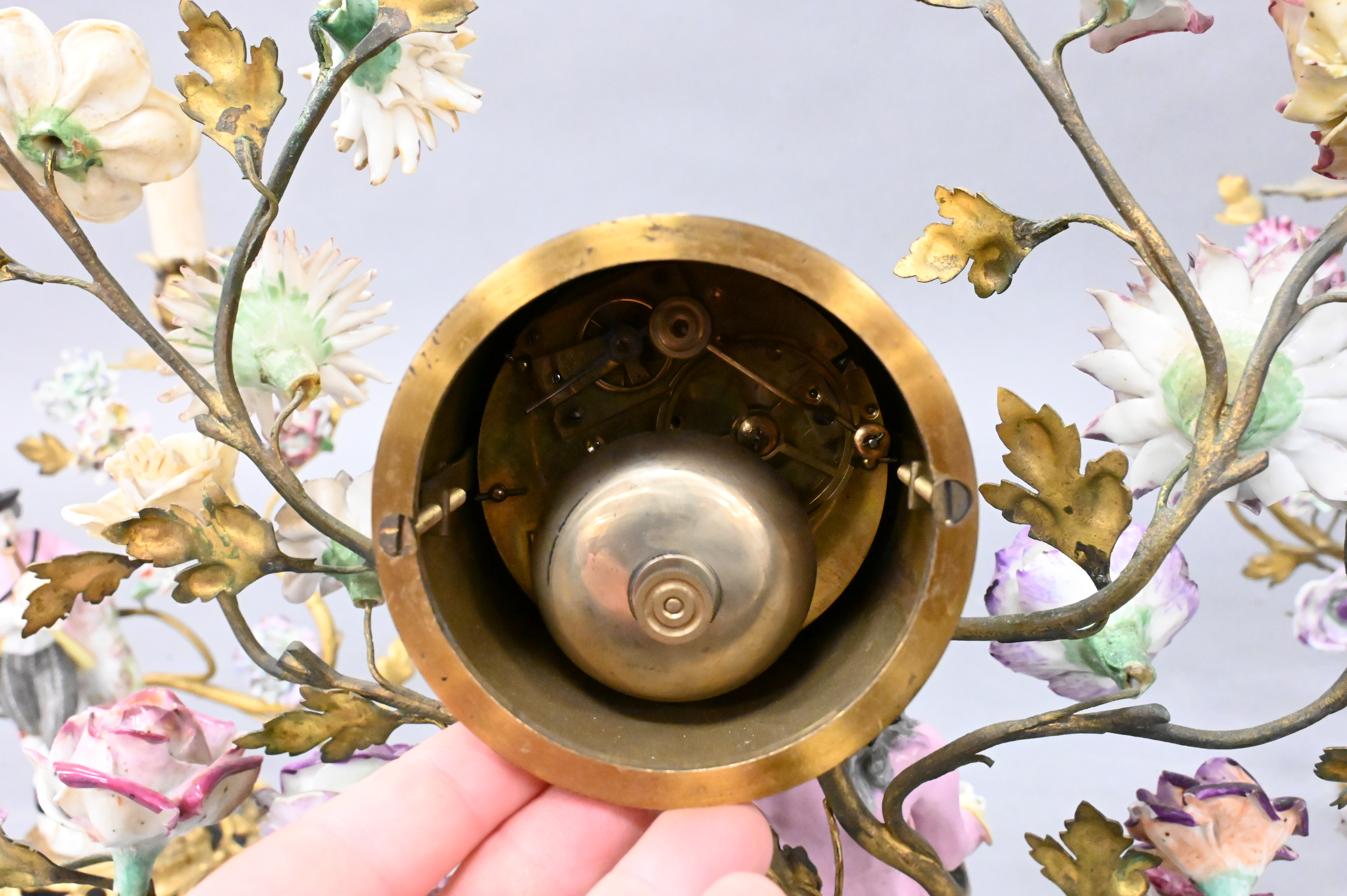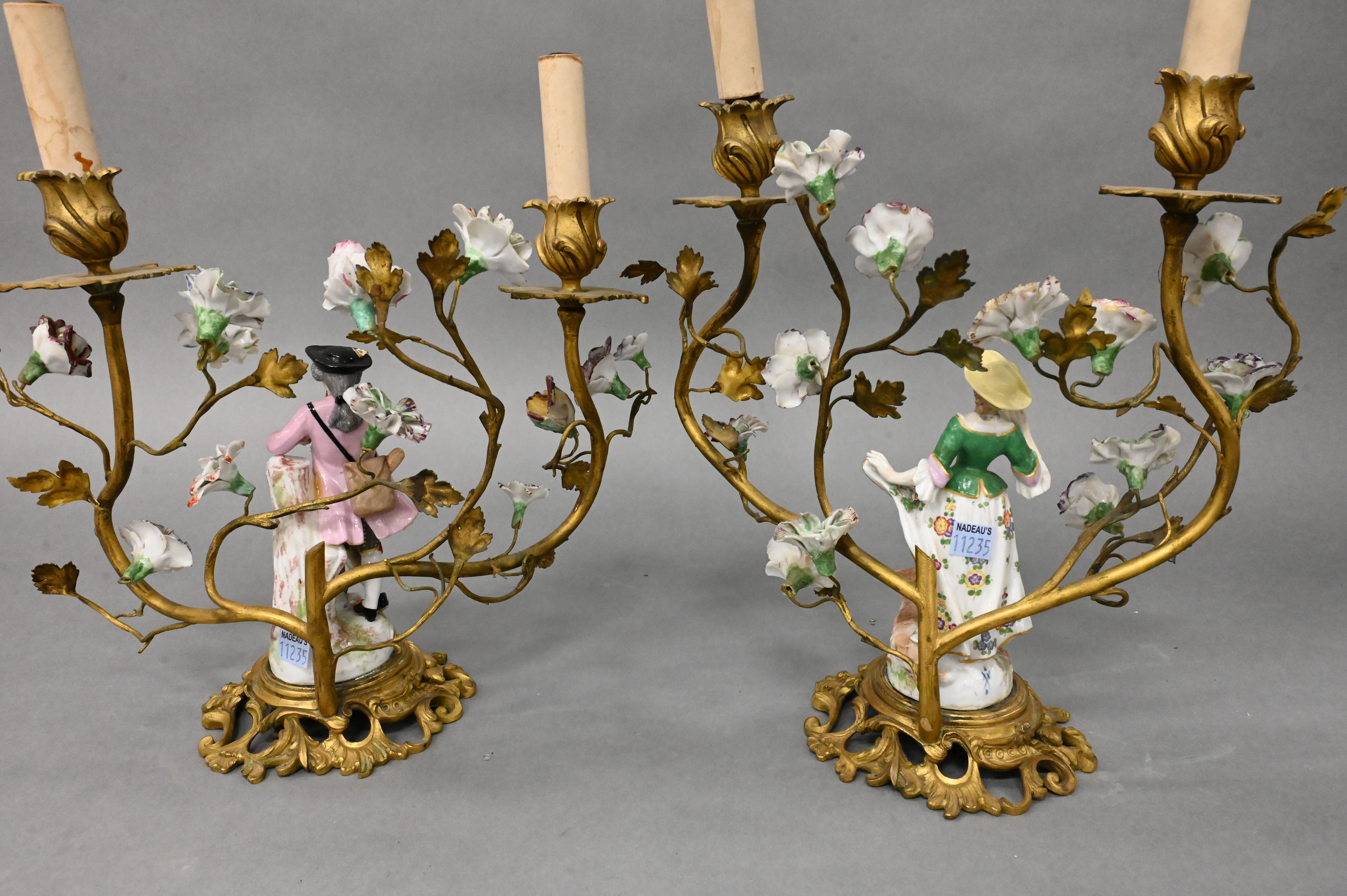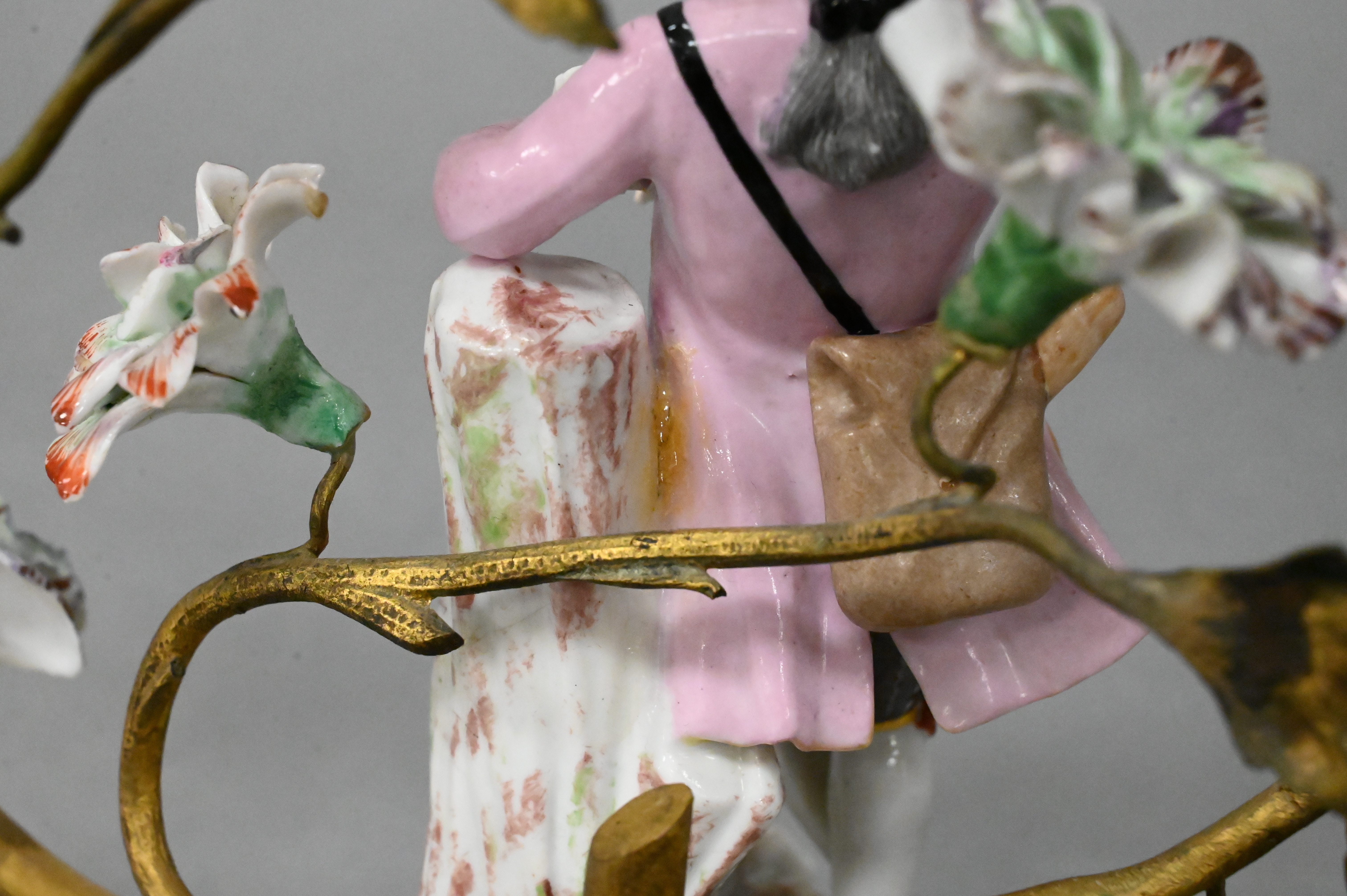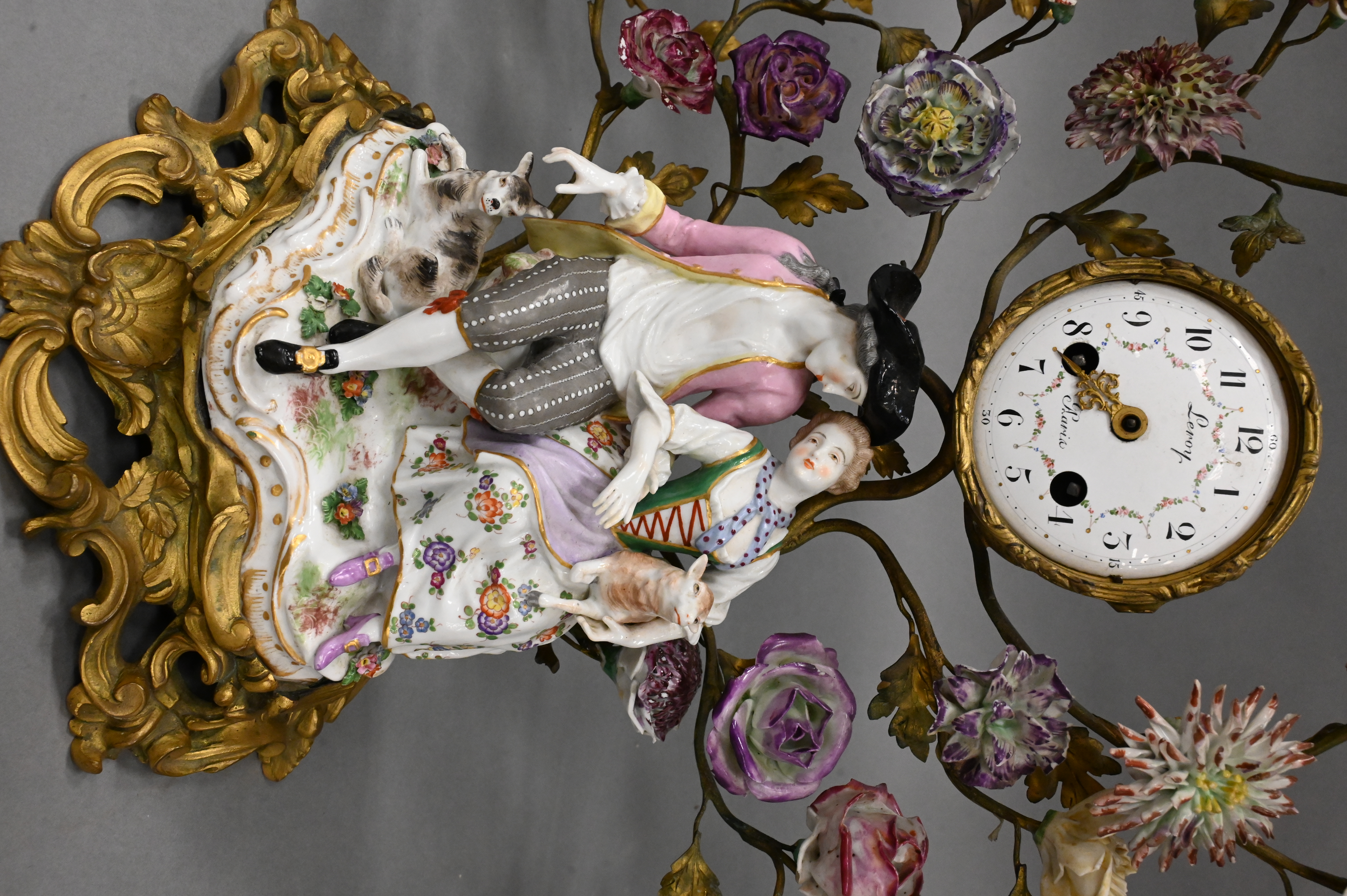 an elaborate three-piece garniture comprising a central mantel clock and a pair of two-light candelabra, each richly mounted with hand-painted German porcelain figures in 19th-century pastoral dress, the clock surmounted by an enameled dial with open escapement, framed by gilt-metal foliate mounts and flanked by a courting couple seated upon a rocaille-molded porcelain base adorned with applied flowers, sheep, and scrolling gilt details, the candelabra each centered by a standing shepherd or shepherdess figure modeled in polychrome porcelain, raised on scroll-cast gilt-metal bases, crossed swords mark to verso
