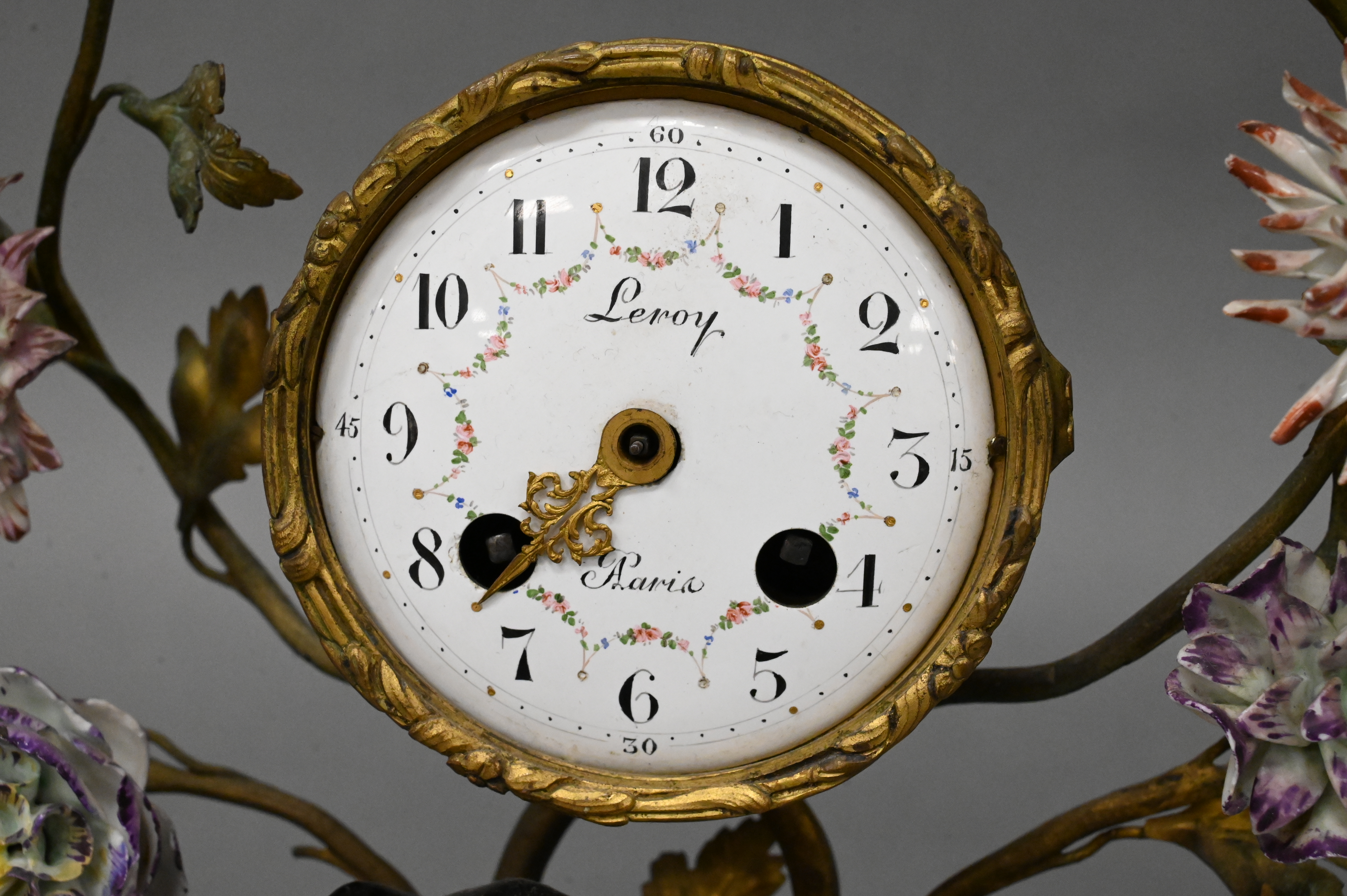 presents well, clock missing hour hand, several chips to flowers, metal repainted, repair to figure, repair to tree of boy candelabra, dog foot with crack to clock piece, clock face with chipping, no face glass and sits loose