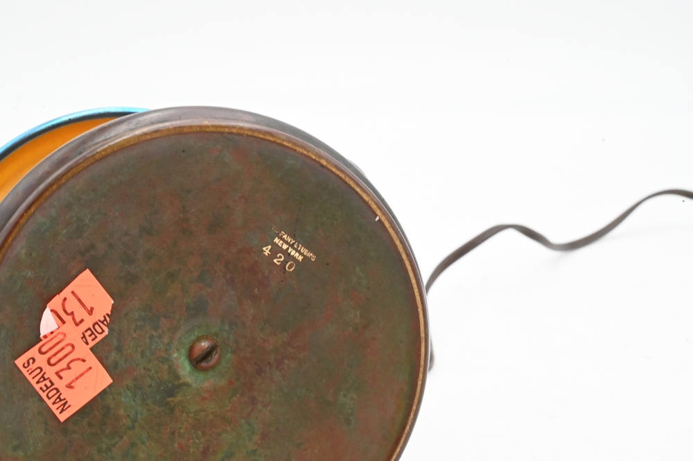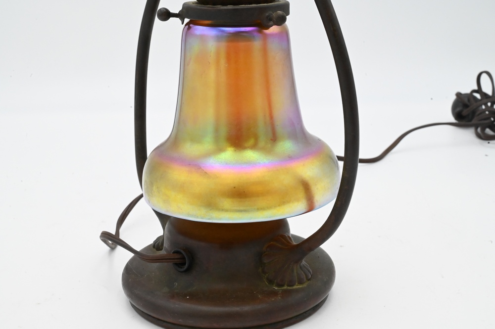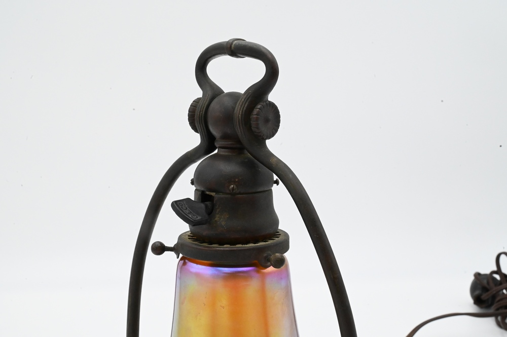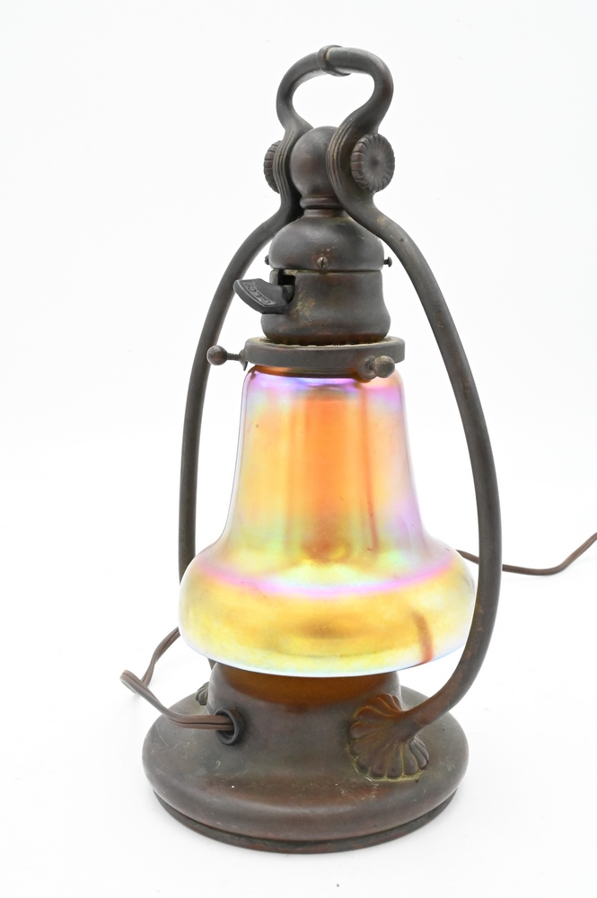 Tiffany Desk Lamp, bronze harp or bell form with art glass shade, marked Tiffany Studios New York 420, height 11 inches.
